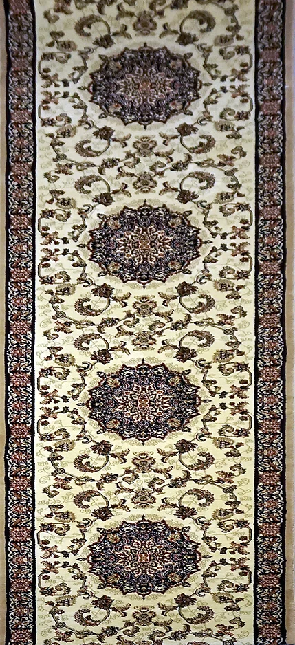 Dywanowy chodnik w tradycyjnym stylu, zdobiony roślinnym wzorem w odcieniach kremowych. Posiada miękkie, odporne na ścieranie runo i jest wykonany z termicznie utwardzonej przędzy, co zapewnia trwałość i łatwość pielęgnacji