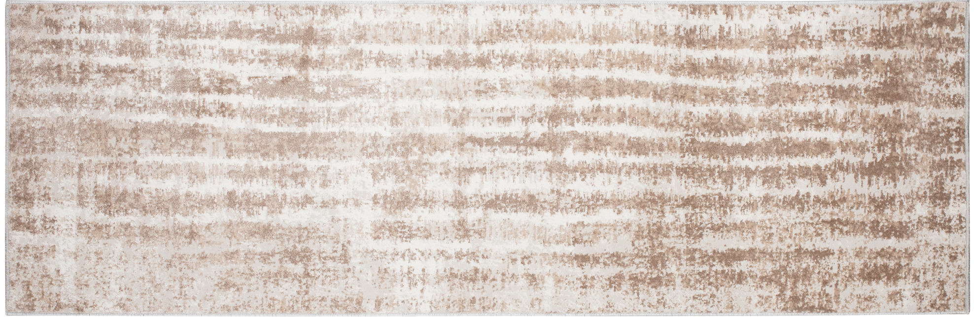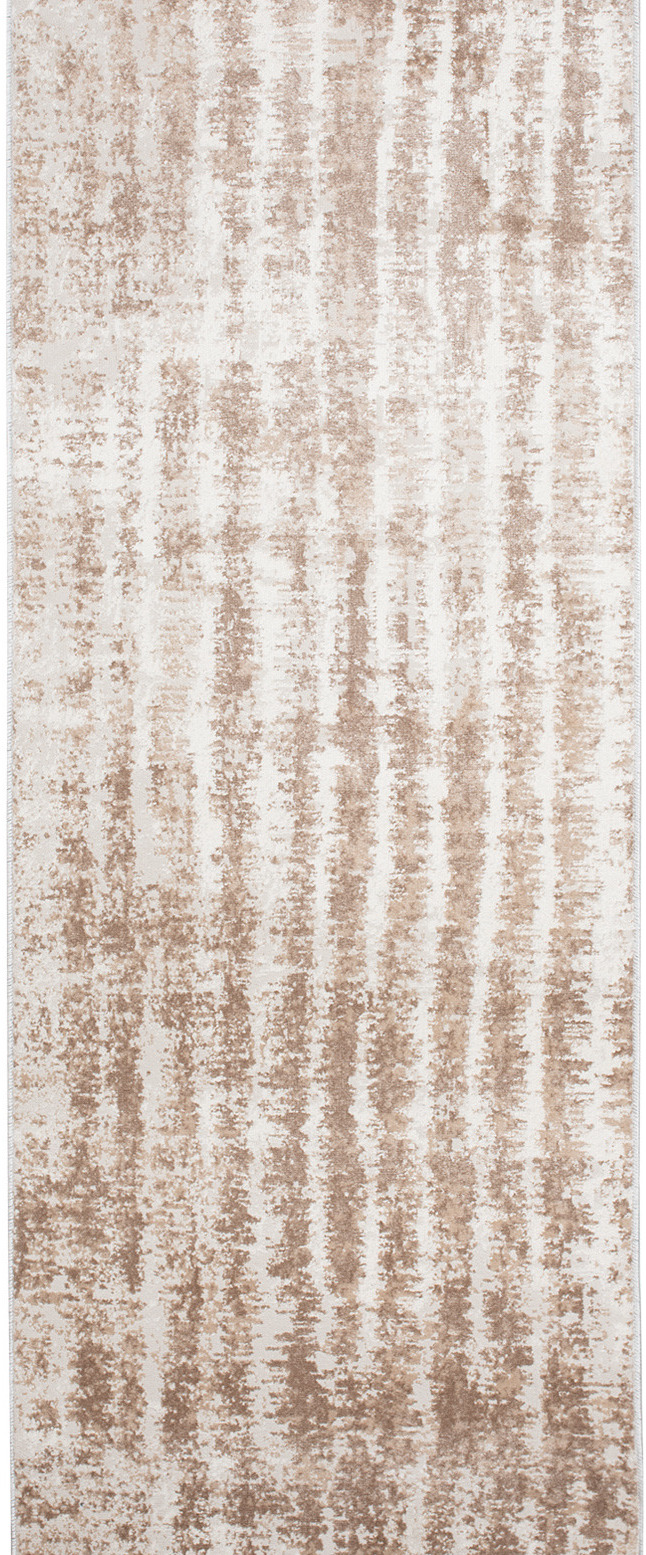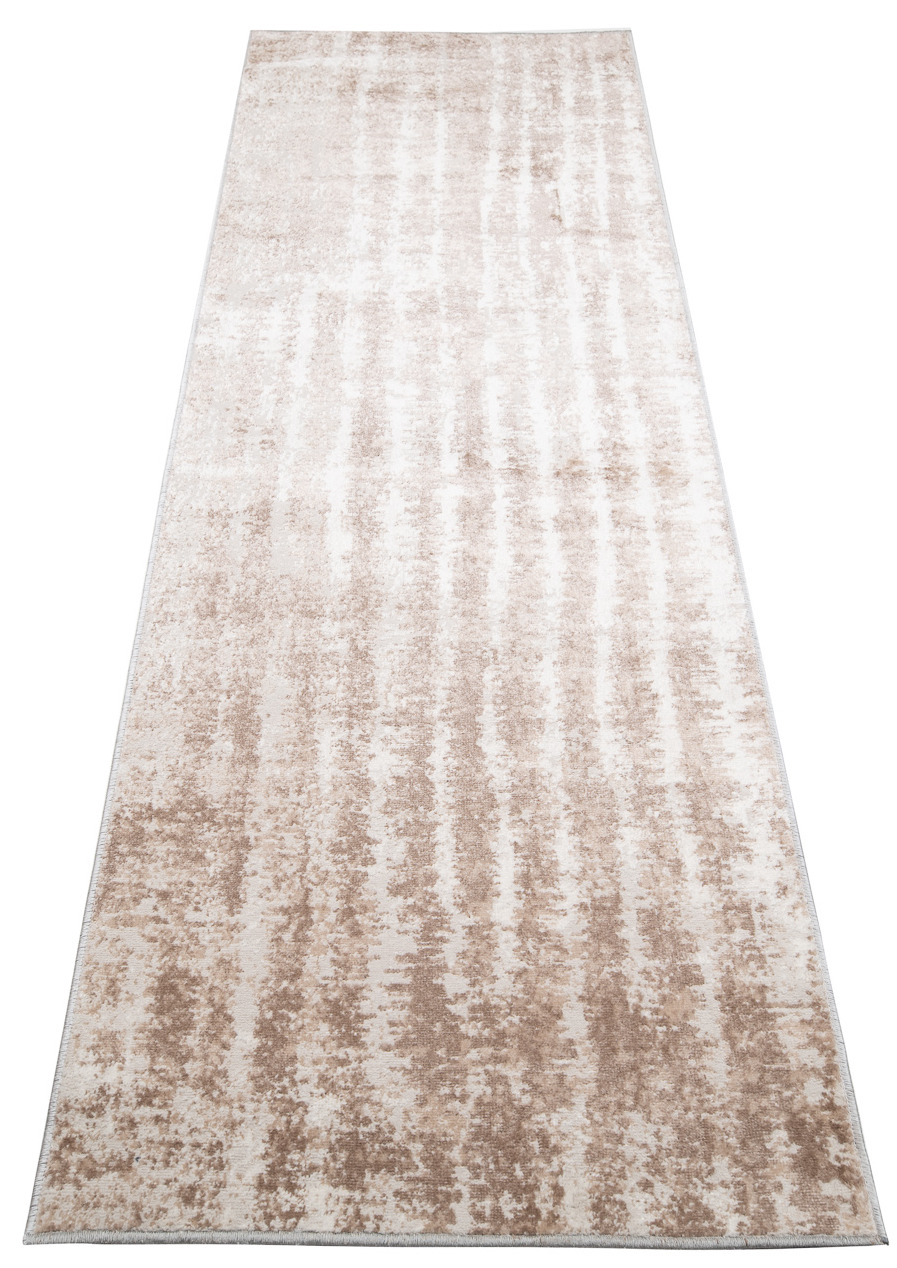 Chodnik krótkowłosy wykonany z wysokiej jakości włókien syntetycznych. Utrzymany w kremowo-beżowej tonacji z subtelnym, przetartym wzorem w szerokie prążki w odcieniach jasnego brązu i piasku. Chodnik jest elegancki, trwały i łatwy w utrzymaniu czystości.