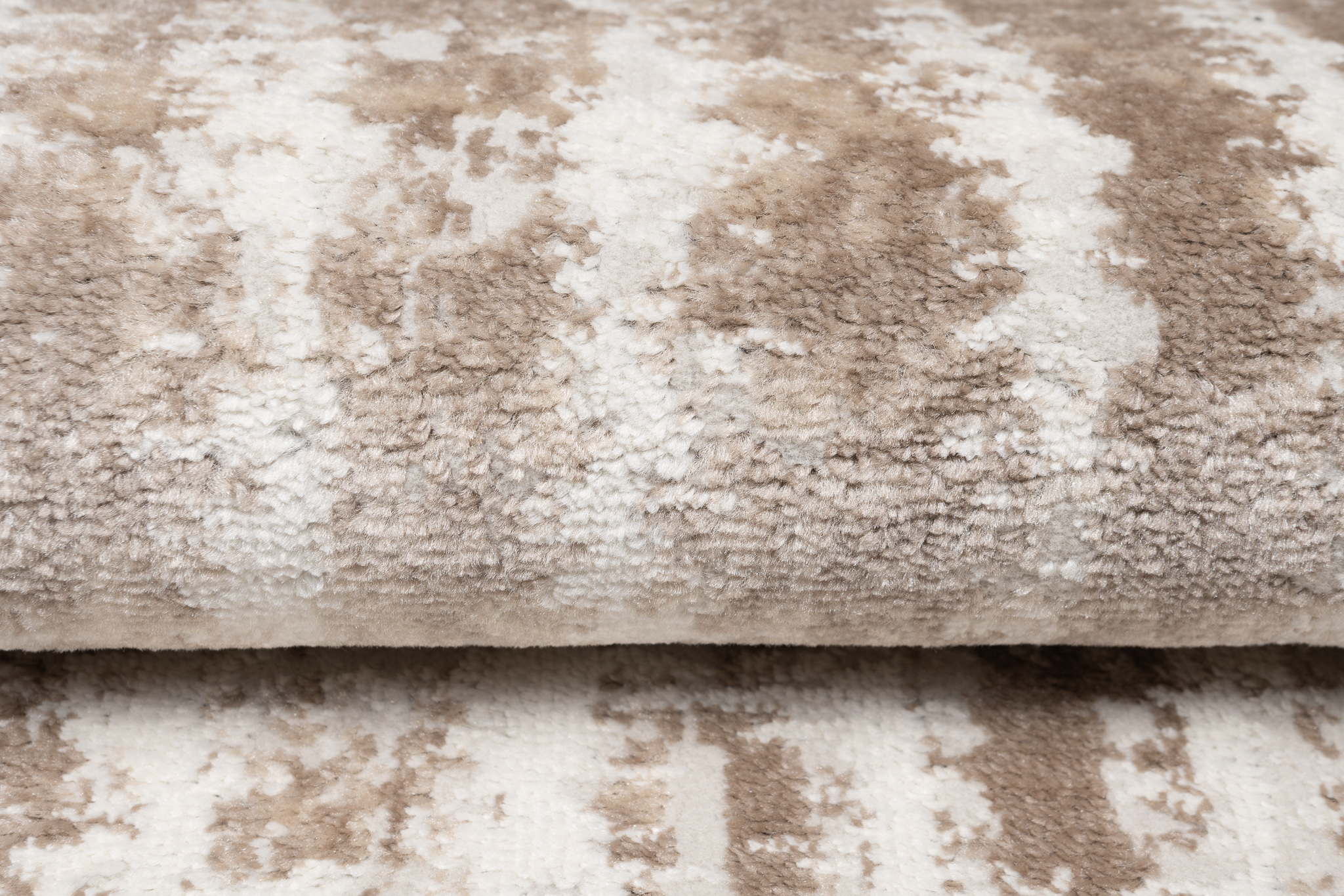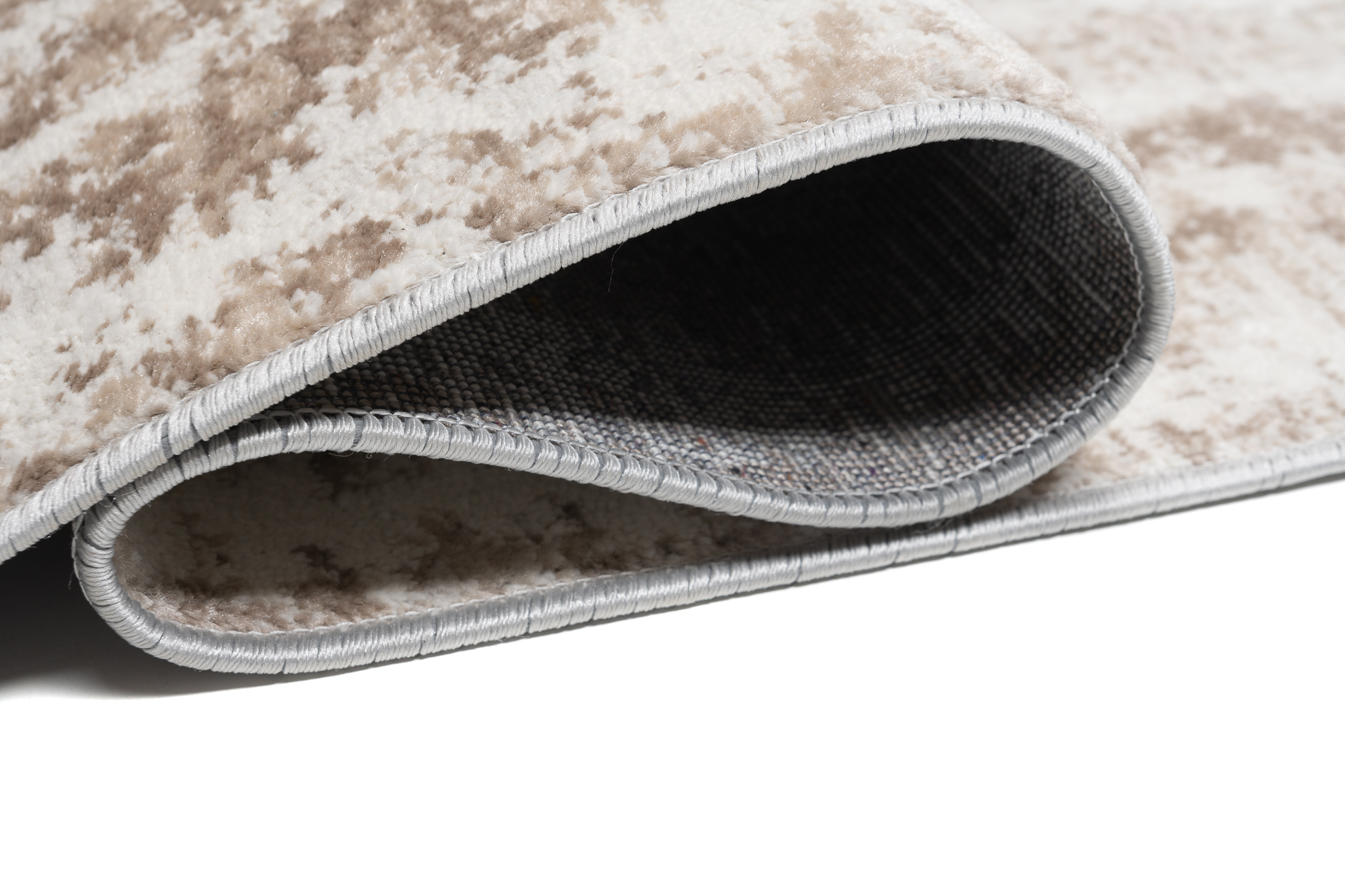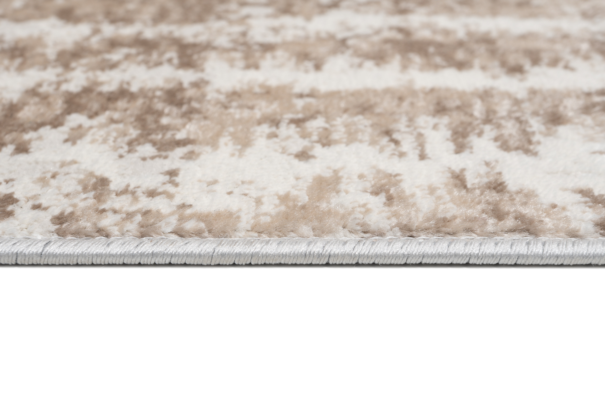 Chodnik krótkowłosy wykonany z wysokiej jakości włókien syntetycznych. Utrzymany w kremowo-beżowej tonacji z subtelnym, przetartym wzorem w szerokie prążki w odcieniach jasnego brązu i piasku. Chodnik jest elegancki, trwały i łatwy w utrzymaniu czystości.