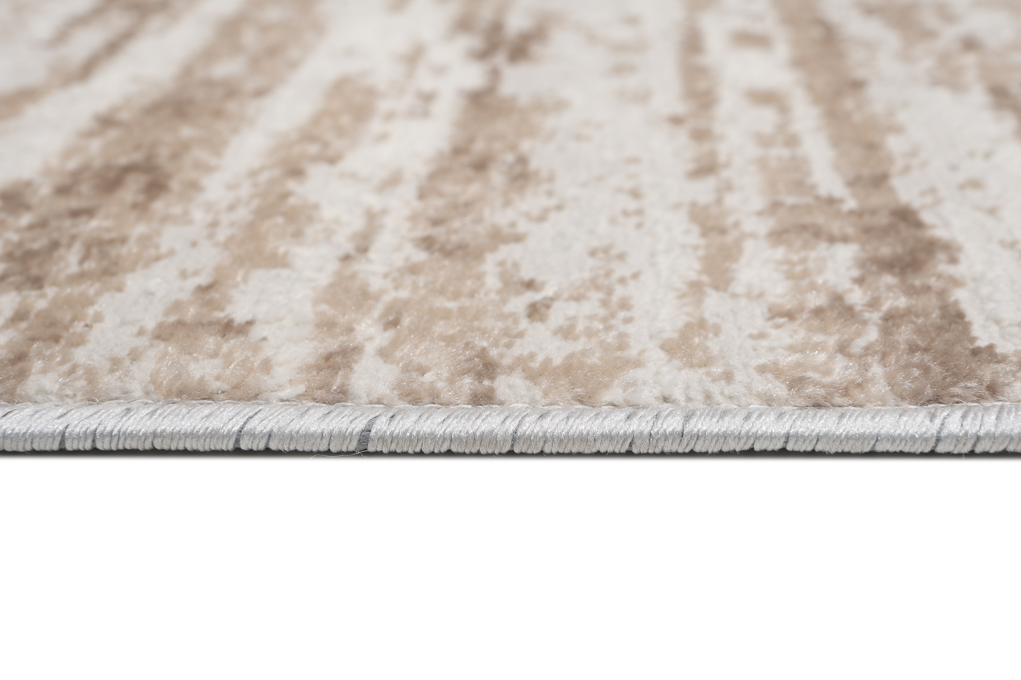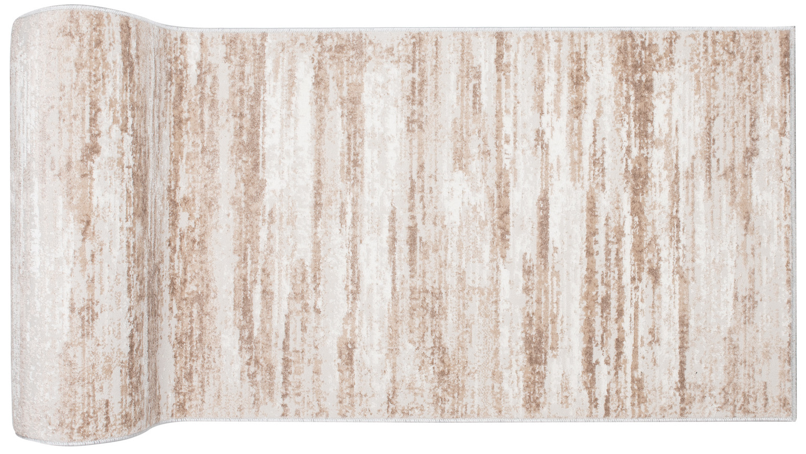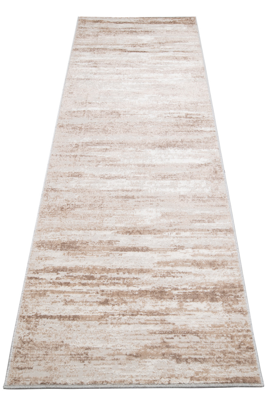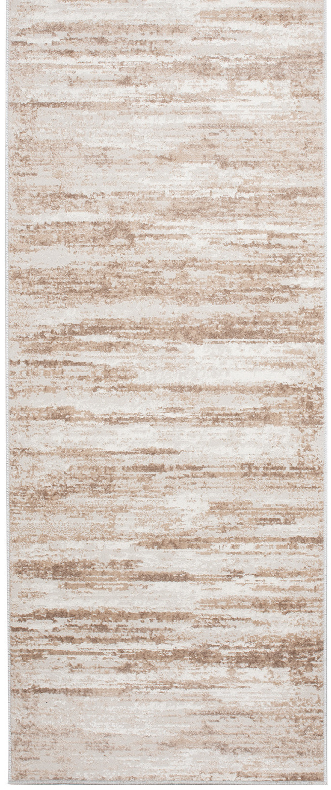 Chodnik krótkowłosy wykonany z wysokiej jakości włókien syntetycznych. Utrzymany w kremowo-brązowej tonacji z subtelnym, przetartym wzorem w poziome prążki w odcieniach jasnego brązu i piasku. Chodnik jest elegancki, trwały i łatwy w utrzymaniu czystości.