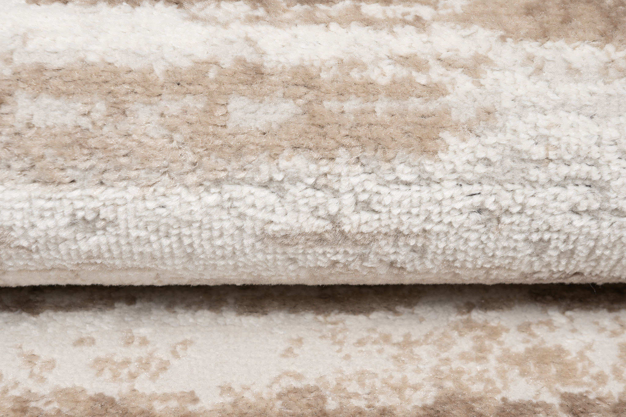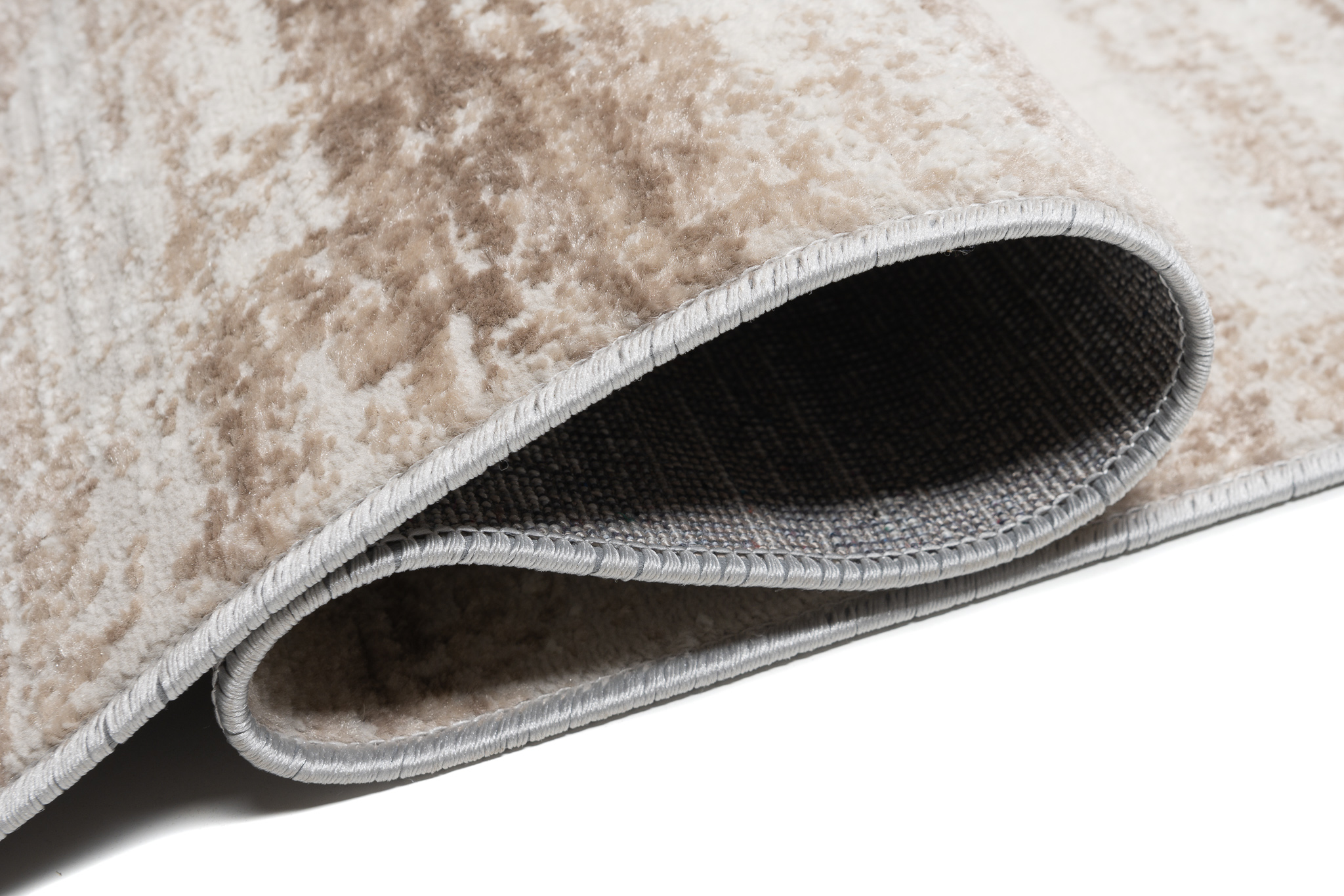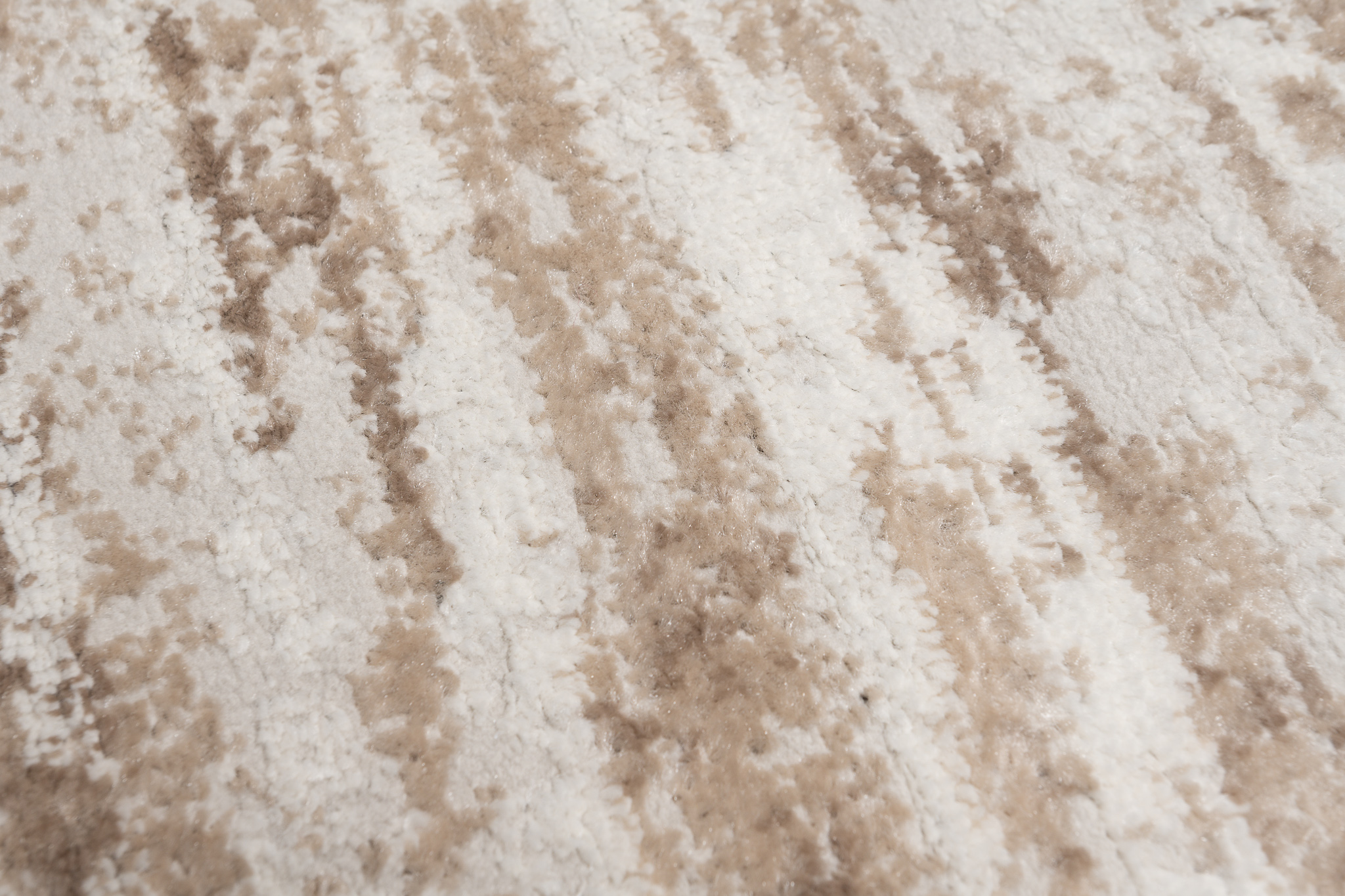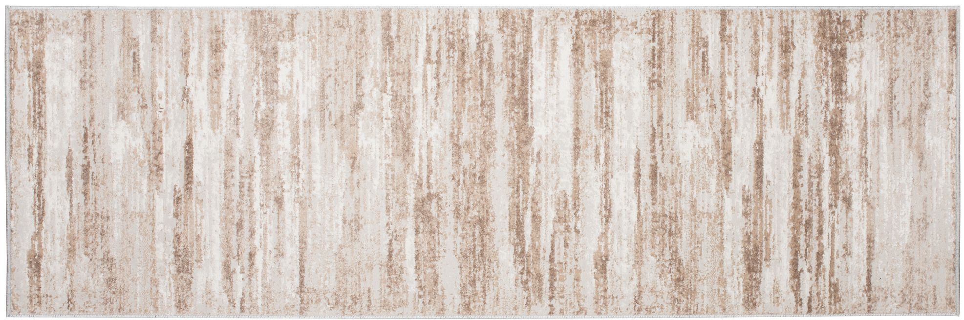 Chodnik krótkowłosy wykonany z wysokiej jakości włókien syntetycznych. Utrzymany w kremowo-brązowej tonacji z subtelnym, przetartym wzorem w poziome prążki w odcieniach jasnego brązu i piasku. Chodnik jest elegancki, trwały i łatwy w utrzymaniu czystości.