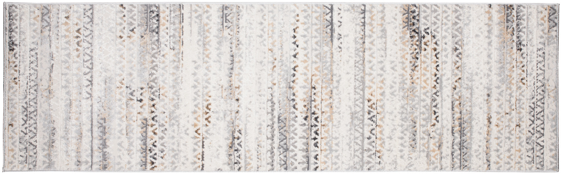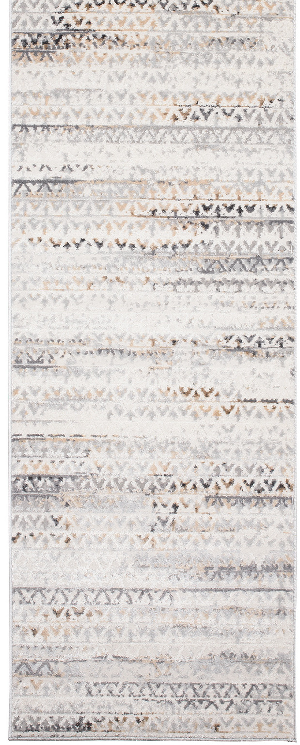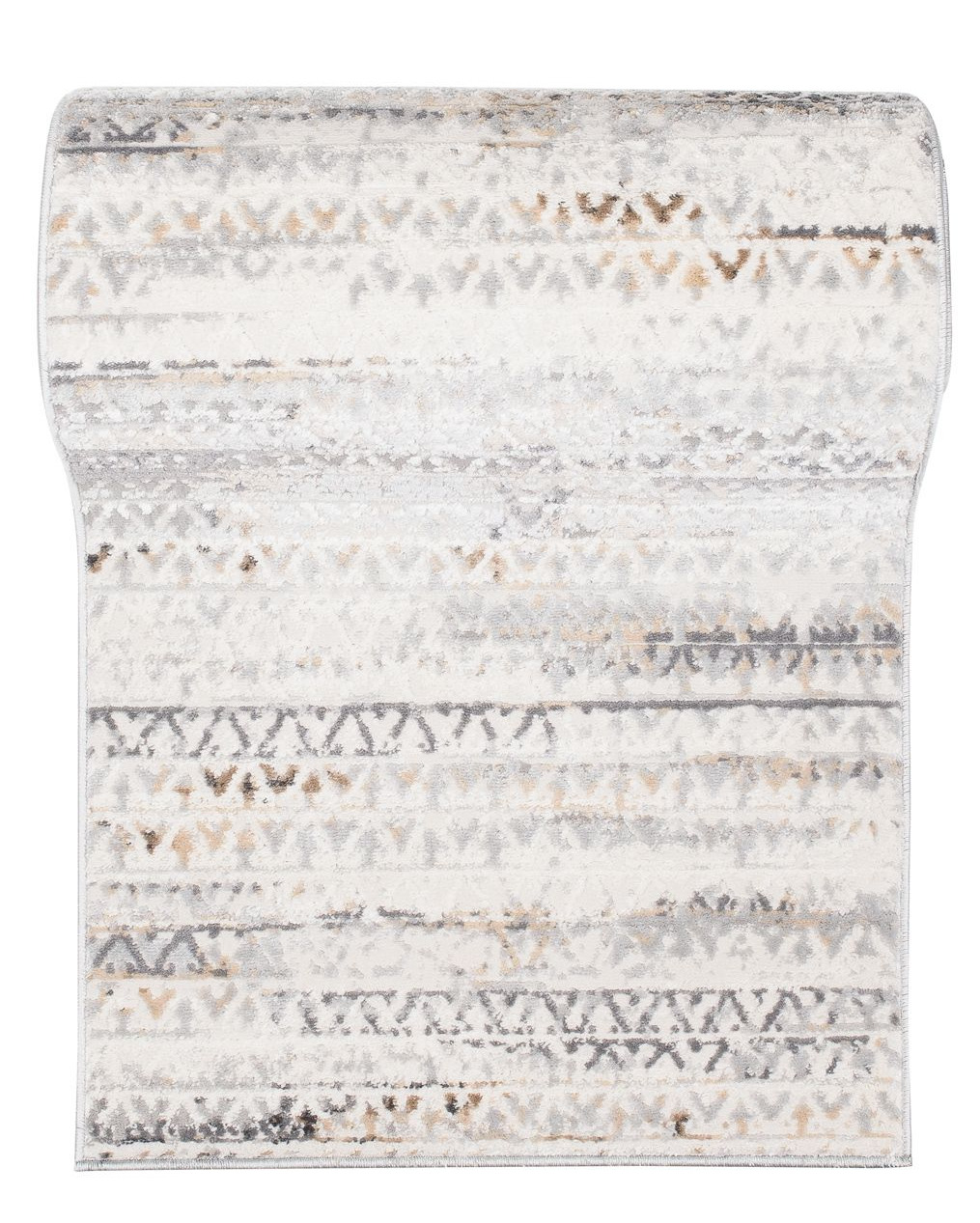 Chodnik krótkowłosy wykonany z wysokiej jakości włókien syntetycznych. Zdobiony poziomymi pasami z drobnymi geometrycznymi motywami w kremowej tonacji z akcentami beżu. Nowoczesny, lekko przecierany wzór nadaje mu wyjątkowy charakter w stylu vintage.