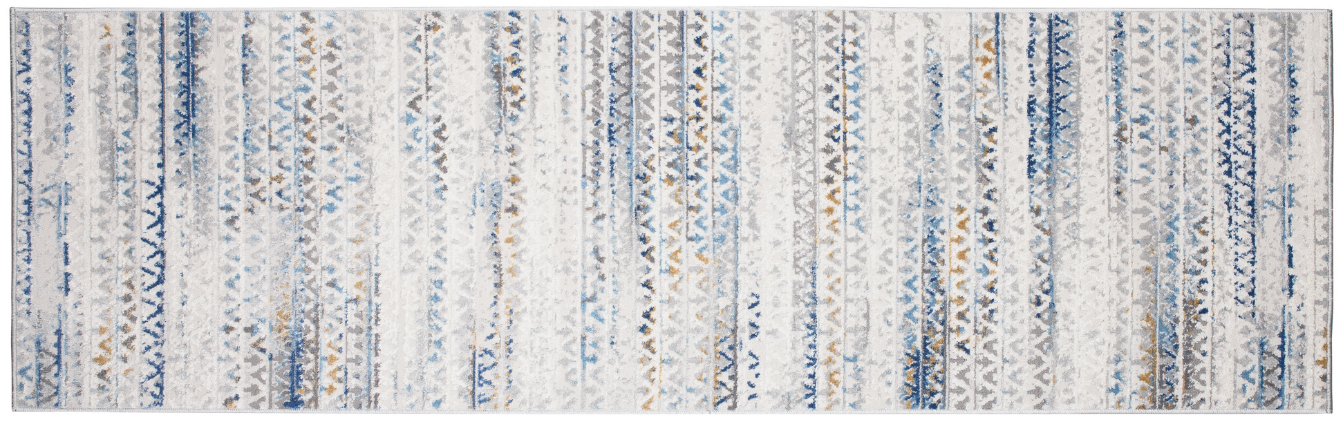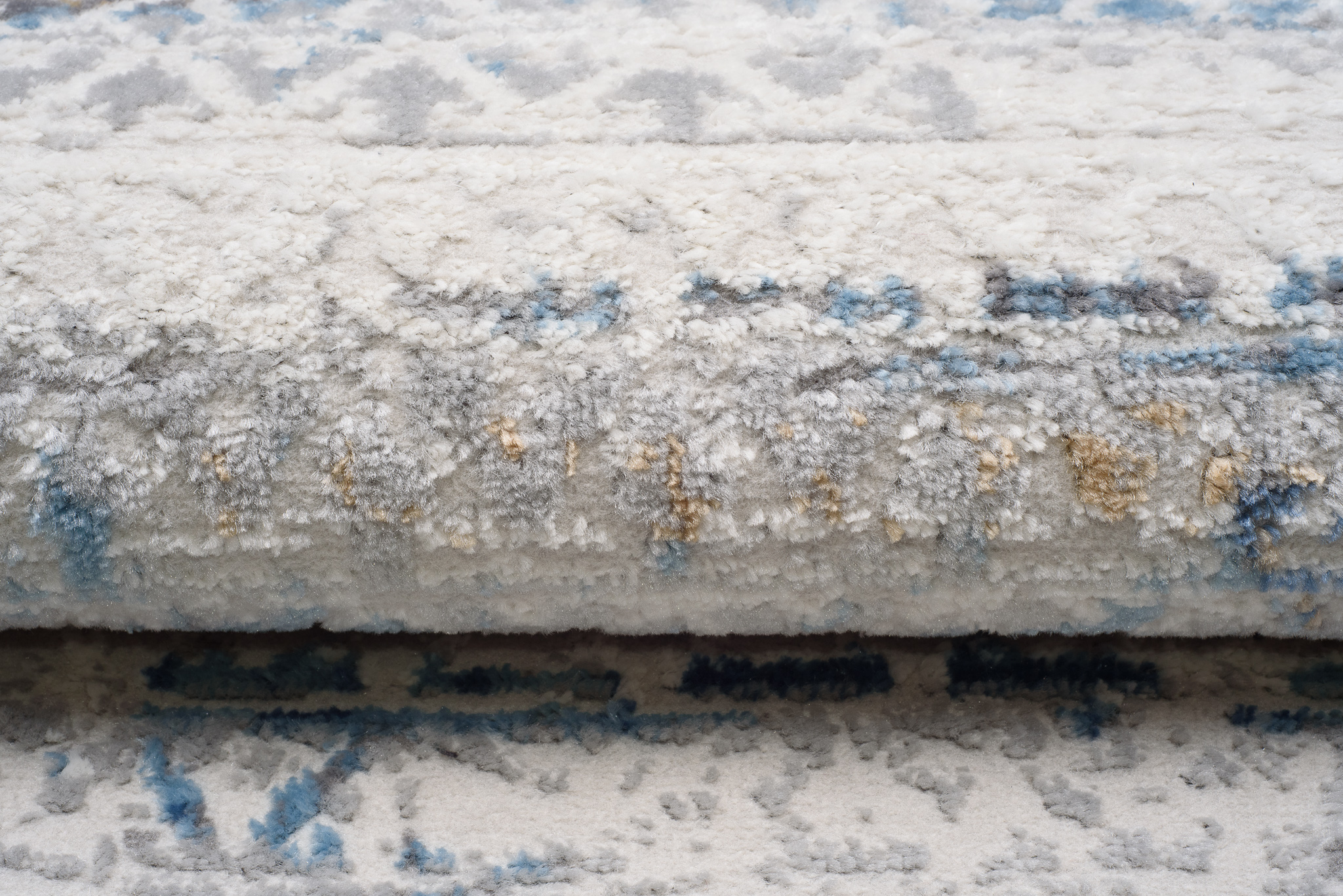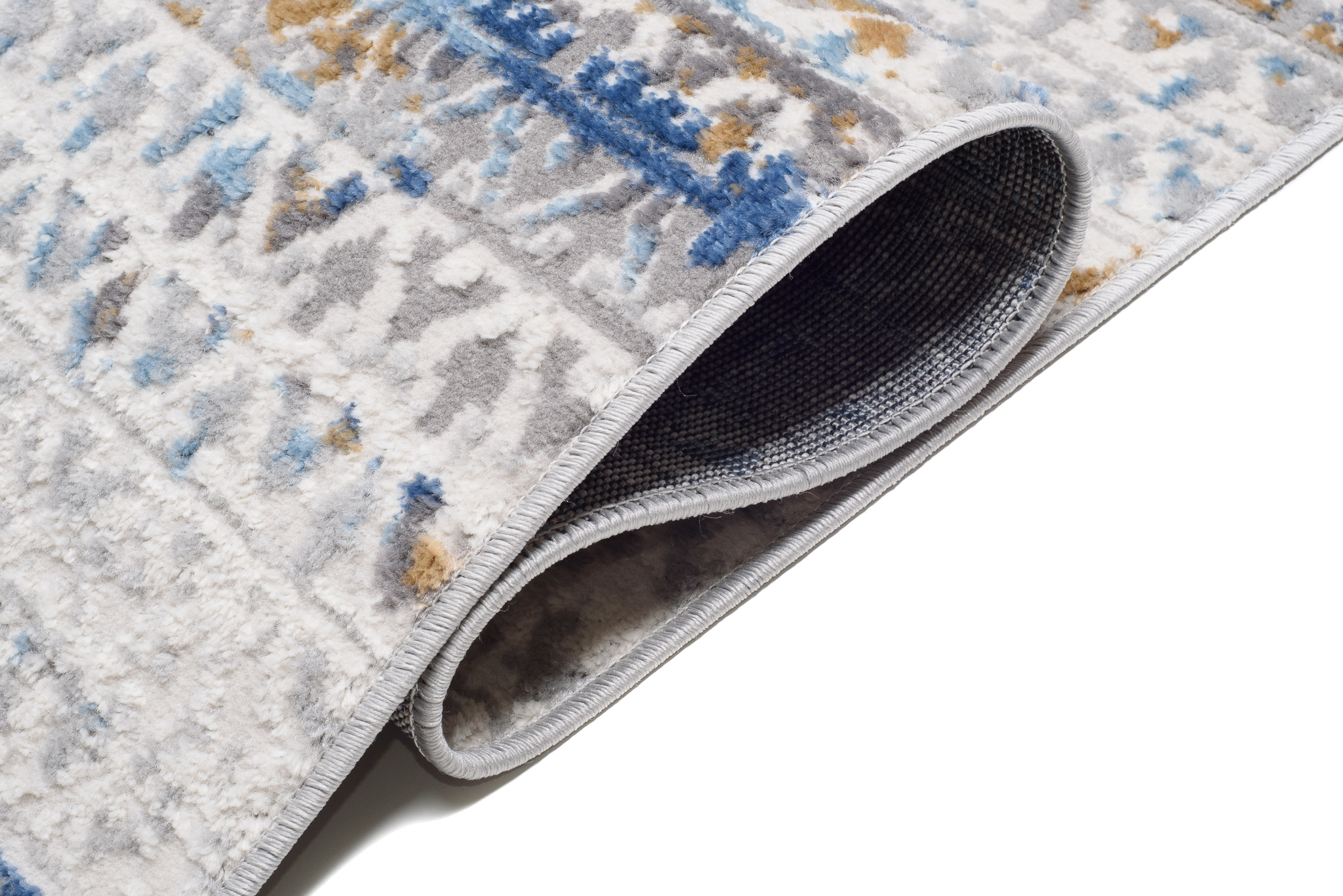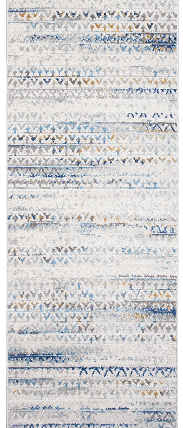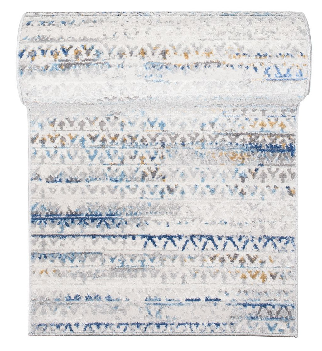 Chodnik krótkowłosy wykonany z wysokiej jakości włókien syntetycznych. Zdobiony poziomymi pasami z drobnymi geometrycznymi motywami w kremowej tonacji z akcentami niebieskiego i brązu. Nowoczesny, lekko przecierany wzór nadaje mu wyjątkowy charakter w stylu vintage.