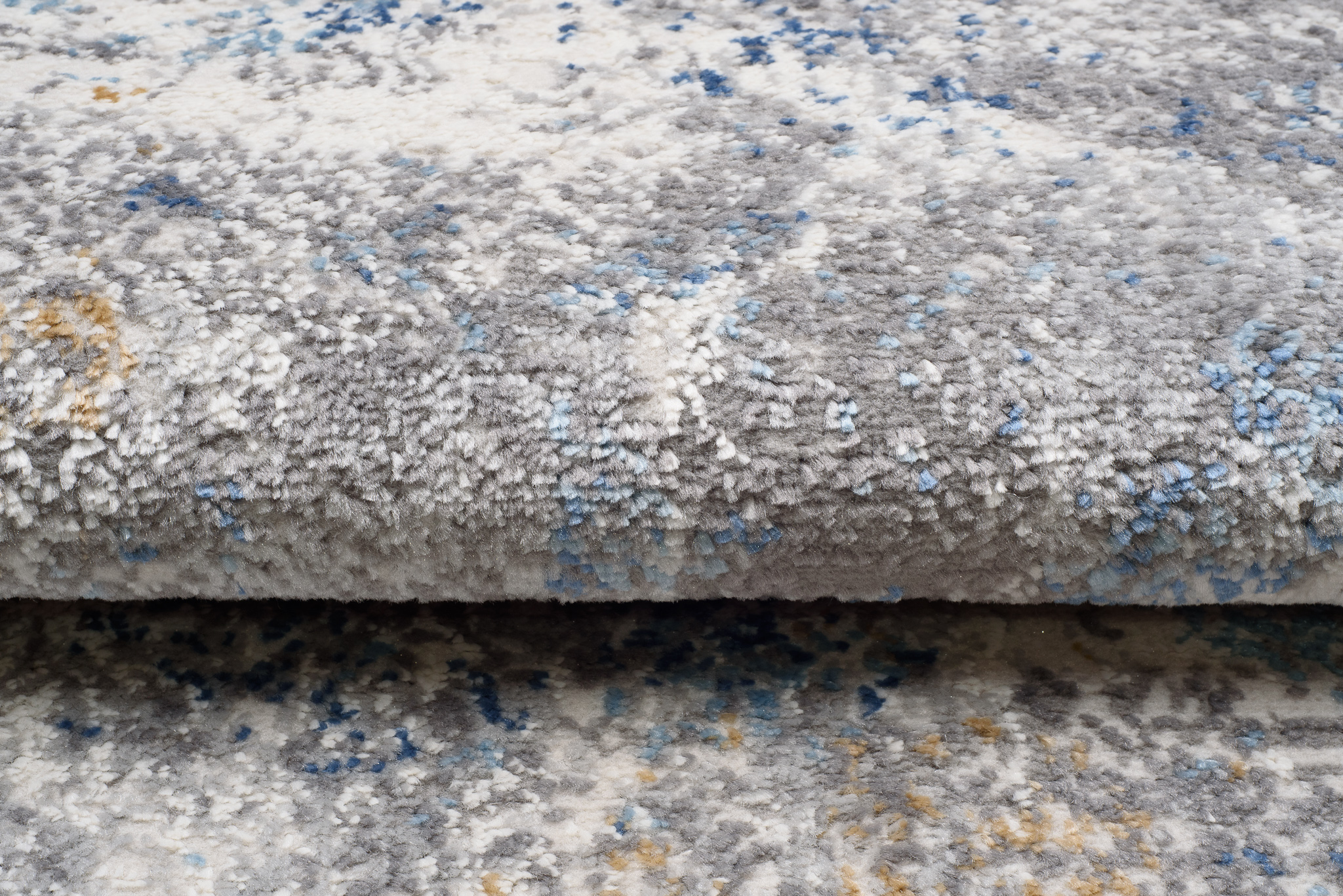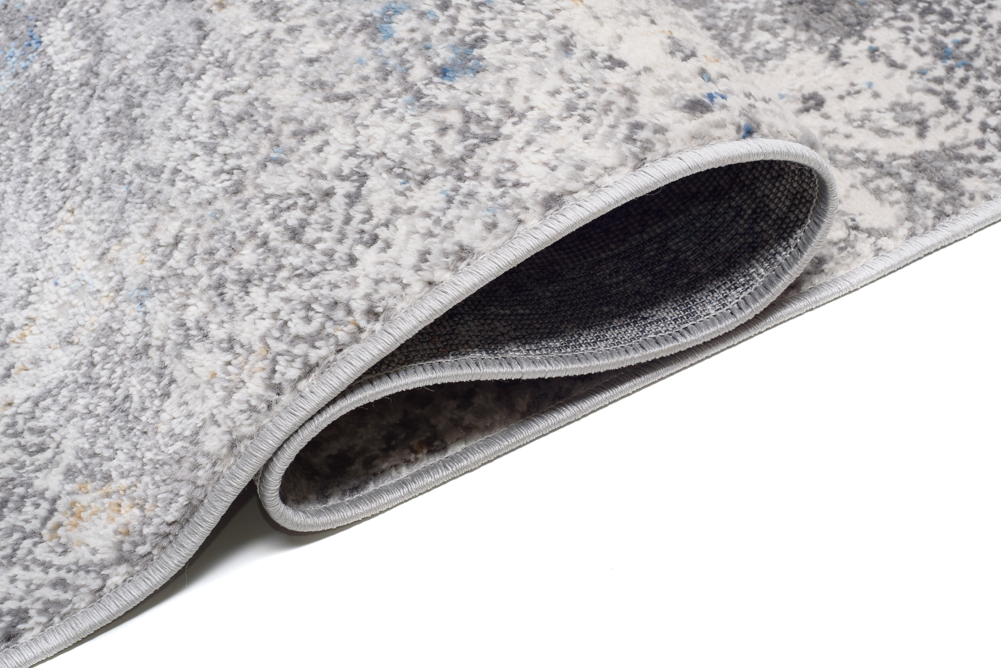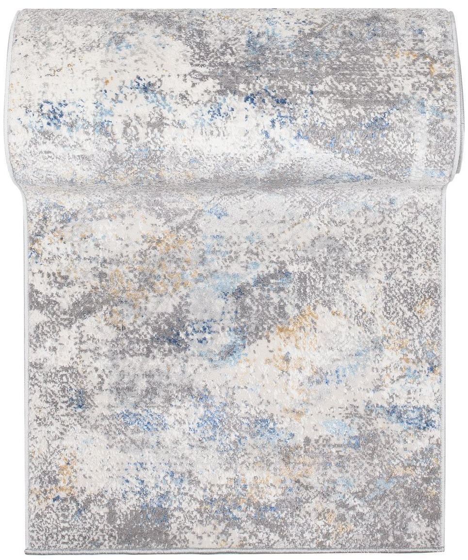 Chodnik krótkowłosy wykonany z wysokiej jakości włókien syntetycznych. Wzór chodnika jest nieregularny i lekko przecierany, z subtelnymi geometrycznymi motywami w tle. Utrzymany w odcieniach beżu, szarości i niebieskiego, tworzy harmonijną kompozycję o delikatnym, nowoczesnym charakterze. Chodnik jest elegancki, trwały i łatwy w utrzymaniu czystości.
