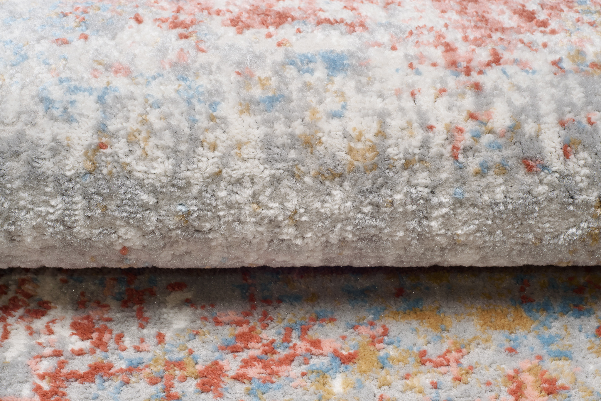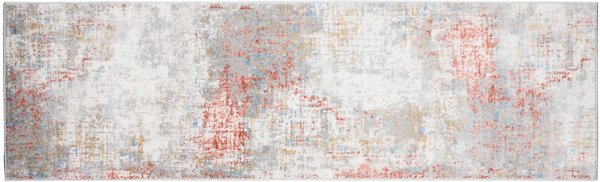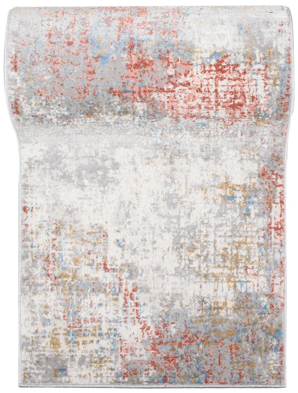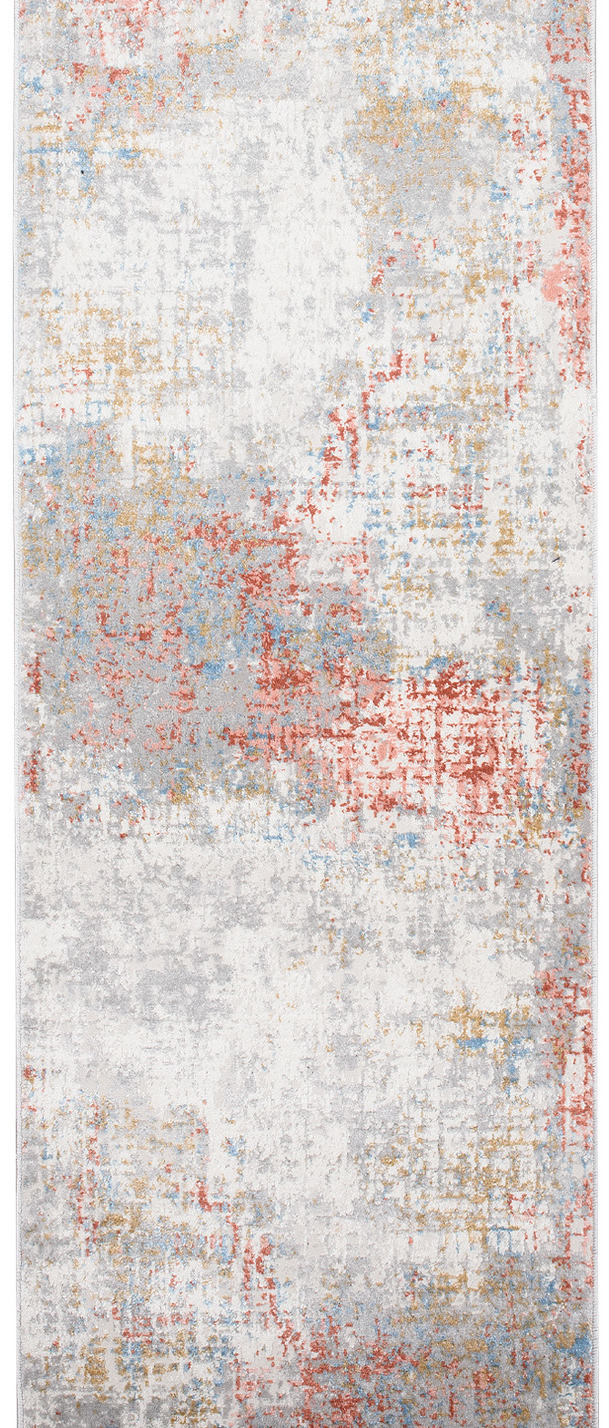 Chodnik krótkowłosy wykonany z wysokiej jakości włókien syntetycznych. Utrzymany w szaro-kremowo-pomarańczowej tonacji z subtelnym, przetartym wzorem. Chodnik jest elegancki, trwały i łatwy w utrzymaniu czystości.