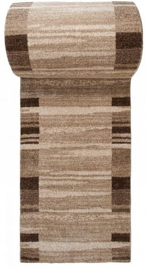 Beżowy chodnik wyróżniający się gęstym runem, wykonany z uszlachetnionego termicznie miękkiego włókna syntetycznego, które w dotyku przypomina wełnę. Posiada wysoką odporność na ścieranie i jest łatwy do utrzymania w czystości. Chodnik ten ma nowoczesny wzór z pasiastym środkiem i cieniowanymi brzegami.