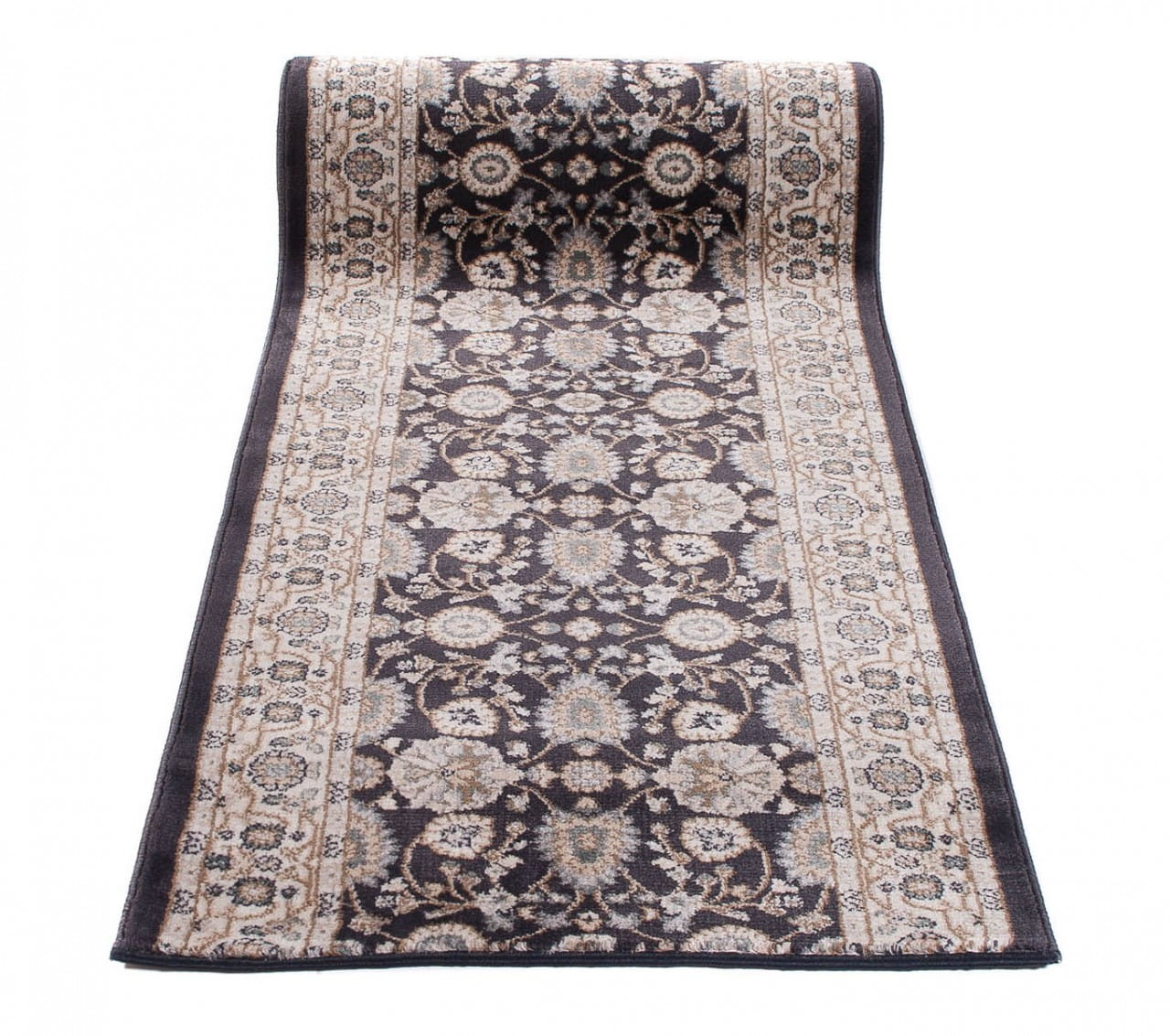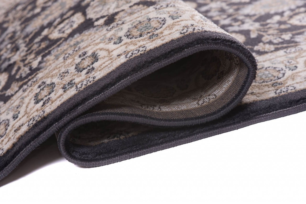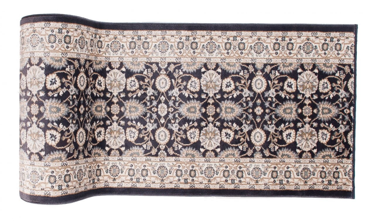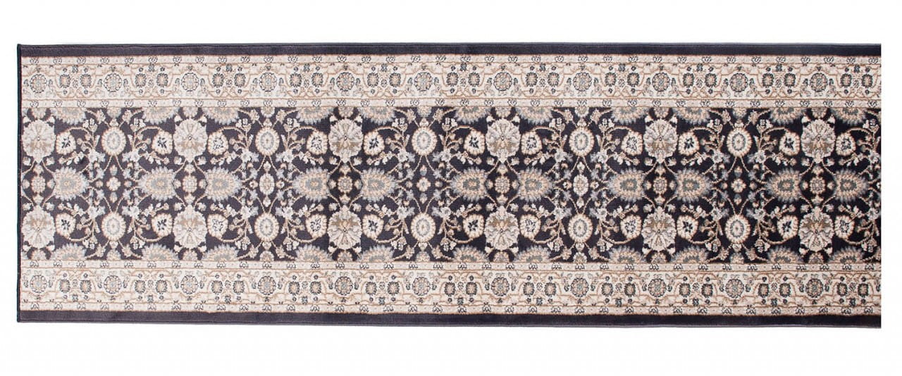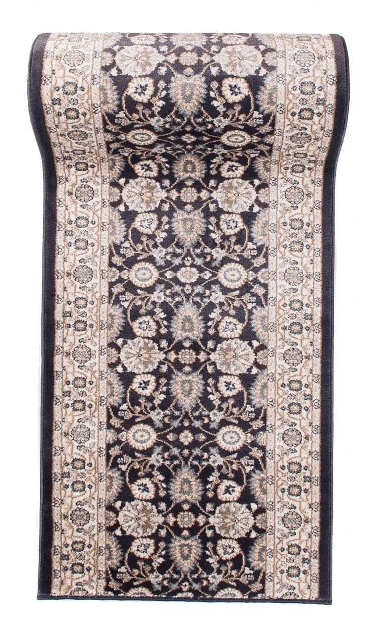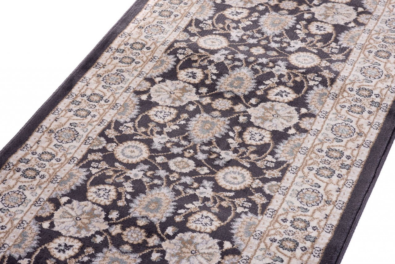 Chodnik w kolorze antracytowym, z bogato zdobionym ornamentowym wzorem w stylu perskich kobierców. Wykonany jest z trwałej i odpornej na ścieranie przędzy syntetycznej, która imituje wełnę. Jest miękki, przyjemny w dotyku, a jednocześnie trwały i łatwy w czyszczeniu.