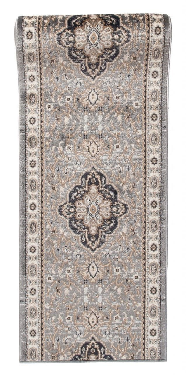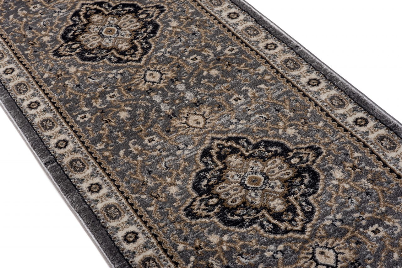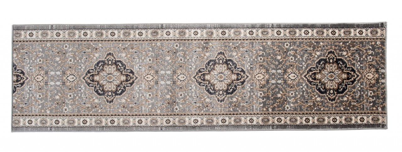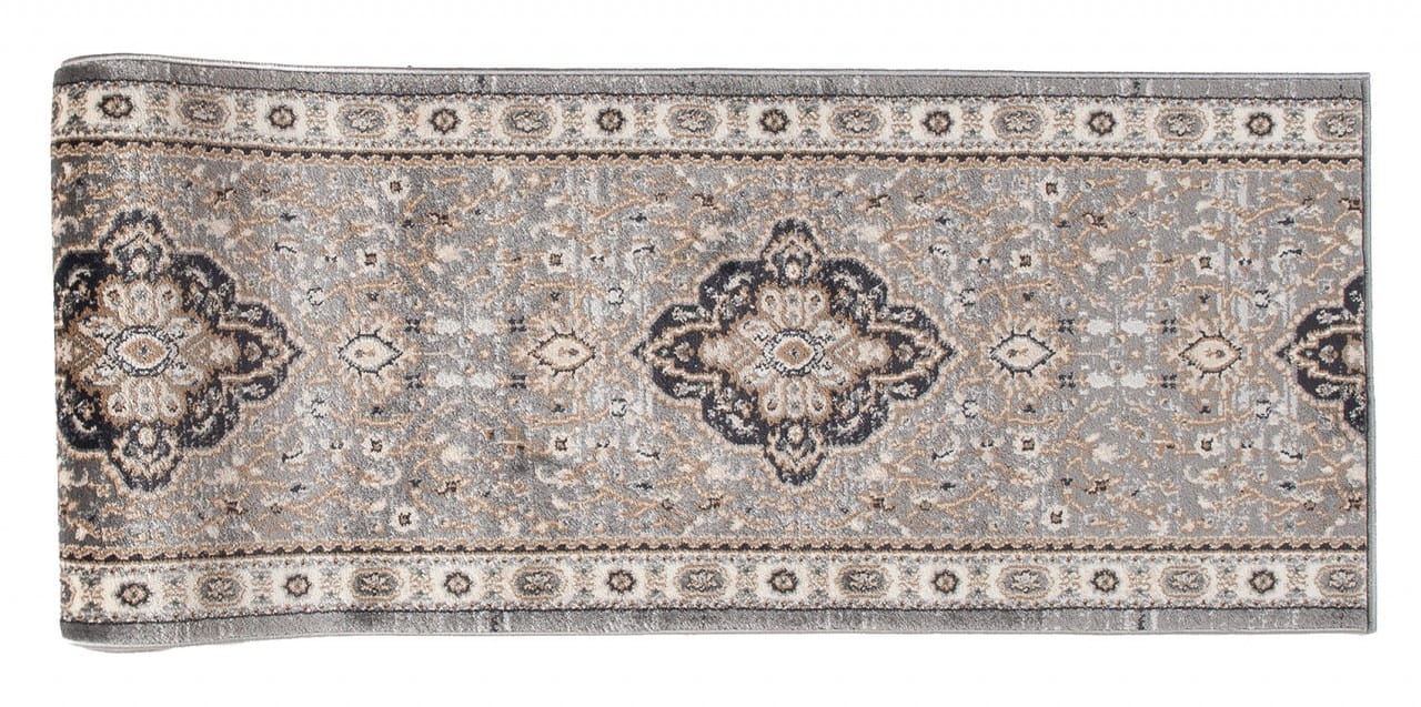Chodnik w kolorze szaro-beżowym, z bogato zdobionym ornamentowym wzorem w stylu perskich kobierców. Wykonany jest z trwałej i odpornej na ścieranie przędzy syntetycznej, która imituje wełnę. Jest miękki, przyjemny w dotyku, a jednocześnie trwały i łatwy w czyszczeniu.