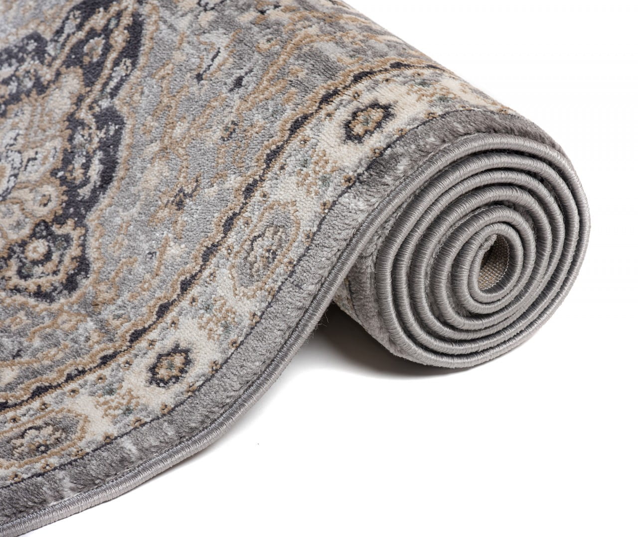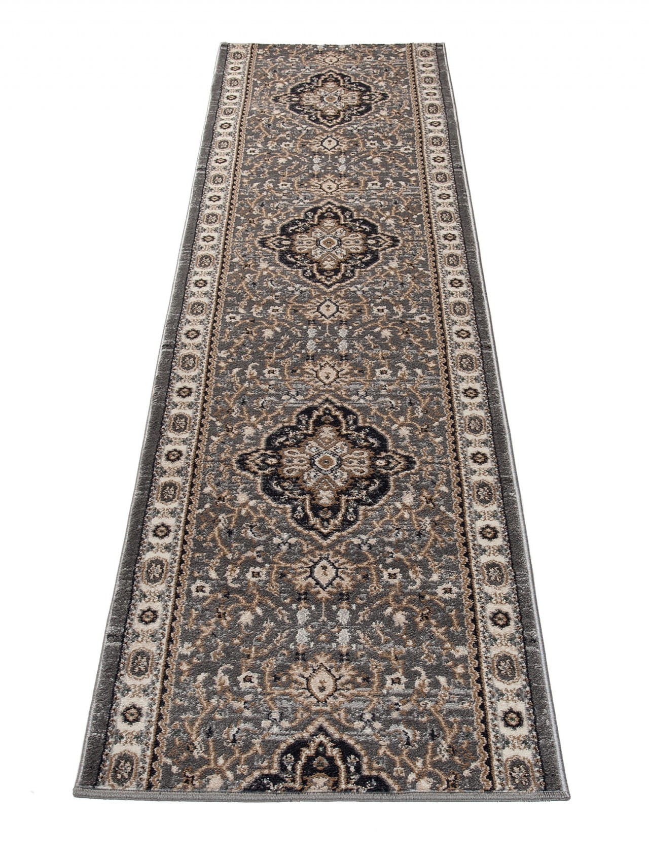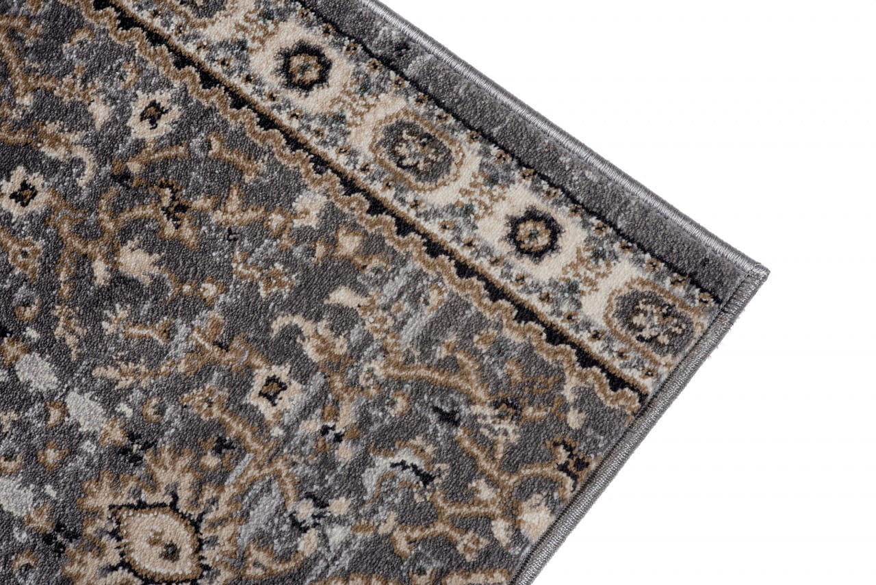 Chodnik w kolorze szaro-beżowym, z bogato zdobionym ornamentowym wzorem w stylu perskich kobierców. Wykonany jest z trwałej i odpornej na ścieranie przędzy syntetycznej, która imituje wełnę. Jest miękki, przyjemny w dotyku, a jednocześnie trwały i łatwy w czyszczeniu.