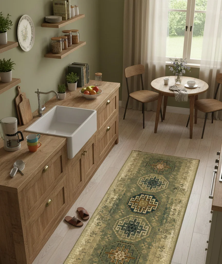 Chodnik w eleganckiej kolorystyce z dominacją zieleni, z charakterystycznym wzorem Ashan, inspirowanym bogatą tradycją sztuki perskiej i azjatyckiej, z precyzyjnymi geometrycznymi motywami. Wyjątkowa trwałość materiału oraz właściwości termoizolacyjne sprawiają, że jest to praktyczny i stylowy wybór do przedpokoju czy korytarza. Dzięki zastosowaniu wysokiej jakości wełny chodnik jest miękki w dotyku, łatwy w pielęgnacji i odporny na zabrudzenia.