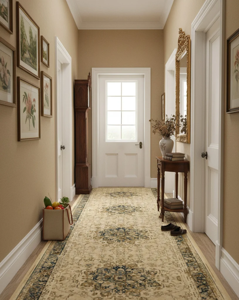 Elegancki chodnik dywanowy wykonany z naturalnej wełny o ciepłym, piaskowym odcieniu z akcentami zieleni. Wzór Kordoba łączy klasyczny styl z subtelną nowoczesnością, idealnie wpasowując się w różnorodne wnętrza. Wyjątkowa trwałość materiału oraz właściwości termoizolacyjne sprawiają, że jest to praktyczny i stylowy wybór do przedpokoju czy korytarza. Dzięki zastosowaniu wysokiej jakości wełny chodnik jest miękki w dotyku, łatwy w pielęgnacji i odporny na zabrudzenia.