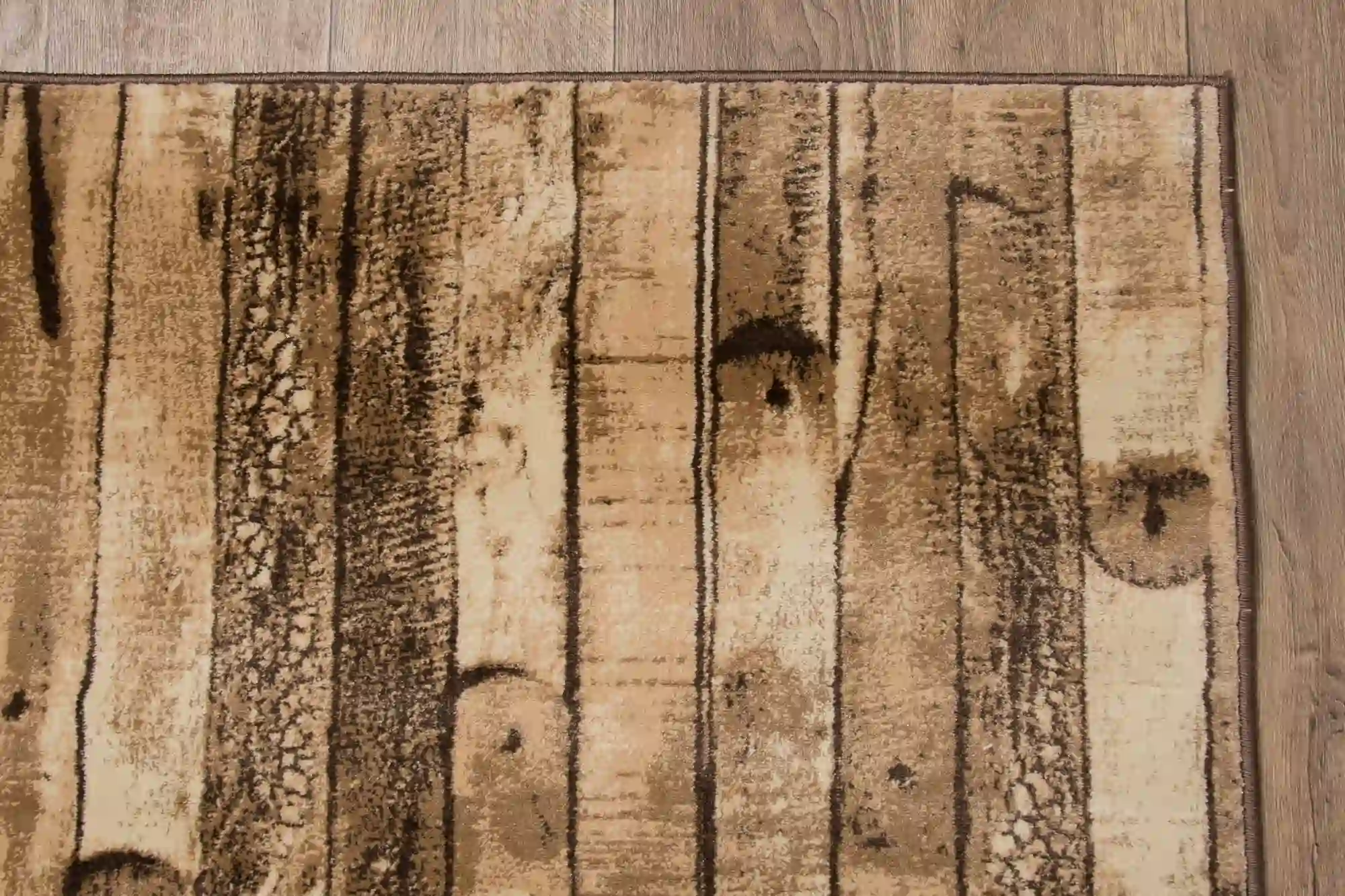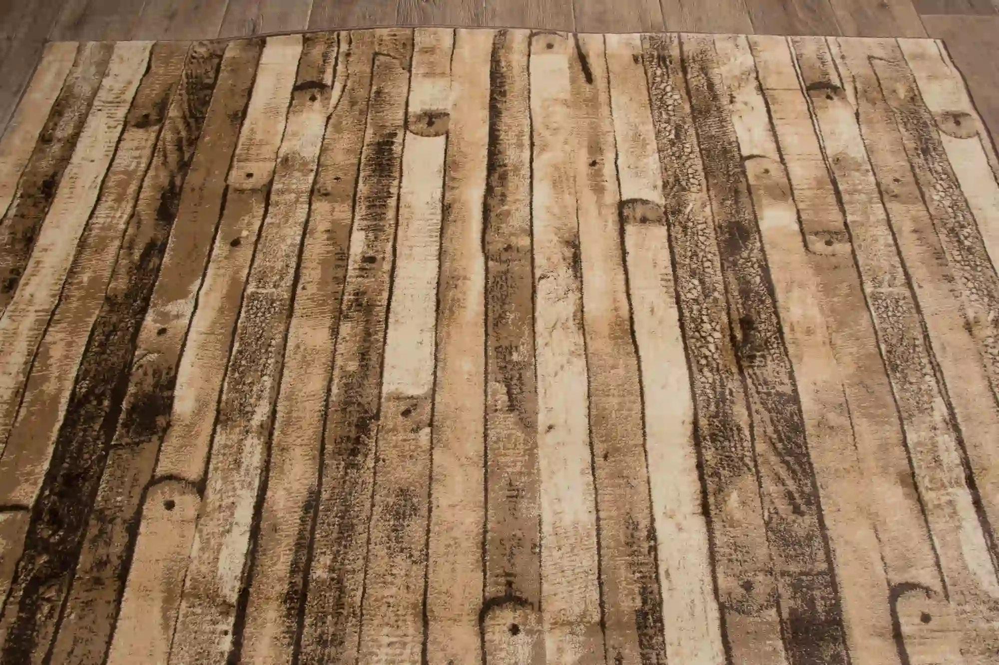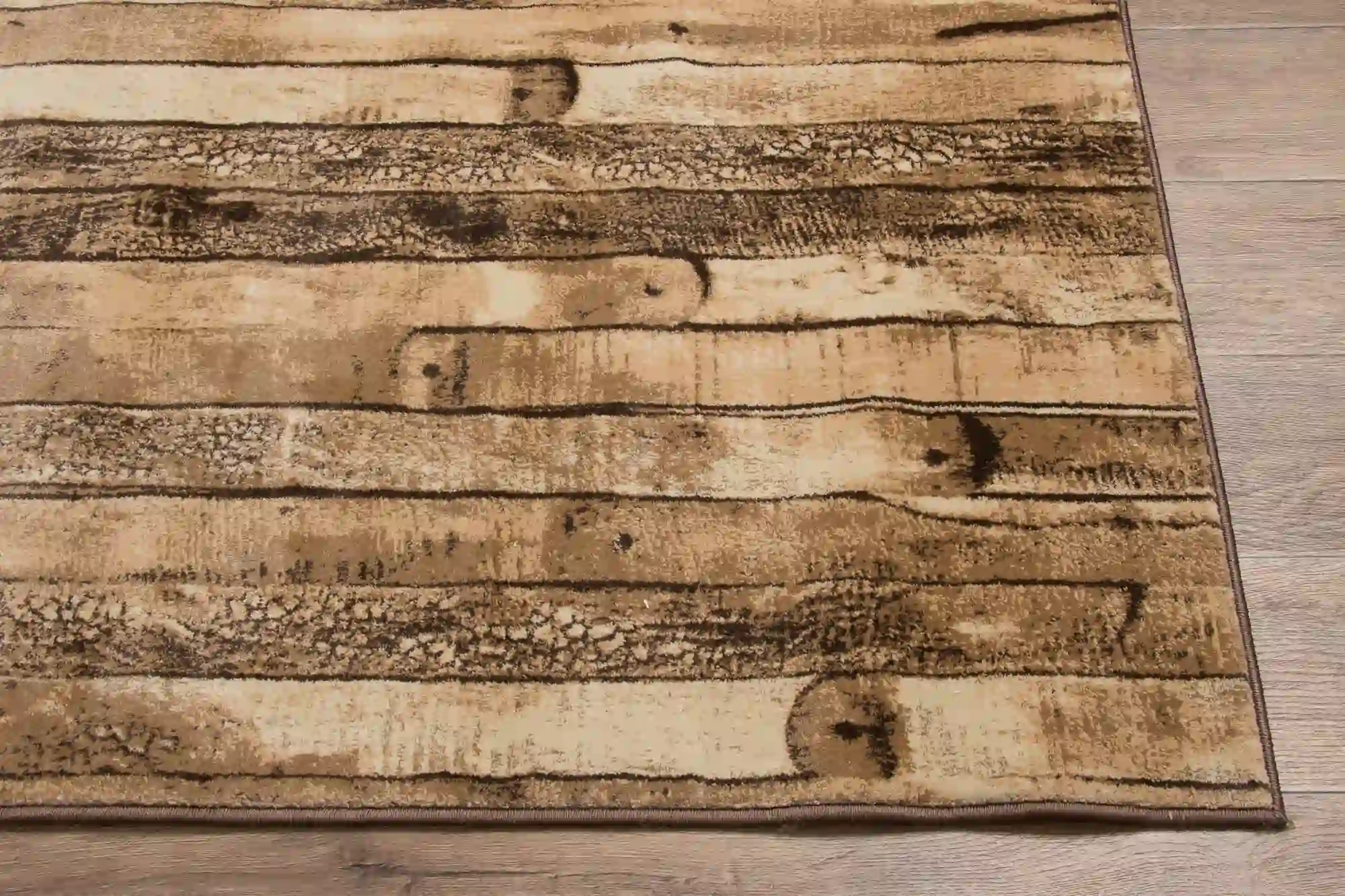 Dywan w odcieniach brązu z wzorem imitującym stare deski to stylowe i praktyczne rozwiązanie do każdego wnętrza. Wykonany z trwałego włókna syntetycznego, charakteryzuje się wysoką odpornością na zużycie oraz łatwością w utrzymaniu czystości.