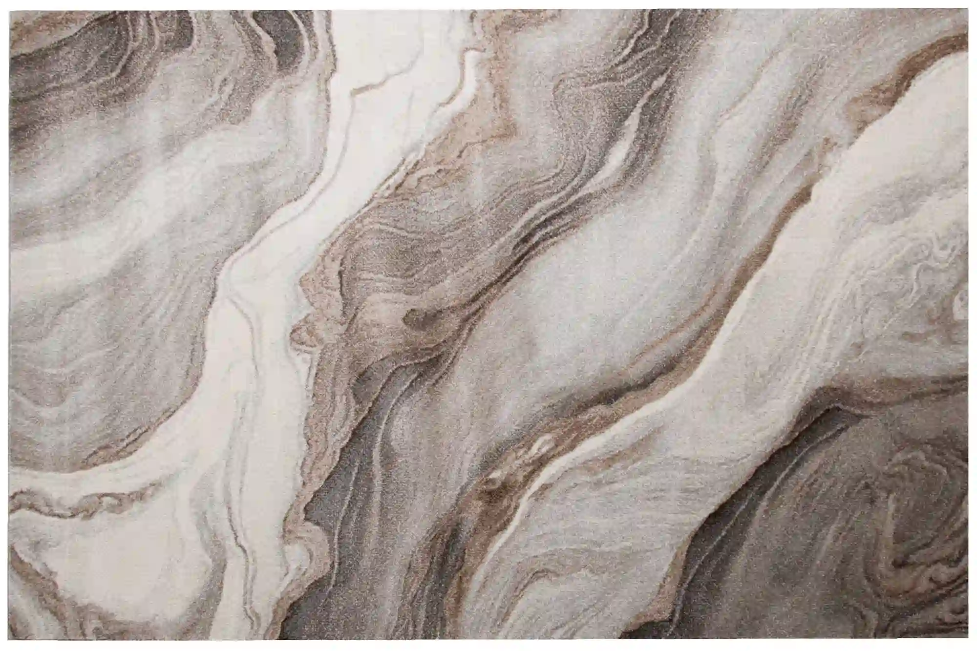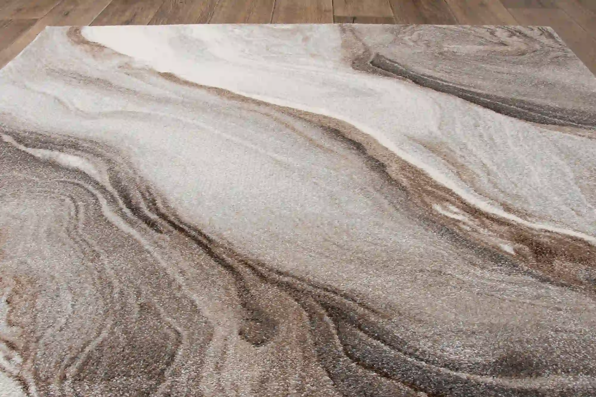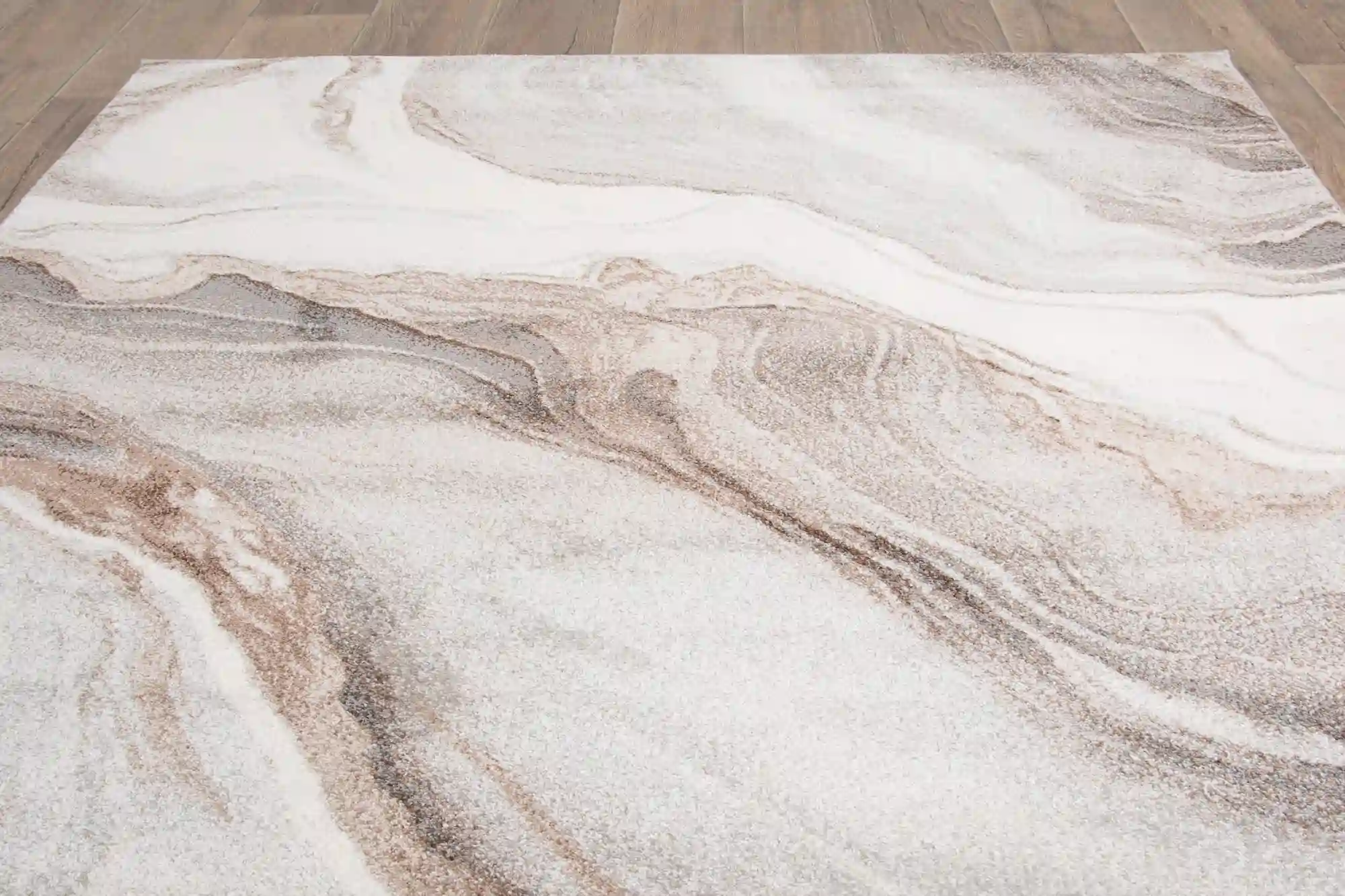 Dywan z nowoczesnym wzorem inspirowanym naturalnym marmurem. Wykonany z trwałego polipropylenu, jest odporny na zabrudzenia i łatwy w utrzymaniu, dzięki czemu stanowi stylowy i praktyczny element wystroju wnętrza.