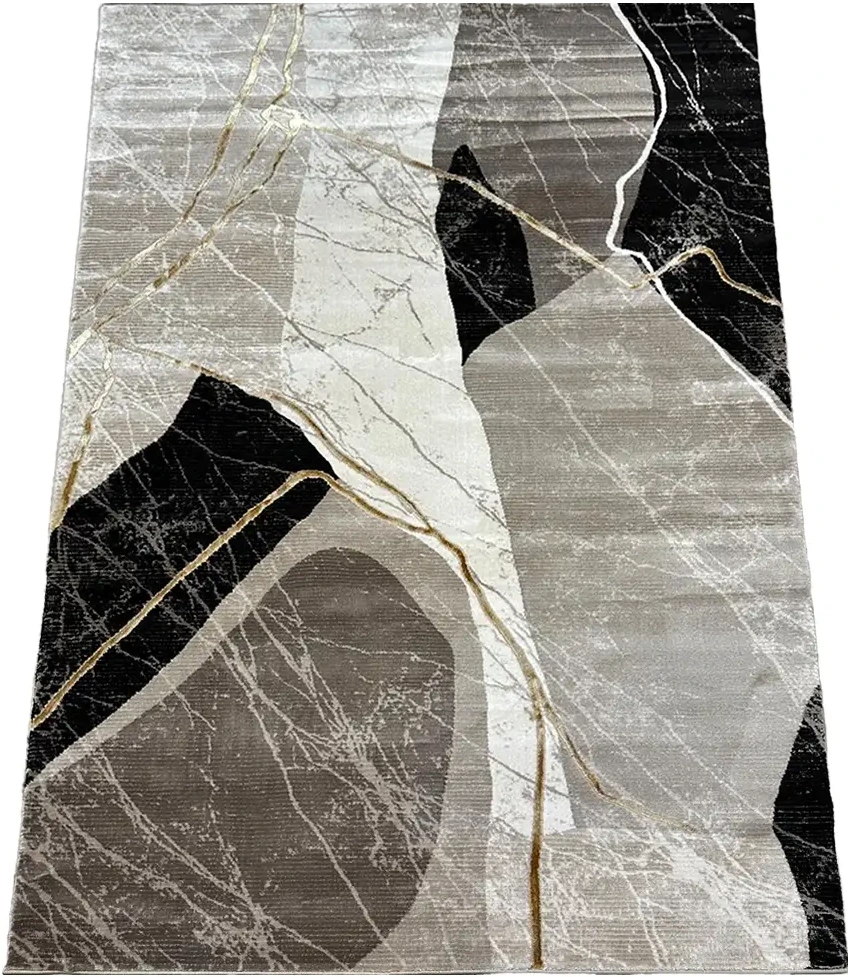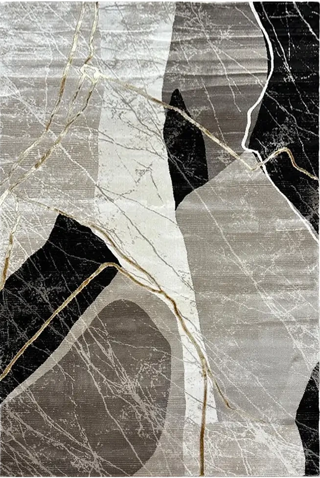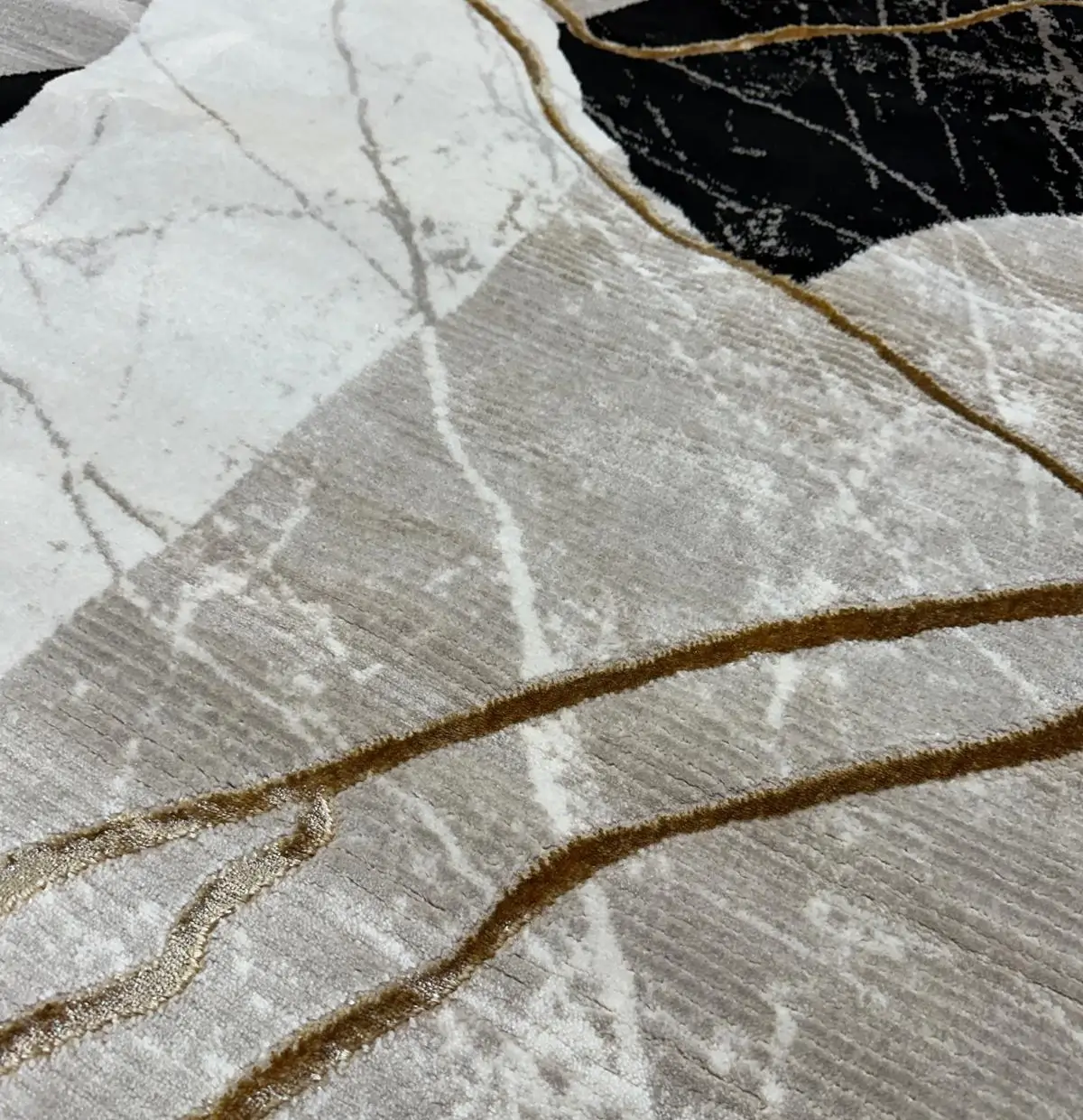 Nowoczesny dywan o miękkim, przyjemnym w dotyku runie z wzorem inspirowanym naturalnym marmurem. Subtelne żyłki przeplatają się z wyrazistym złotym paskiem, nadając całości luksusowego charakteru w stylu art deco.