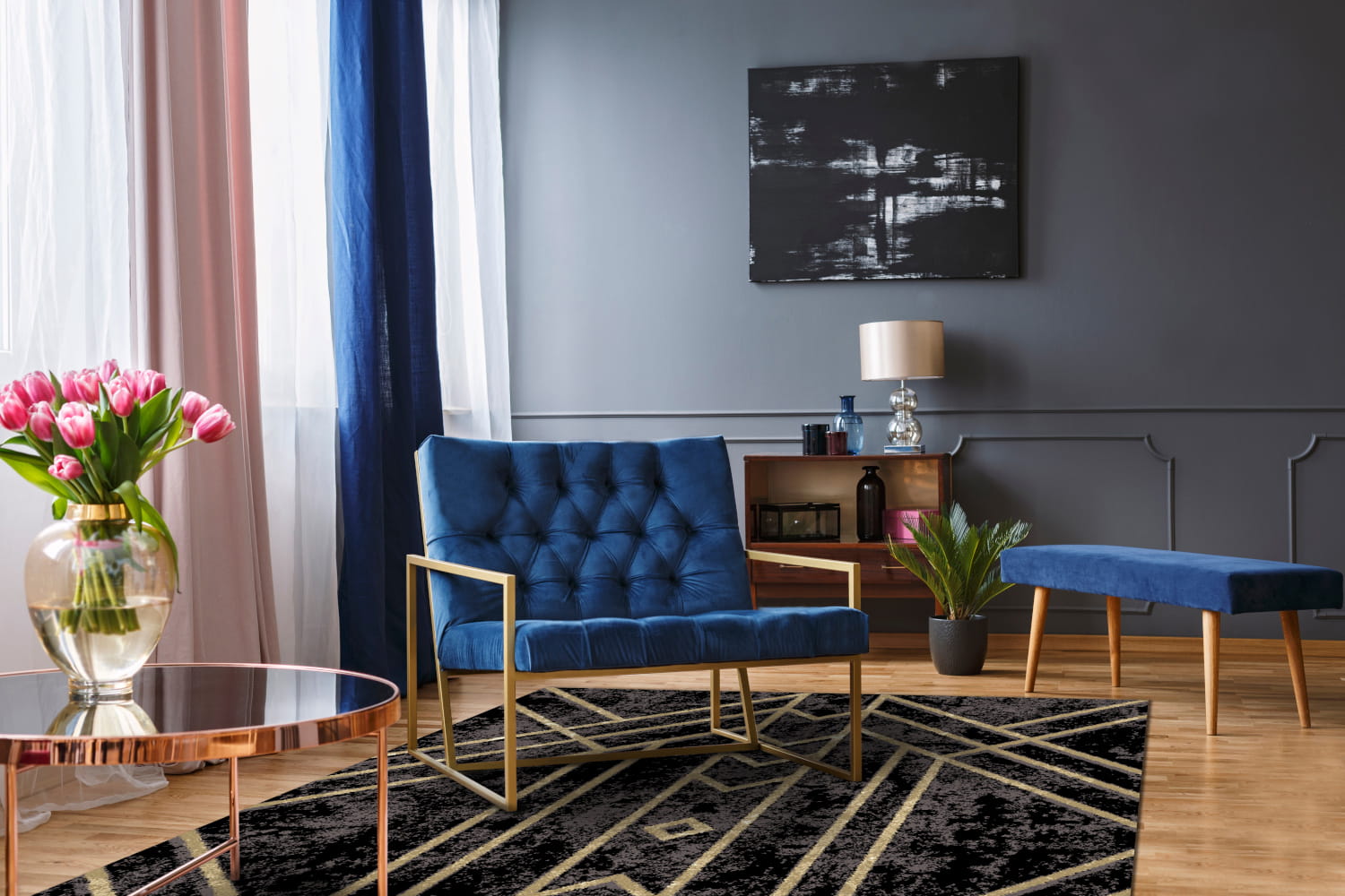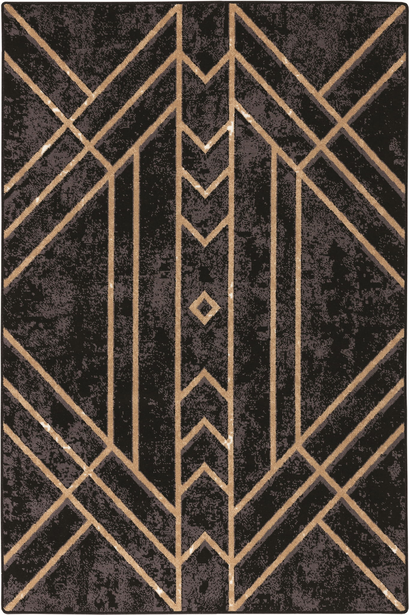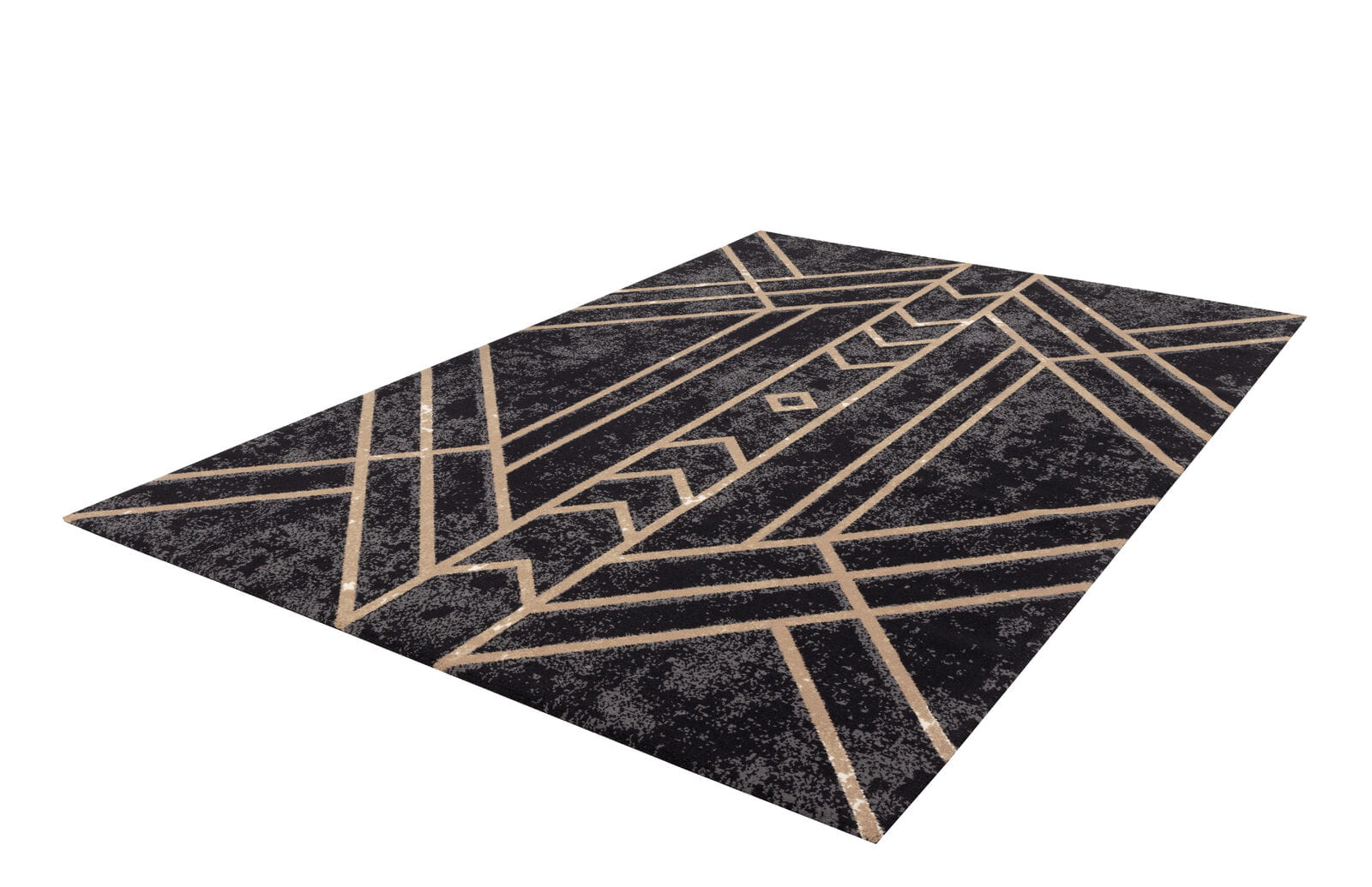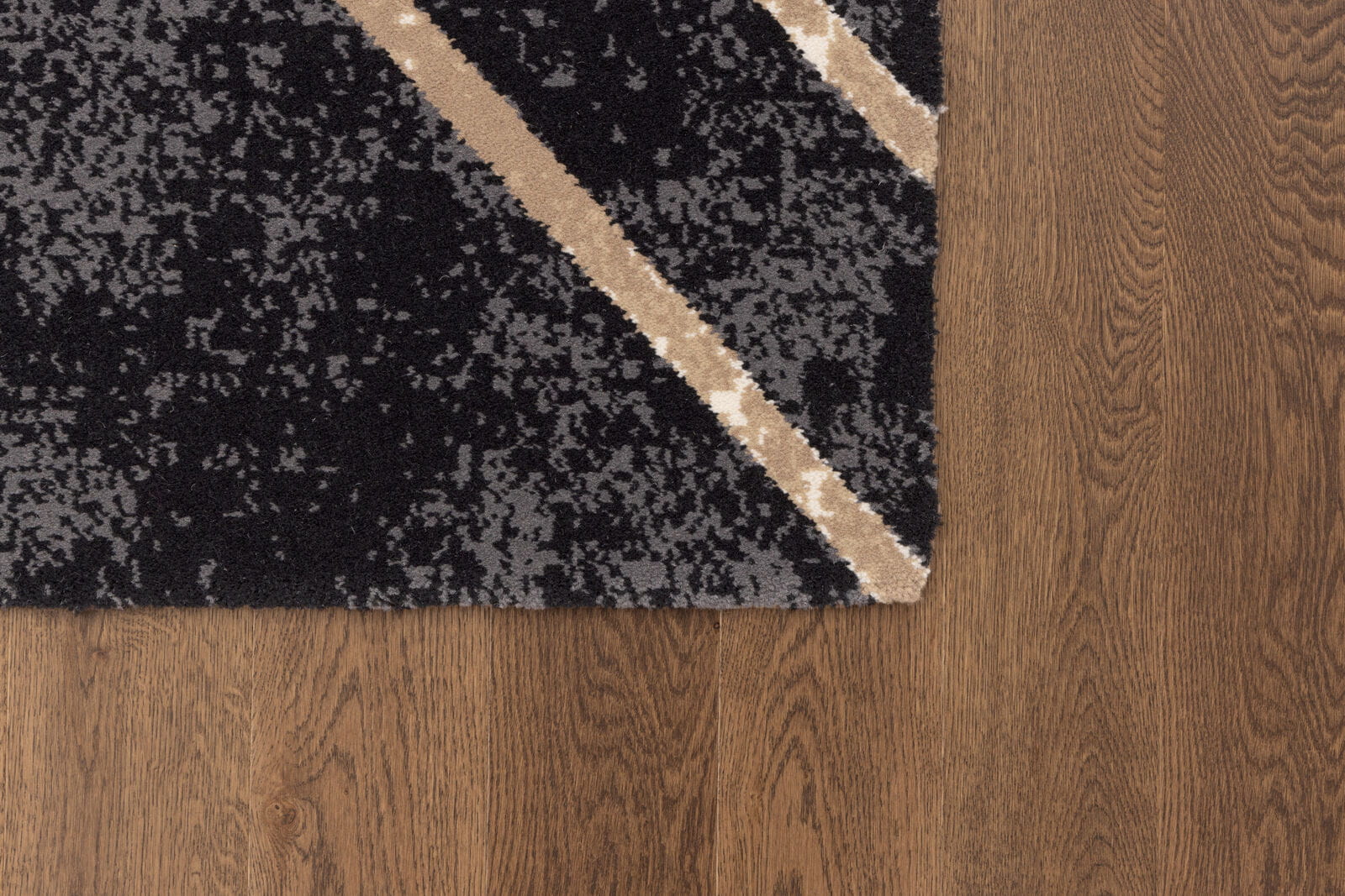 Nowoczesny dywan z geometrycznym wzorem w odcieniach beżu, zestawionym z czarnym, cieniowanym tłem. Dywan idealnie wpisuje się w styl Art Deco, nadaje wnętrzu dynamizmu, jest idealny zarówno do nowoczesnych, jak i klasycznych przestrzeni. Wykonany z luksusowej wełny owczej, gwarantującej jego trwałość i komfort.