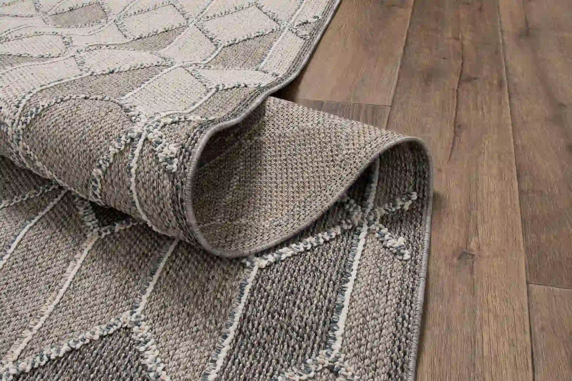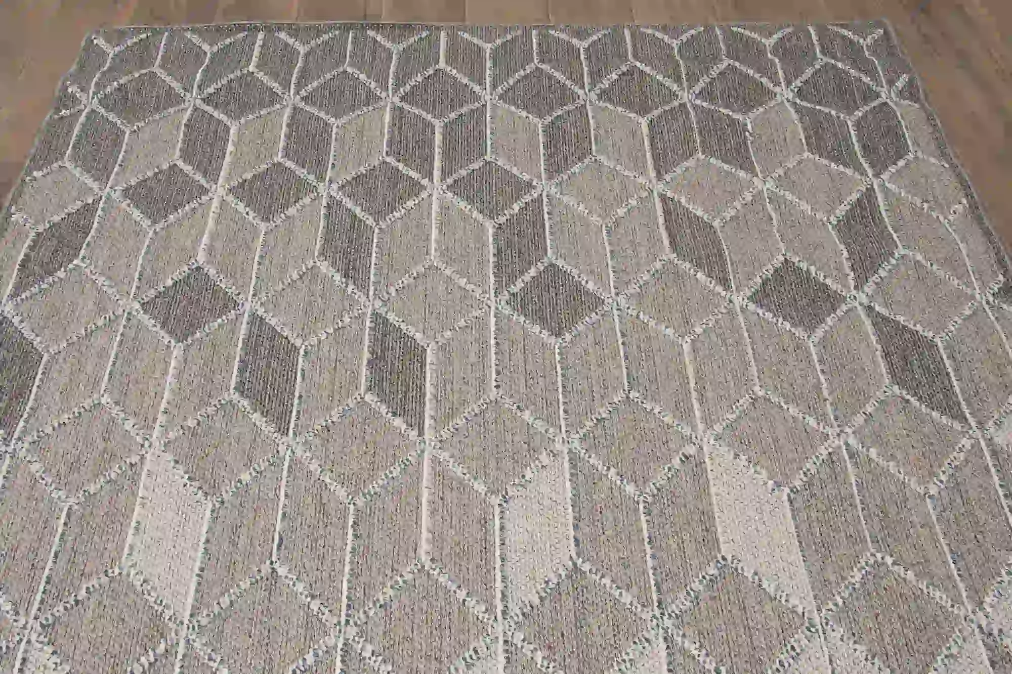 Dywan nowoczesny w odcieniach szarości o geometrycznym wzorze oraz z efektem 3d . To dywan płasko tkany, który znajduje wszechstronne zastosowanie. Są odporne na ścieranie i łatwe do utrzymania w czystości.