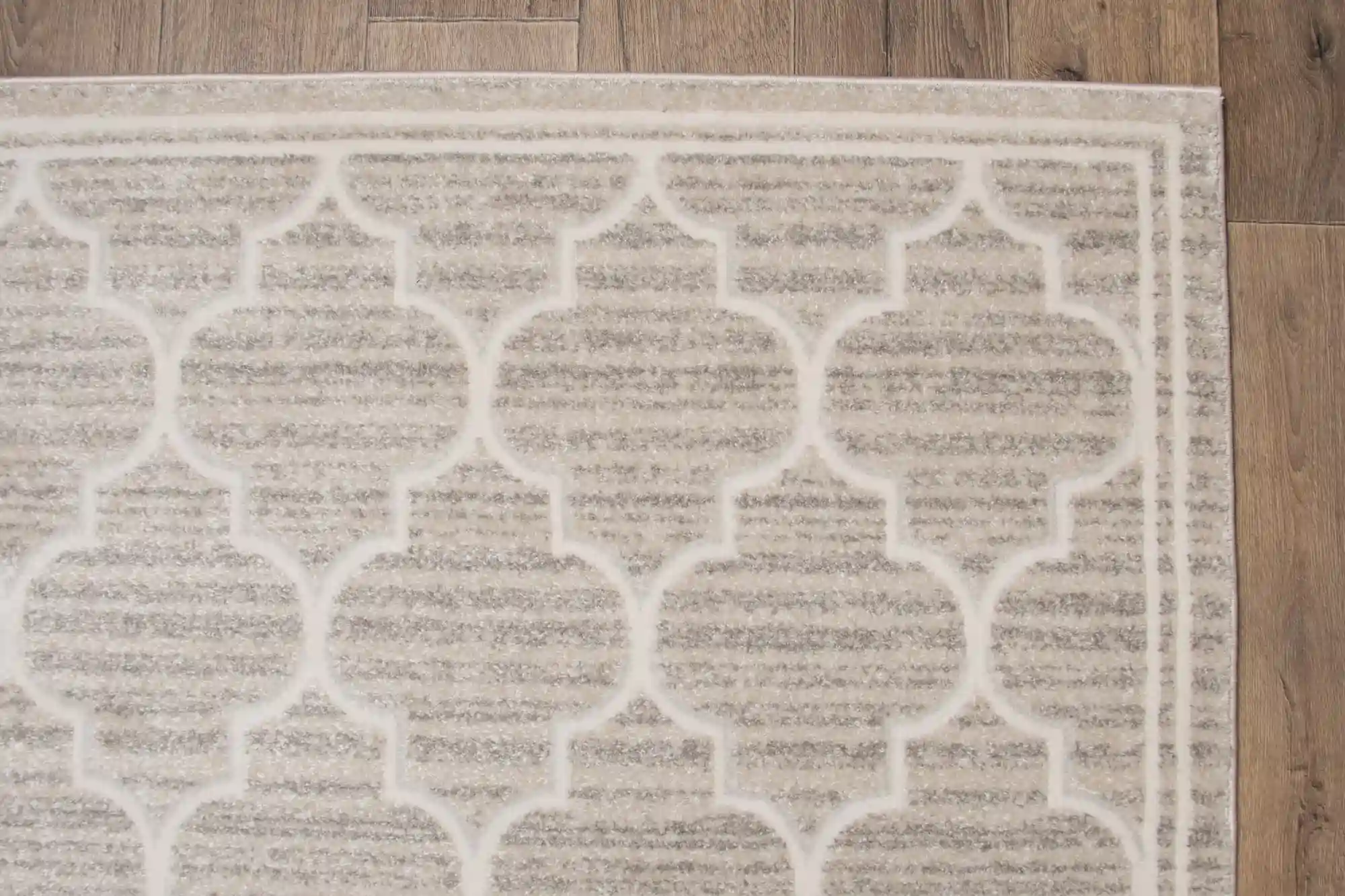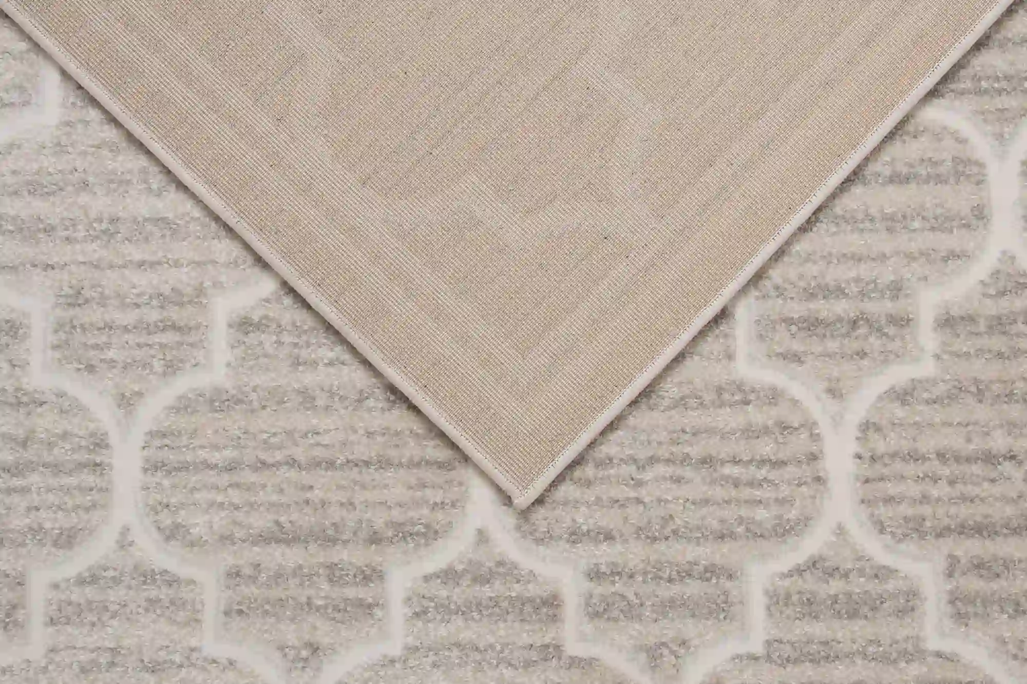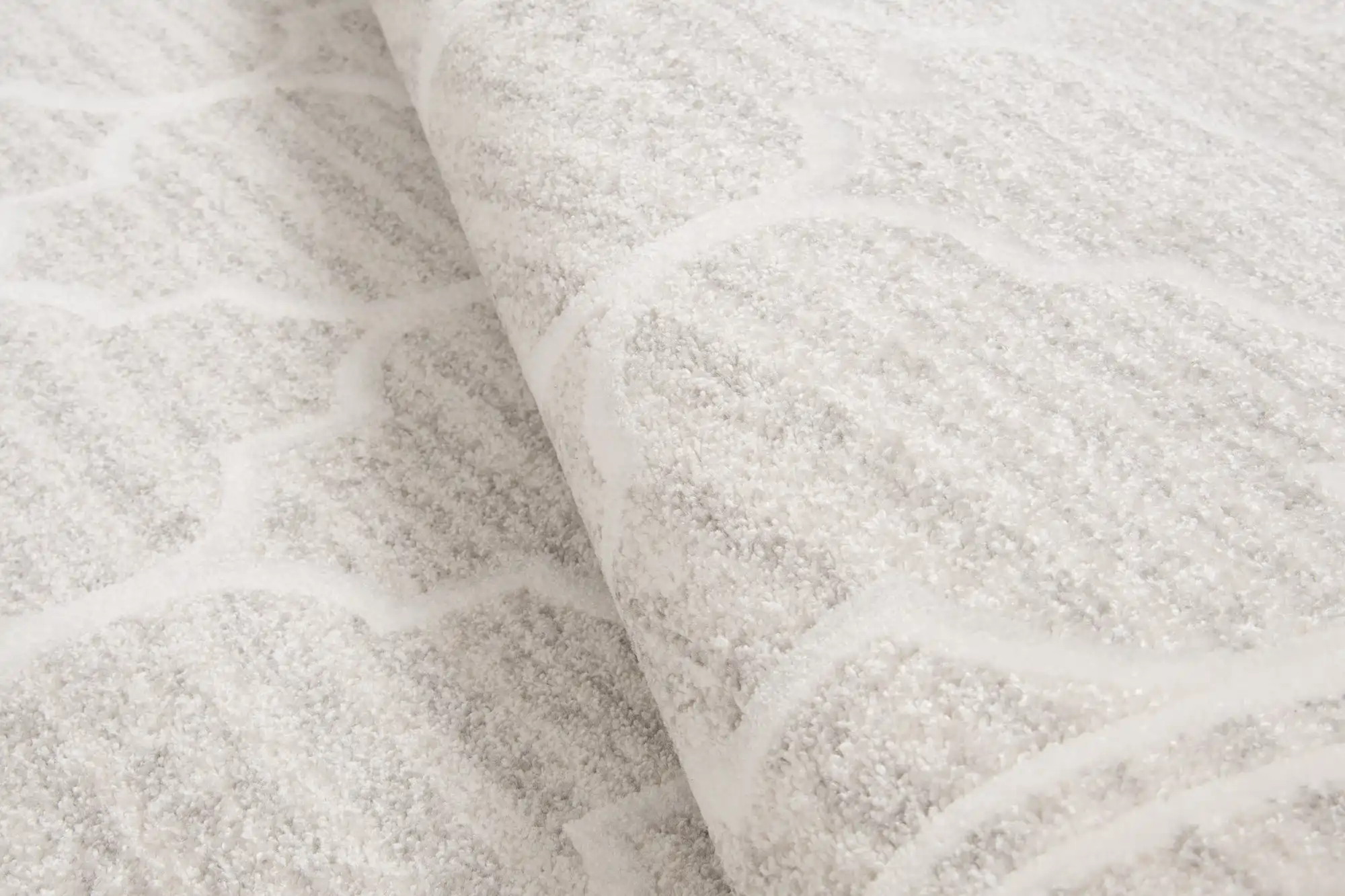 Stylowy dywan utrzymany w modnych odcieniach szarości, ozdobiony eleganckim wzorem koniczyny marokańskiej. Wykonany z praktycznego i trwałego polipropylenu – odporny na ścieranie, łatwy w czyszczeniu i idealny do codziennego użytku.