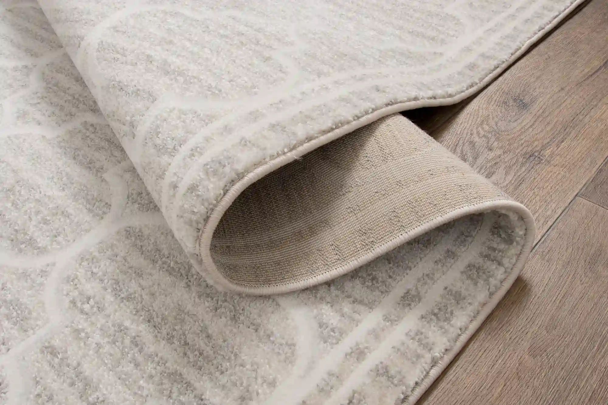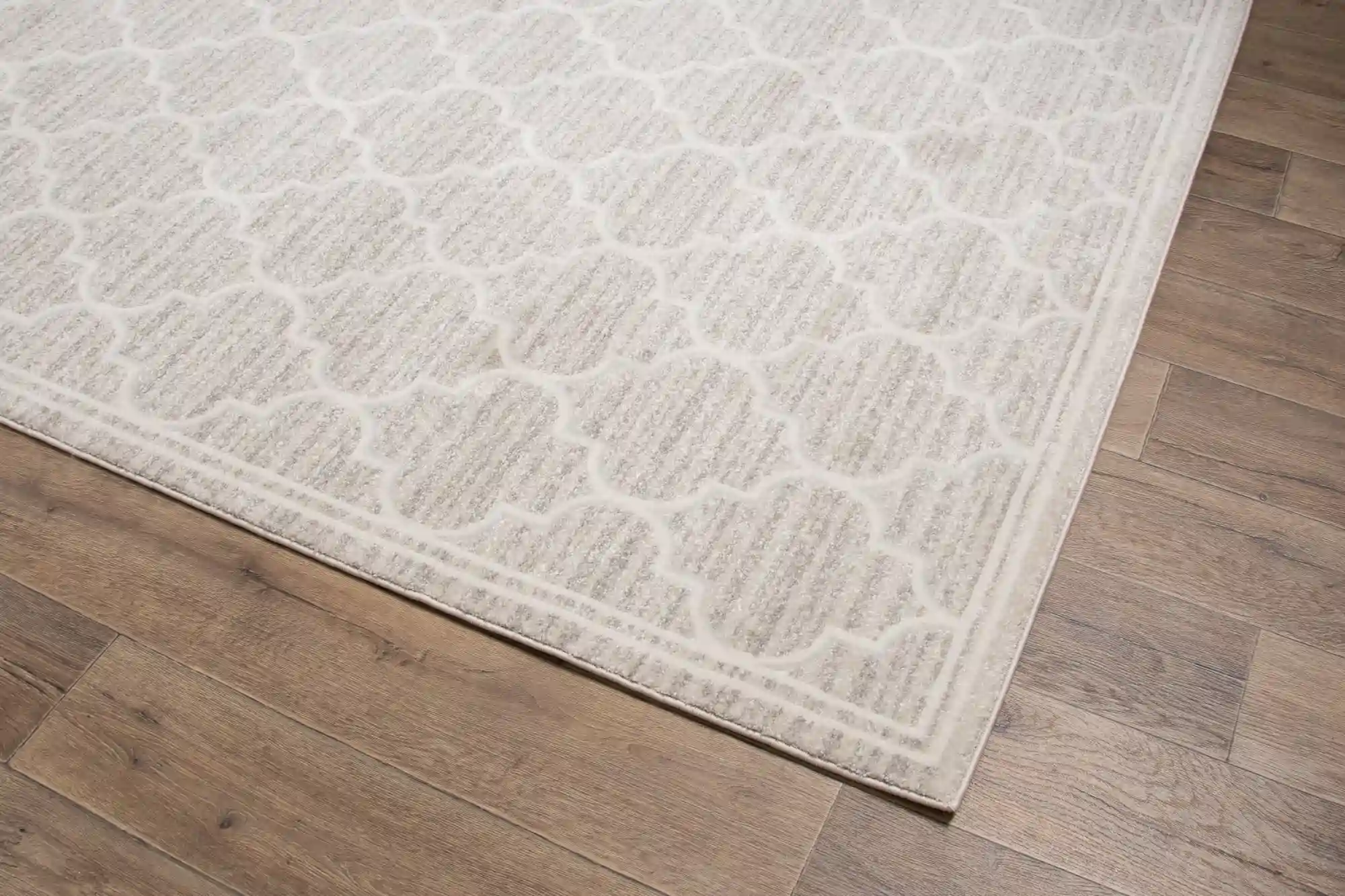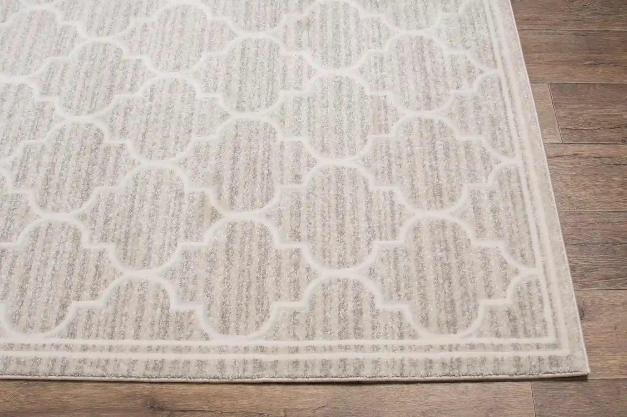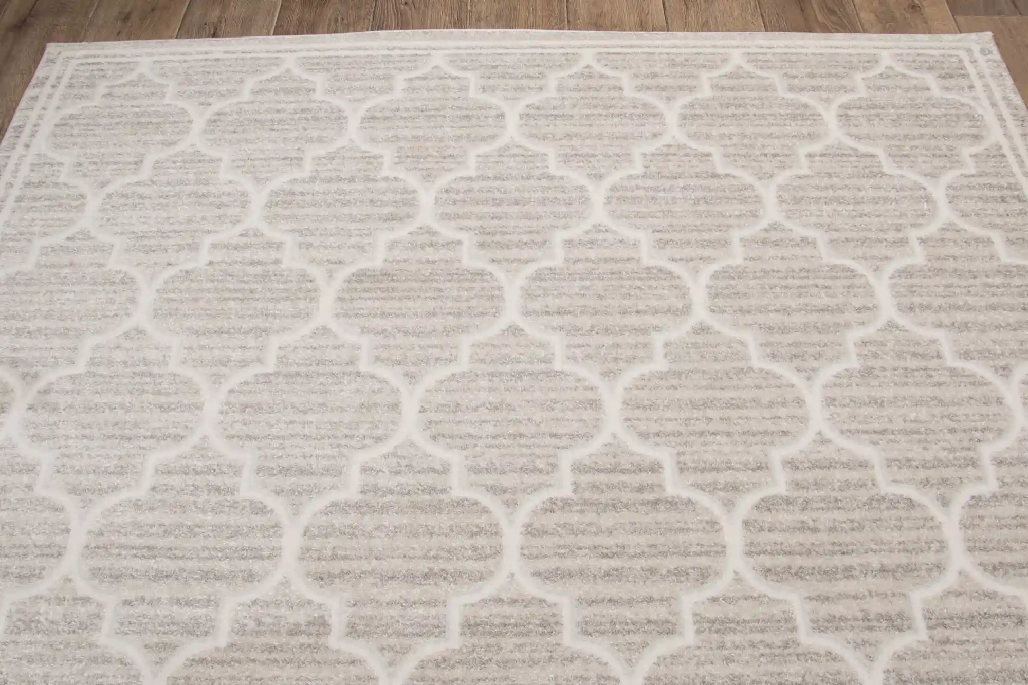 Stylowy dywan utrzymany w modnych odcieniach szarości, ozdobiony eleganckim wzorem koniczyny marokańskiej. Wykonany z praktycznego i trwałego polipropylenu – odporny na ścieranie, łatwy w czyszczeniu i idealny do codziennego użytku.