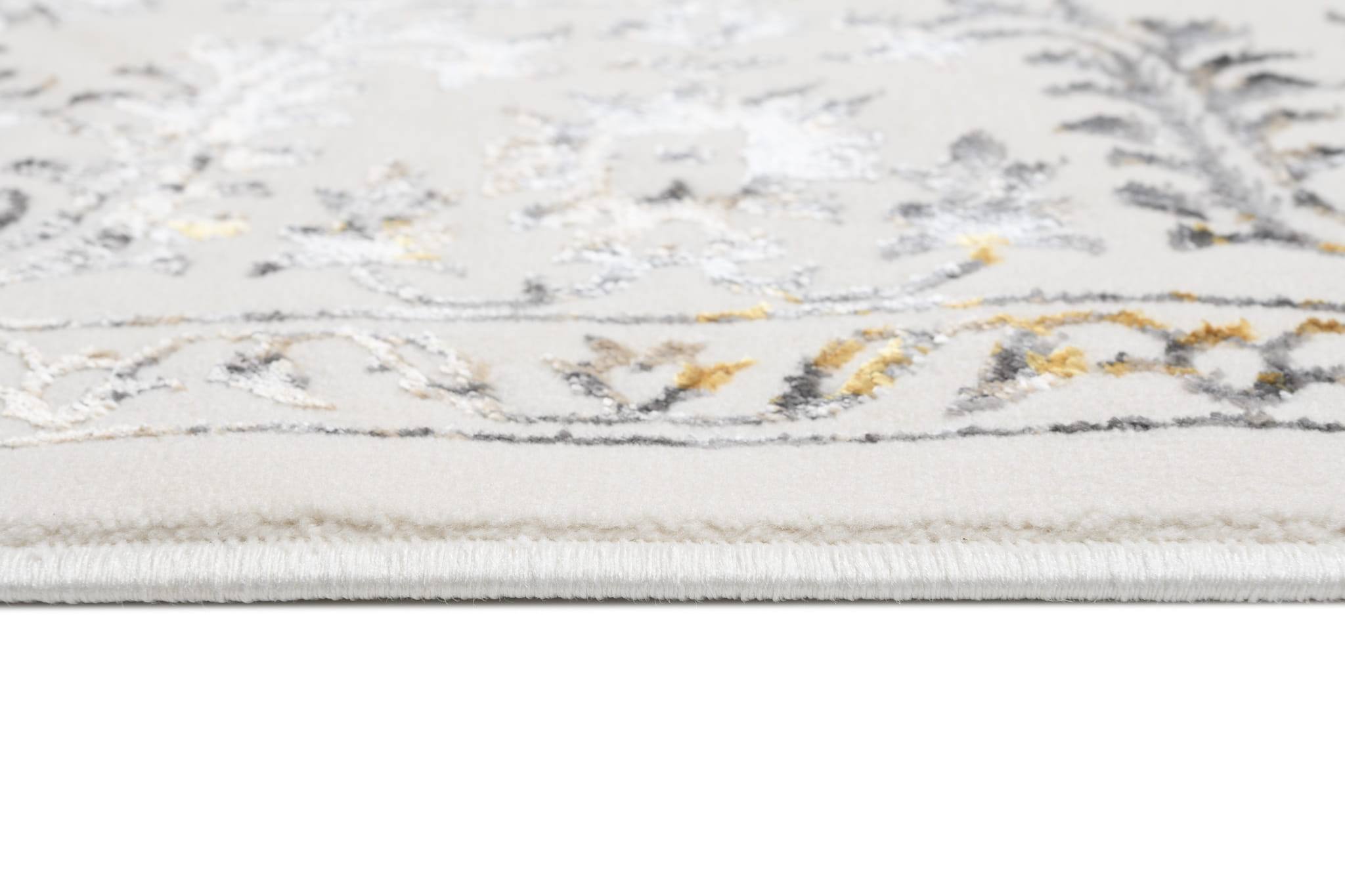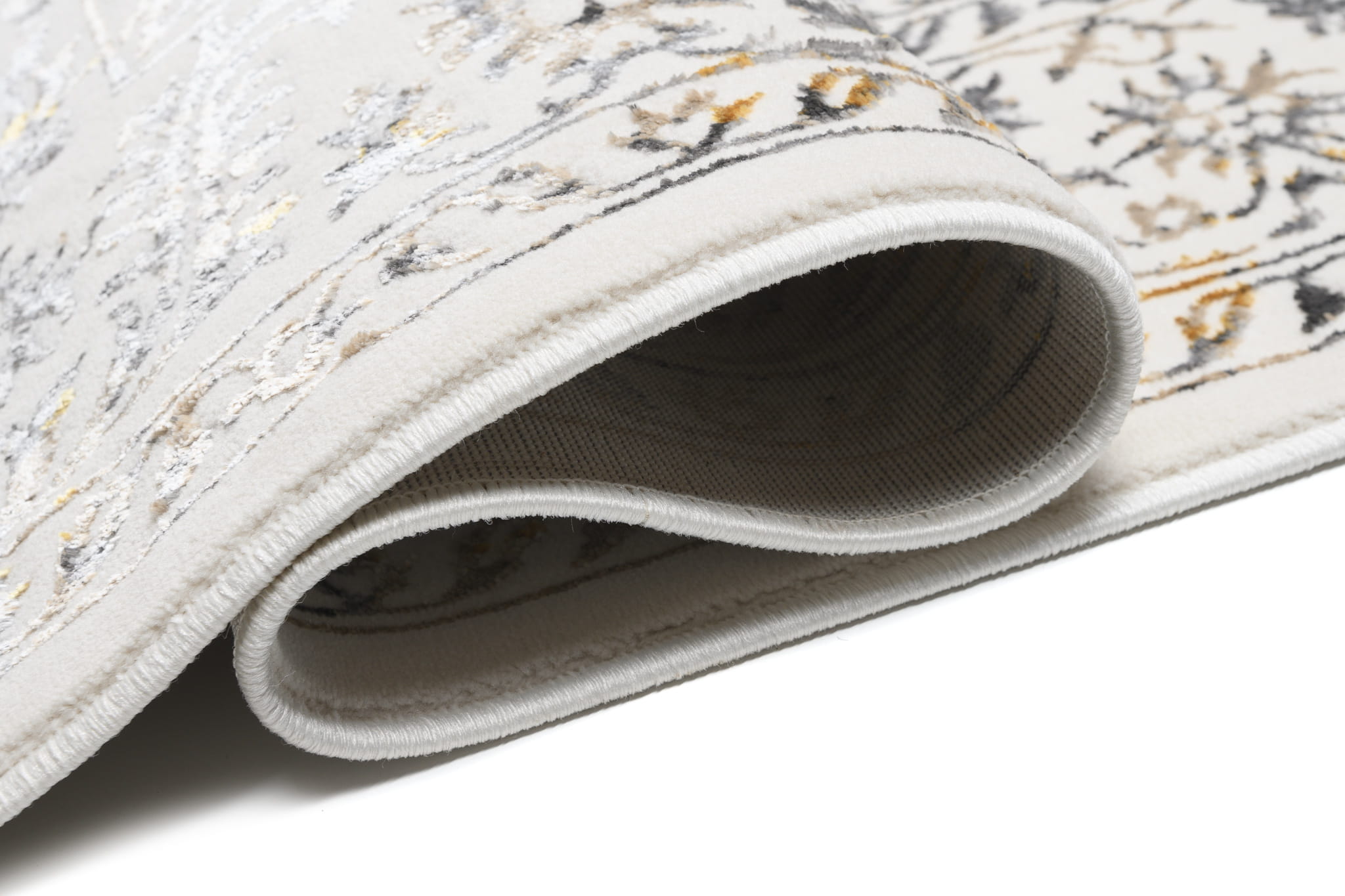 Krótkowłosy dywan, z włókien syntetycznych, wpisujący się w stylistykę vintage. Na kremowym tle znajduje się postarzany, tradycyjny wzór inspirowany motywami roślinnymi, w kolorystyce szarości, beżu i złota, w niektórych miejscach wzbogacony połyskliwą nicią. Dywan jest trwały i łatwy w utrzymaniu czystości.