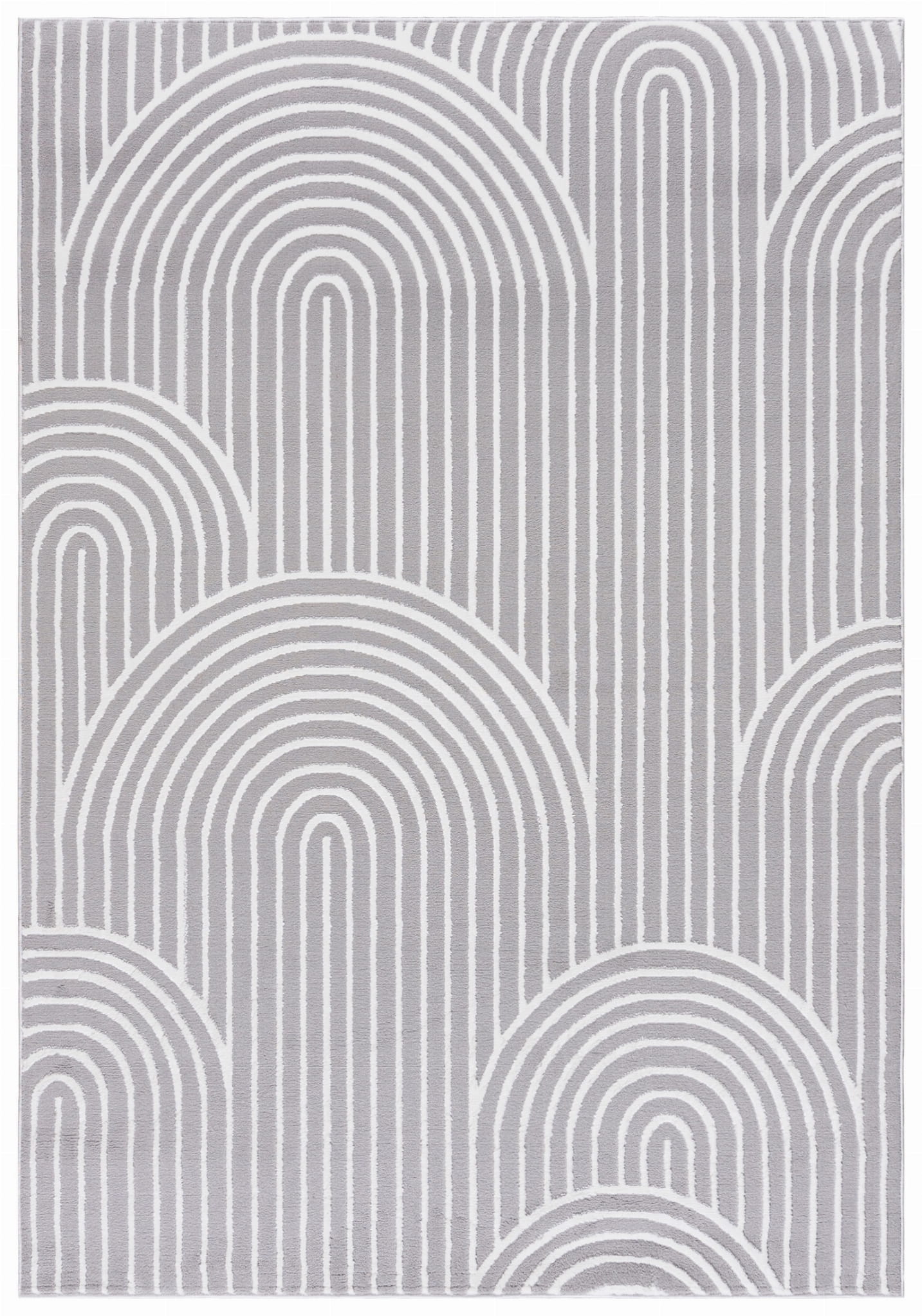 Krótkowłosy, szaro-biały dywan 3d, z harmonijnym, geometrycznym wzorem przypominającym spotykane w ogrodach japońskich misterne rysunki na piasku. Wykonano go z wysokiej jakości włókien syntetycznych, dzięki czemu jest trwały i łatwy w utrzymaniu czystości.