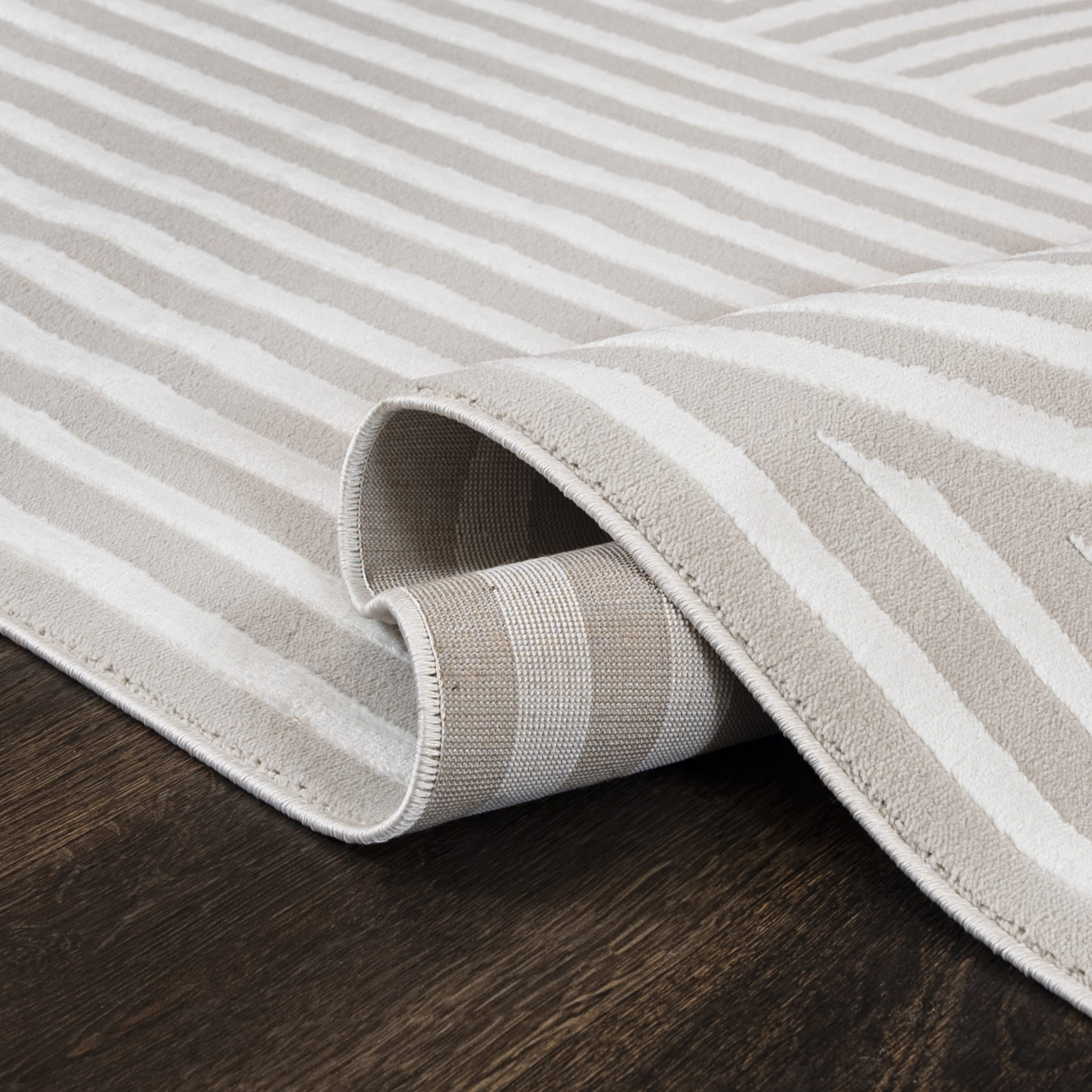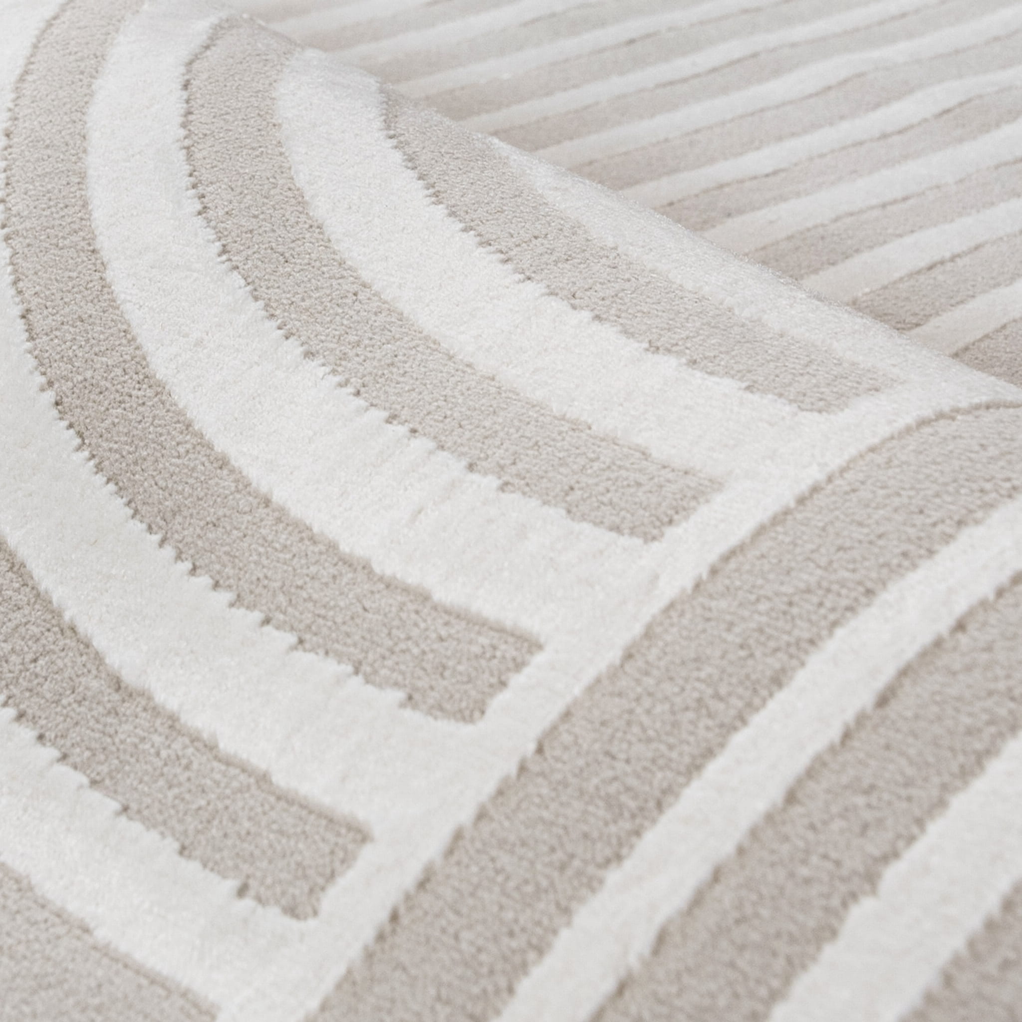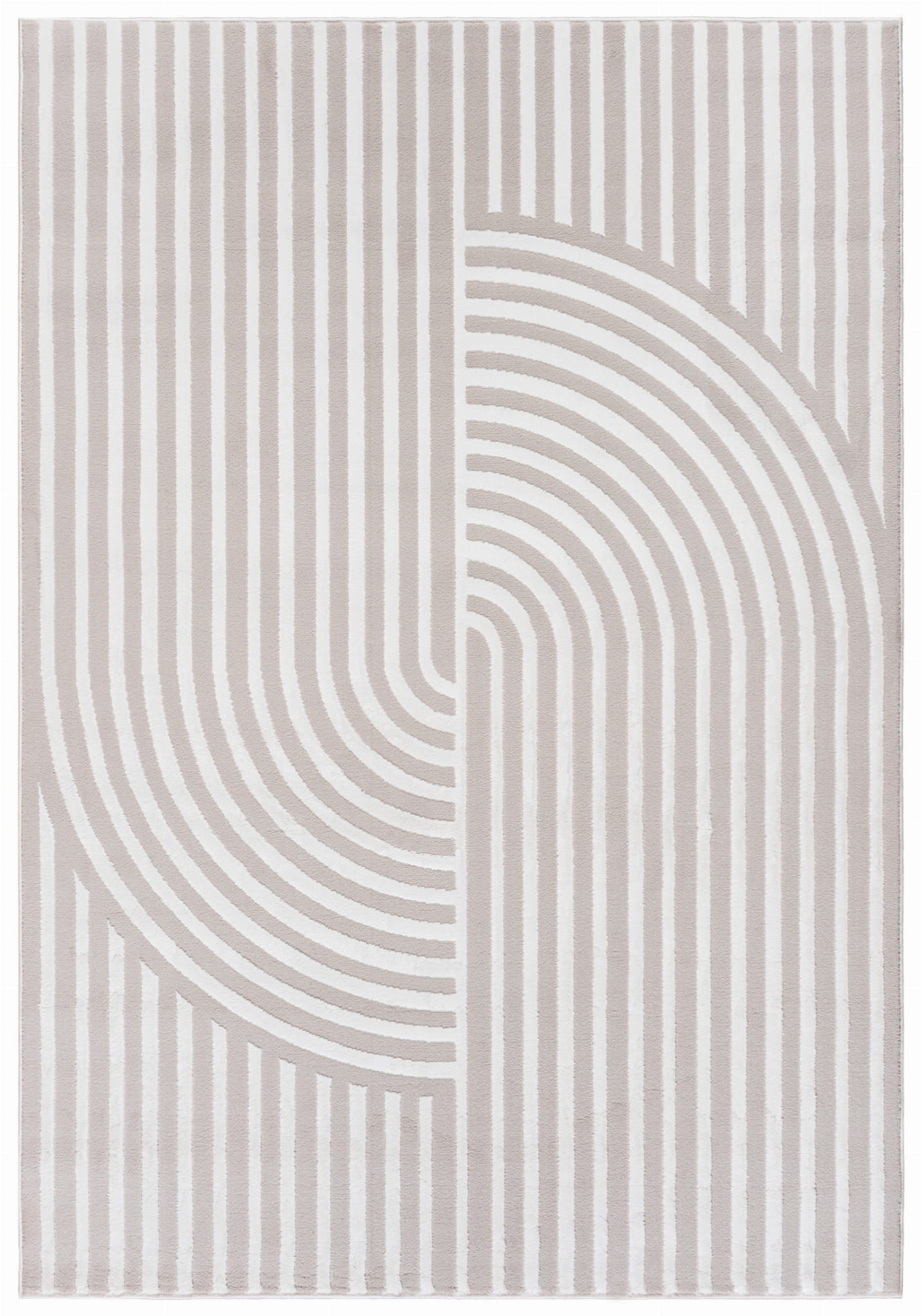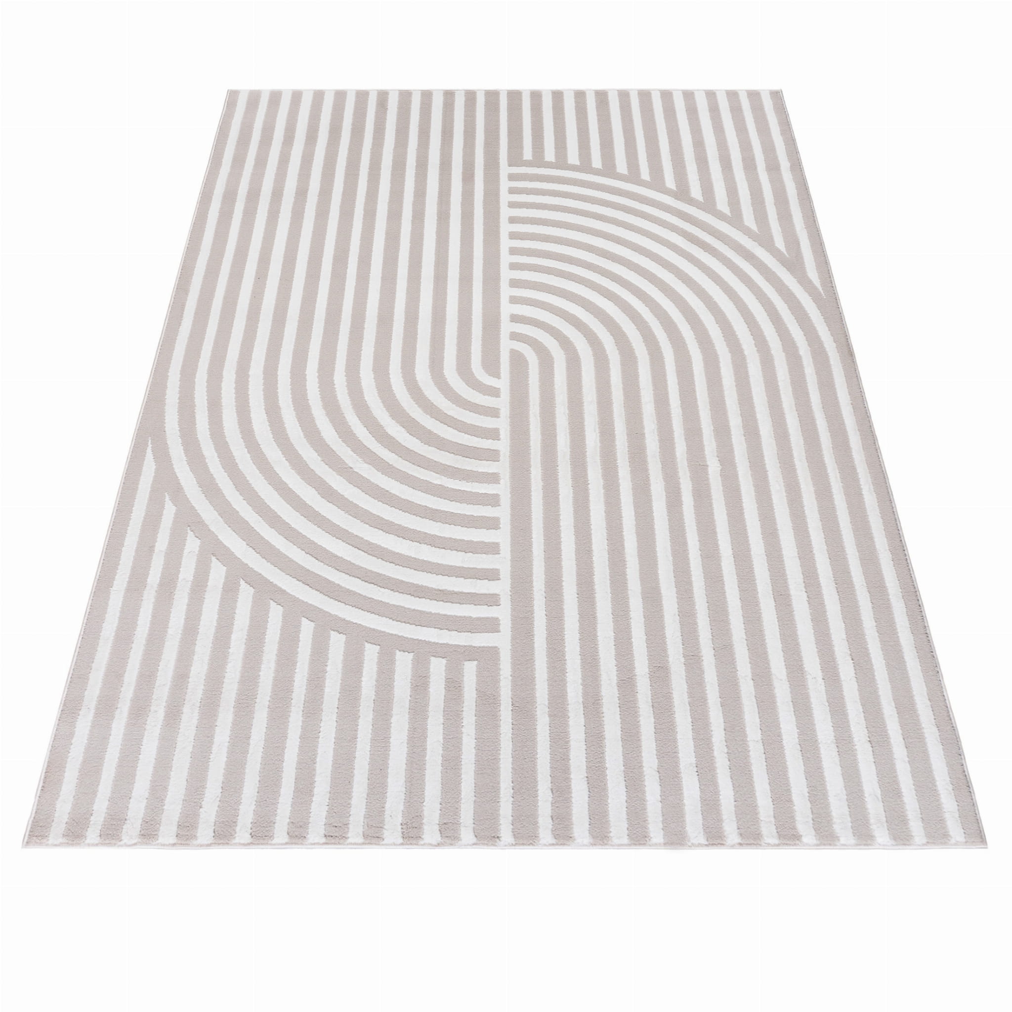 Krótkowłosy, jasny dywan 3d, z harmonijnym, geometrycznym wzorem przypominającym spotykane w ogrodach japońskich misterne rysunki na piasku. Wykonano go z wysokiej jakości włókien syntetycznych, dzięki czemu jest trwały i łatwy w utrzymaniu czystości.