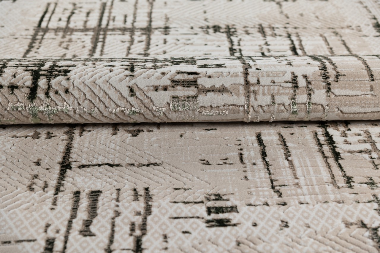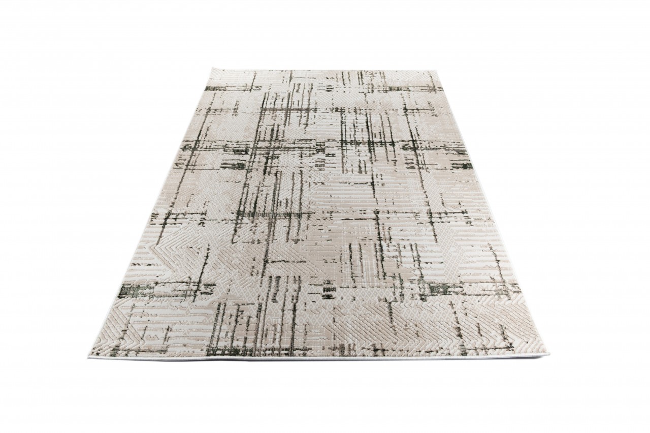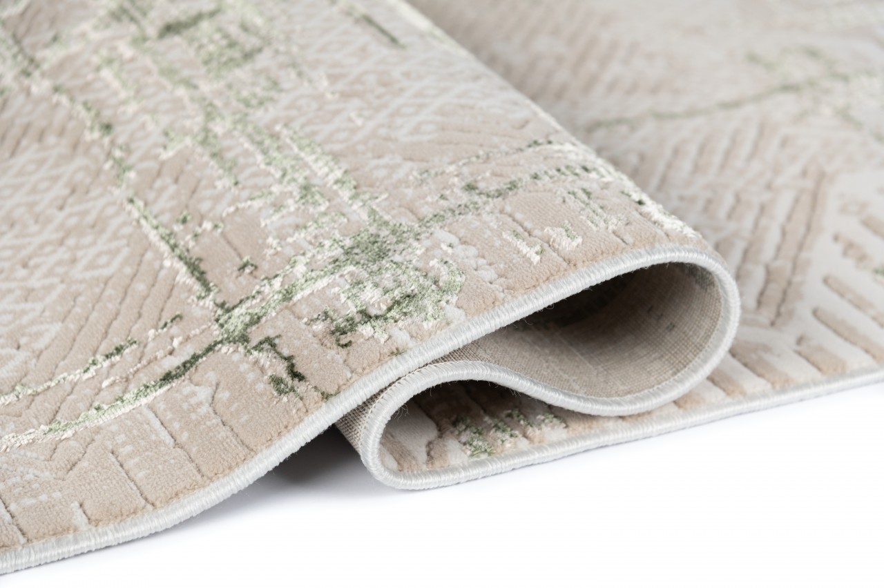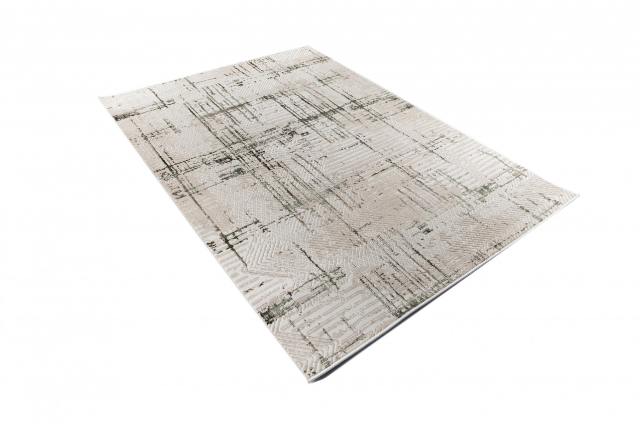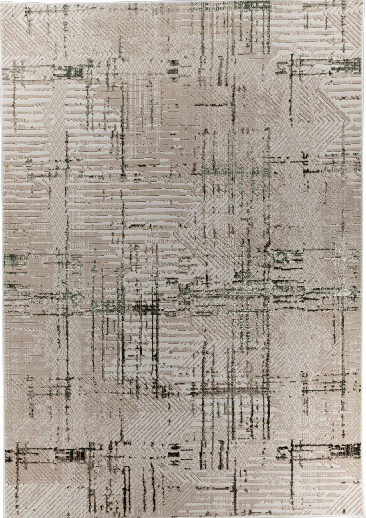 Dywan jest trwały i łatwy w utrzymaniu czystości, wykonany z wysokiej jakości włókien syntetycznych. Dywan ma nowoczesny wzór z przecinających się linii i geometrycznych kształtów w odcieniach beżu i zieleni, nadający wnętrzu elegancki, stylowy charakter.