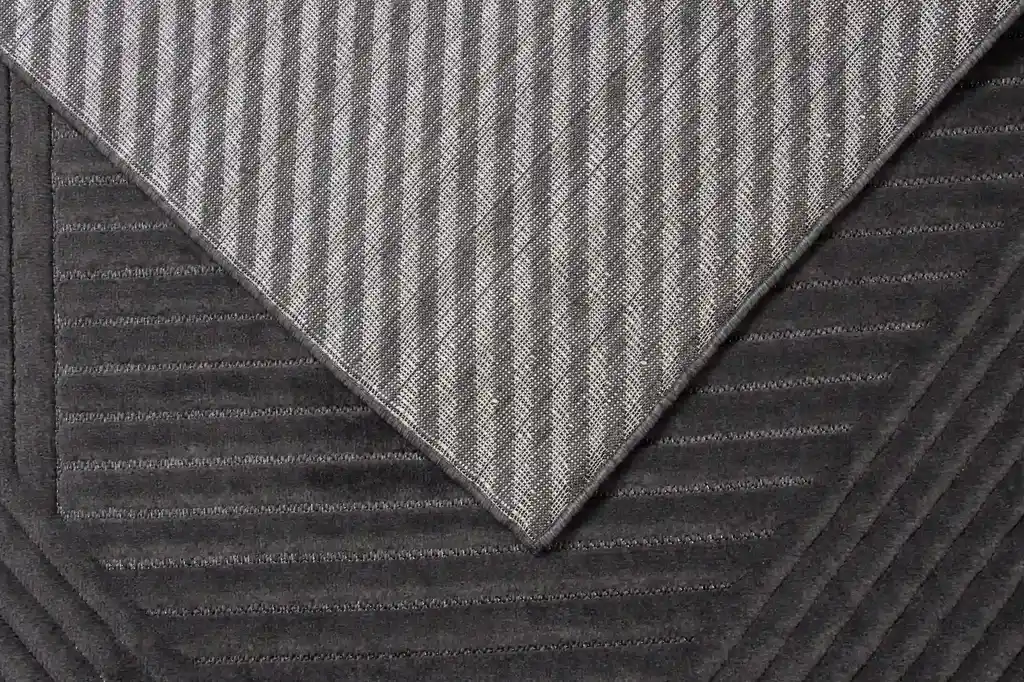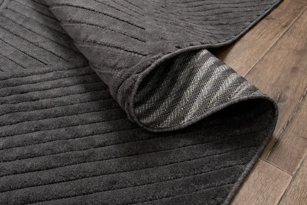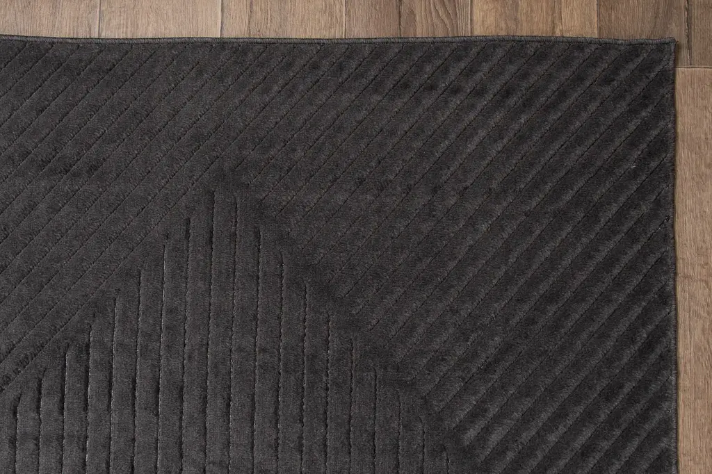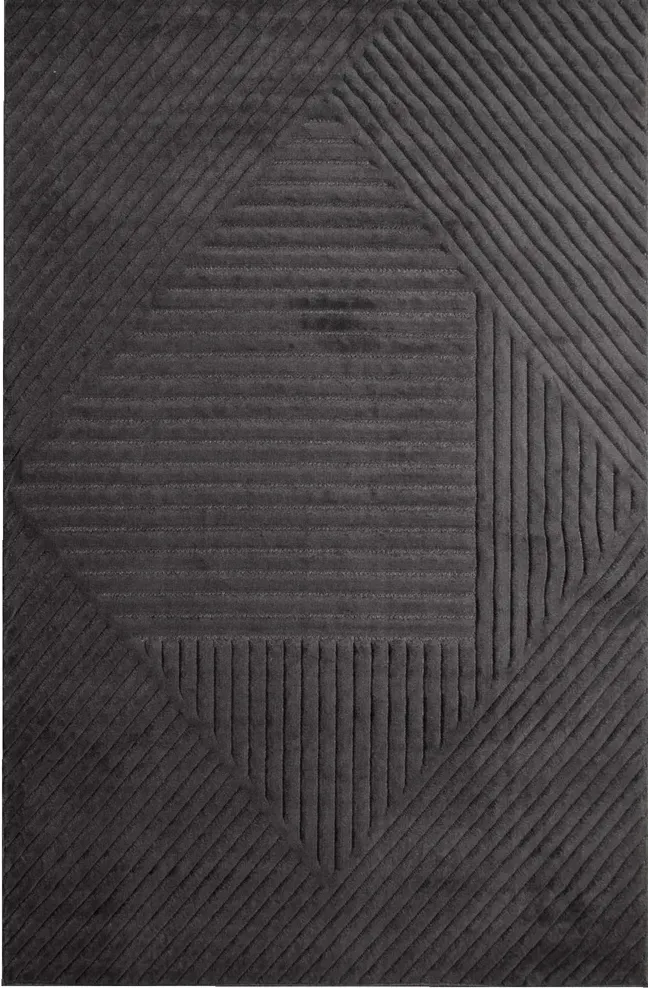 Dywan w odcieniach grafitu, z geometrycznym wzorem, delikatnie wycinanym-3d. Wykonany z wysokiej jakości włókien syntetycznych, gwarantuje trwałość i łatwość w utrzymaniu czystości.