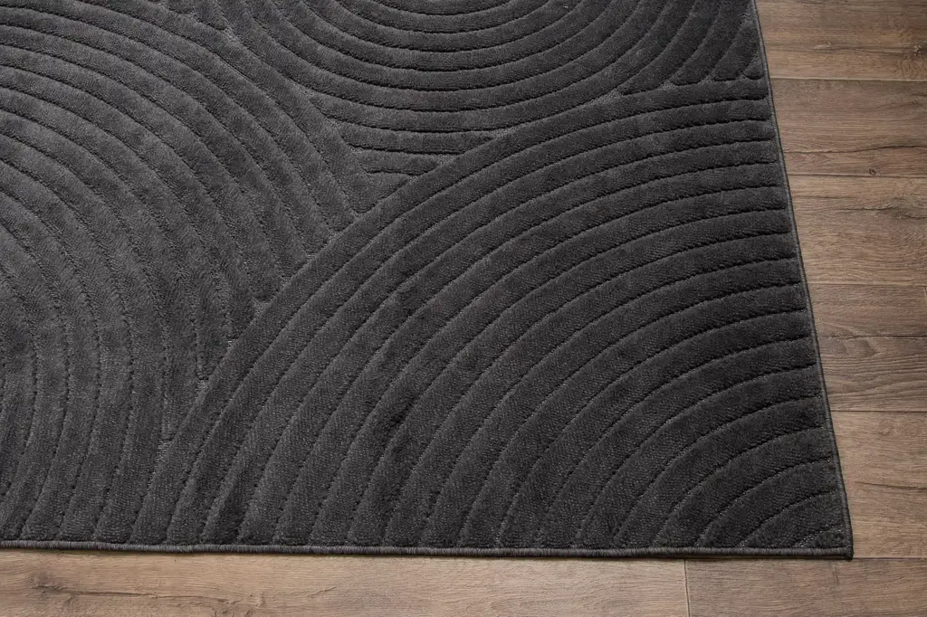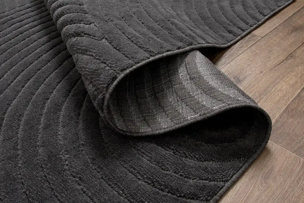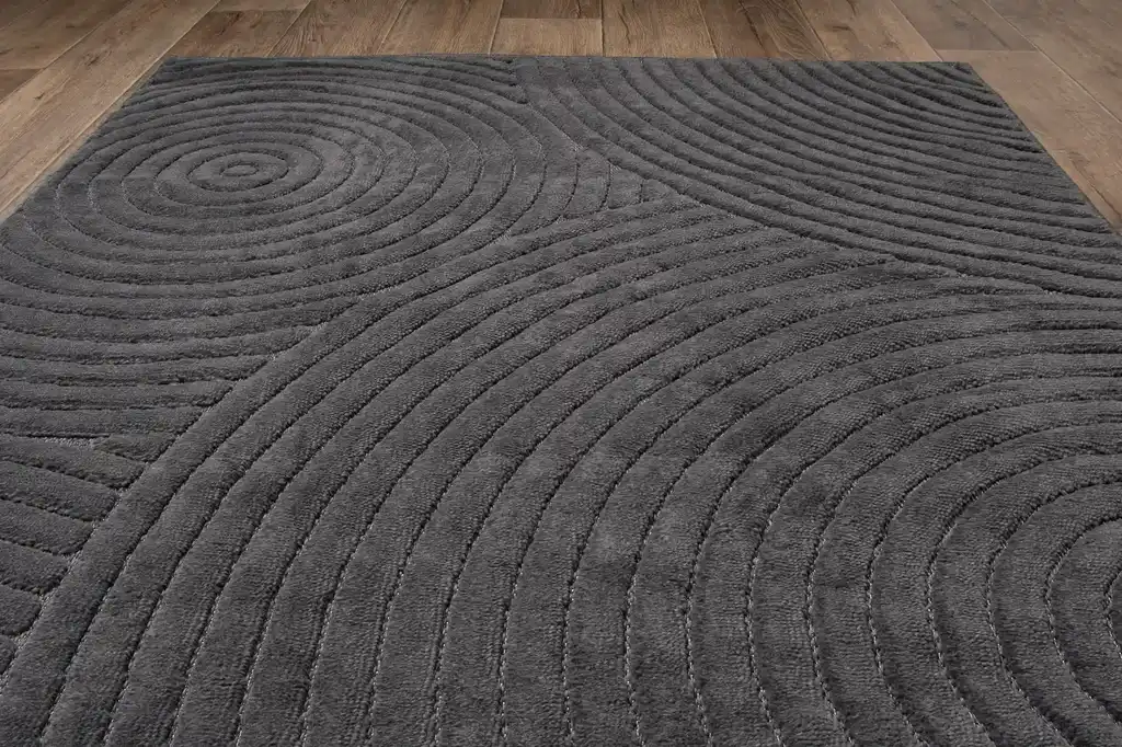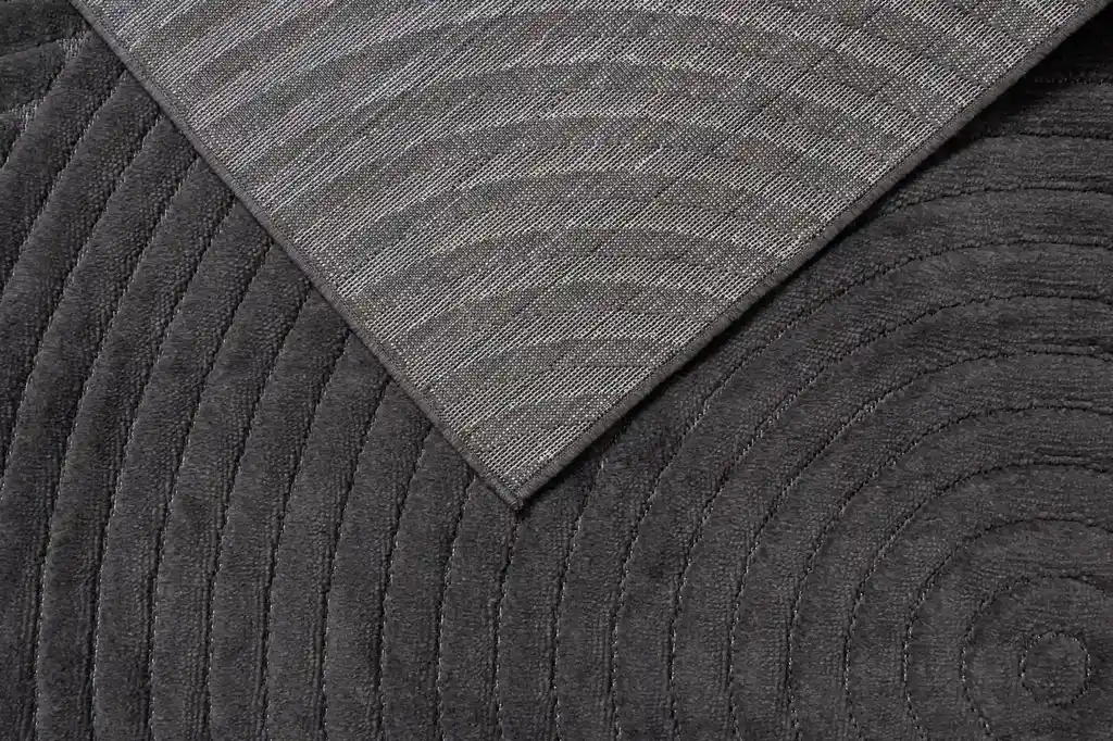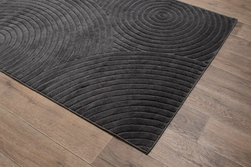 Dywan w odcieniach grafitu z dużymi, delikatnie wycinanymi kołami-3d. Wykonany z wysokiej jakości włókien syntetycznych, gwarantuje trwałość i łatwość w utrzymaniu czystości.