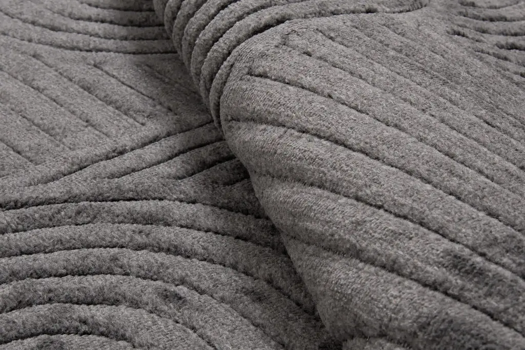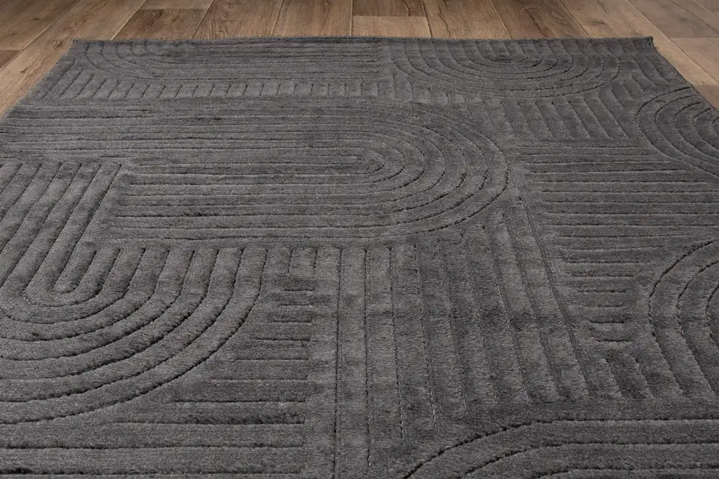 Dywan w odcieniach szarości, z geometrycznym wzorem, delikatnie wycinanym-3d. Wykonany z wysokiej jakości włókien syntetycznych, gwarantuje trwałość i łatwość w utrzymaniu czystości.