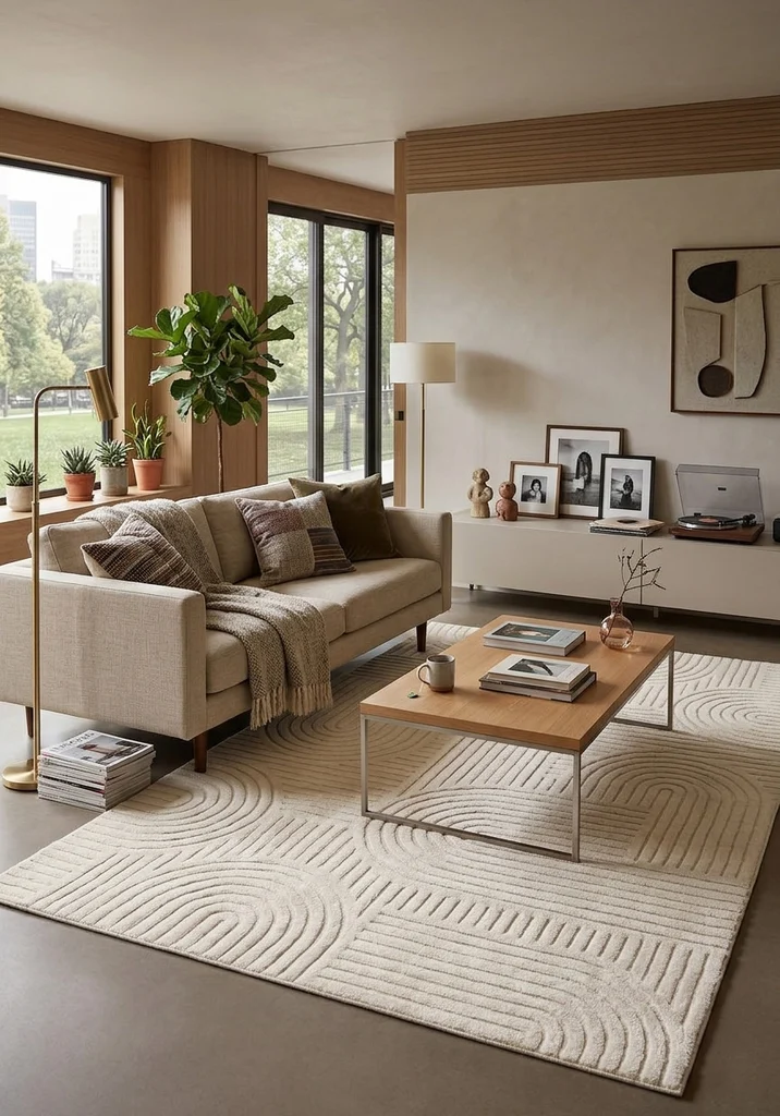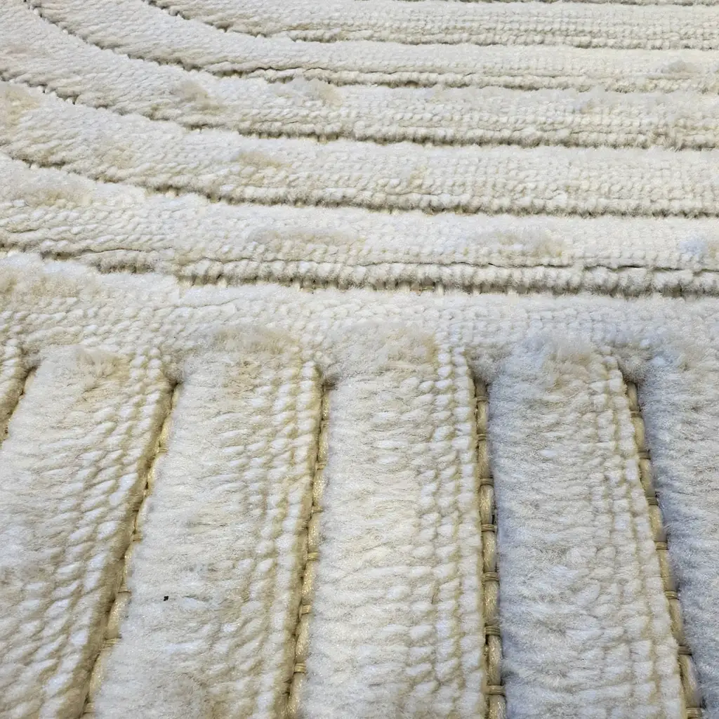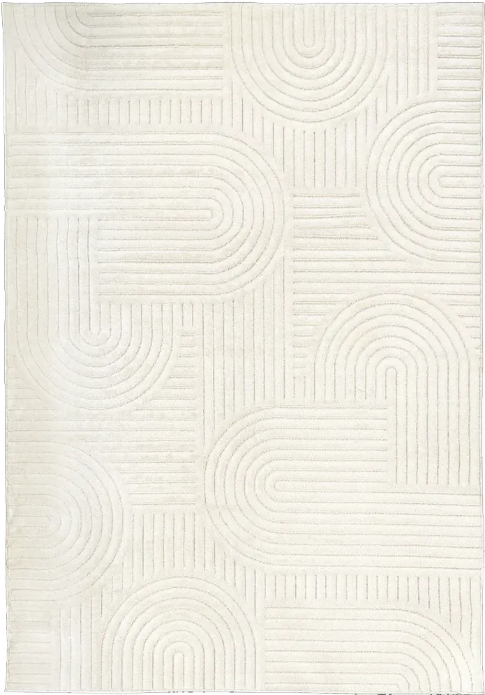Dywan w odcieniach kremu, z geometrycznym wzorem, delikatnie wycinanym-3d. Wykonany z wysokiej jakości włókien syntetycznych, gwarantuje trwałość i łatwość w utrzymaniu czystości.