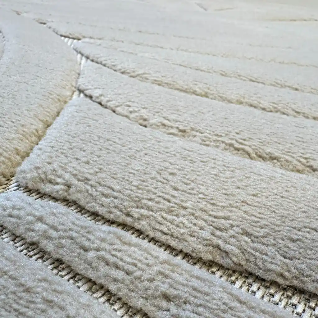 Dywan w odcieniach beżu, ozdobiony nowoczesnym geometrycznym wzorem o subtelnym efekcie 3D, uzyskanym dzięki delikatnemu wycinaniu runa. Wykonany z wysokiej jakości włókien syntetycznych w połączeniu z płaską strukturą sizalu, łączy w sobie estetykę z wyjątkową trwałością.