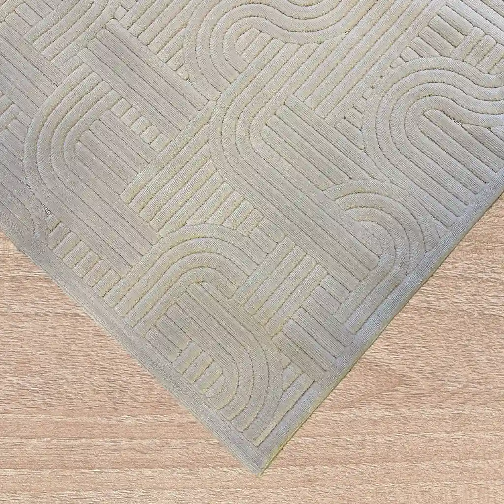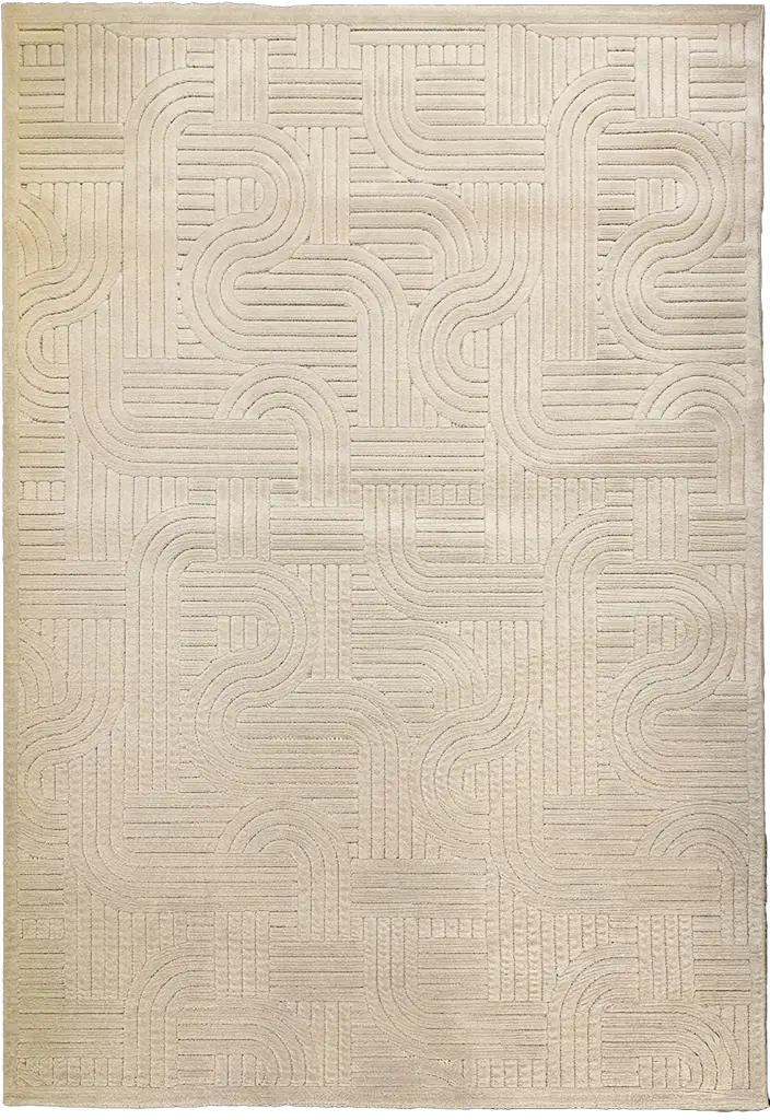 Dywan w odcieniach beżu, ozdobiony nowoczesnym geometrycznym wzorem o subtelnym efekcie 3D, uzyskanym dzięki delikatnemu wycinaniu runa. Wykonany z wysokiej jakości włókien syntetycznych w połączeniu z płaską strukturą sizalu, łączy w sobie estetykę z wyjątkową trwałością.