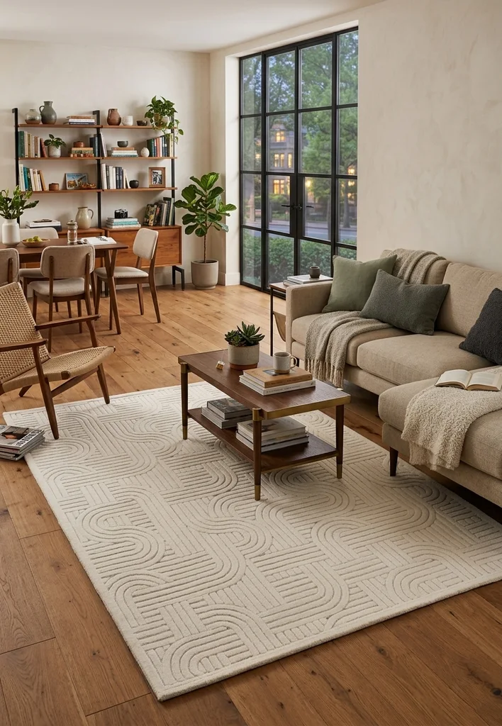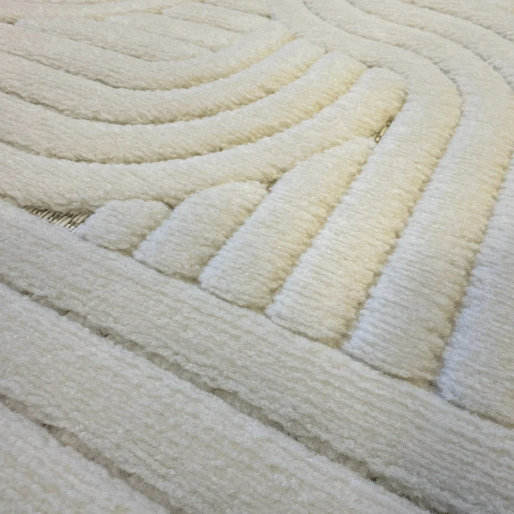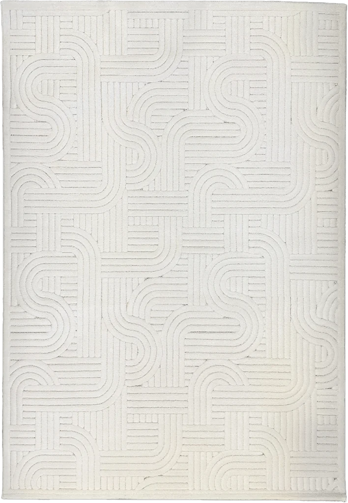 Dywan w odcieniach kremu, ozdobiony nowoczesnym geometrycznym wzorem o subtelnym efekcie 3D, uzyskanym dzięki delikatnemu wycinaniu runa. Wykonany z wysokiej jakości włókien syntetycznych w połączeniu z płaską strukturą sizalu, łączy w sobie estetykę z wyjątkową trwałością.