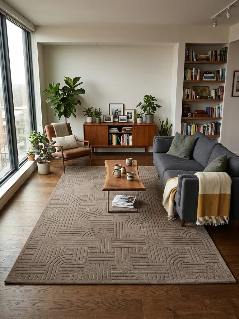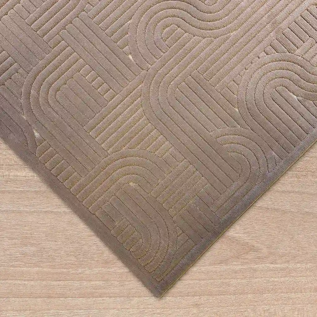 Dywan w odcieniach brązu, ozdobiony nowoczesnym geometrycznym wzorem o subtelnym efekcie 3D, uzyskanym dzięki delikatnemu wycinaniu runa. Wykonany z wysokiej jakości włókien syntetycznych w połączeniu z płaską strukturą sizalu, łączy w sobie estetykę z wyjątkową trwałością.