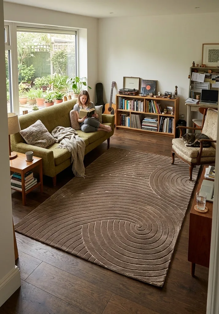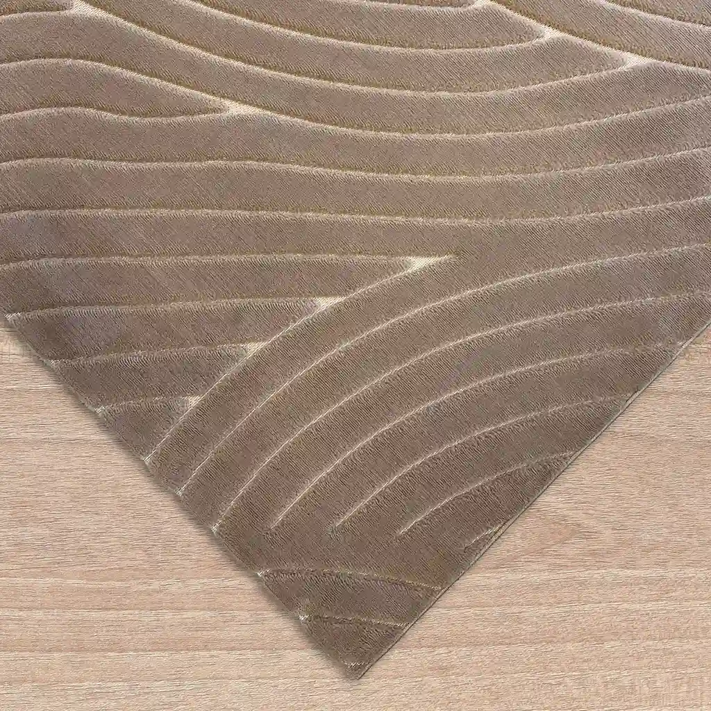 Dywan w odcieniach brązu, ozdobiony nowoczesnym geometrycznym wzorem o subtelnym efekcie 3D, uzyskanym dzięki delikatnemu wycinaniu runa. Wykonany z wysokiej jakości włókien syntetycznych w połączeniu z płaską strukturą sizalu, łączy w sobie estetykę z wyjątkową trwałością.