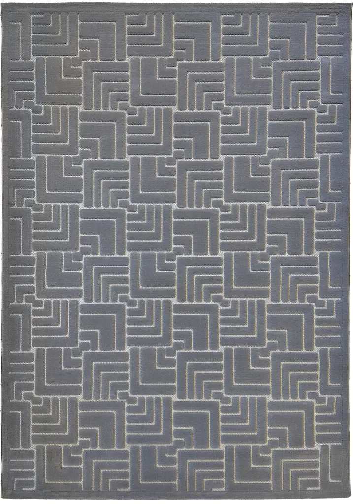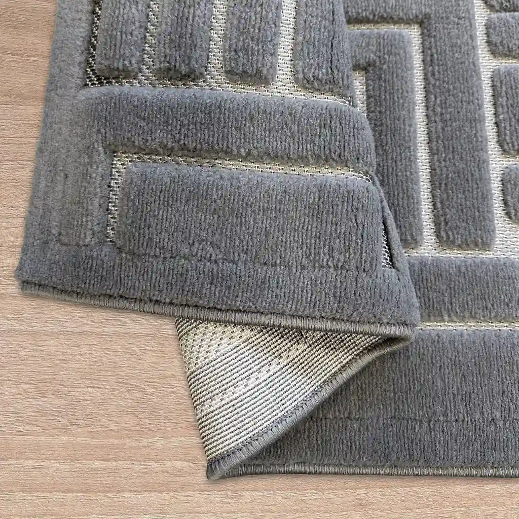 Dywan w odcieniach szarości, ozdobiony nowoczesnym geometrycznym wzorem o subtelnym efekcie 3D, uzyskanym dzięki delikatnemu wycinaniu runa. Wykonany z wysokiej jakości włókien syntetycznych w połączeniu z płaską strukturą sizalu, łączy w sobie estetykę z wyjątkową trwałością.