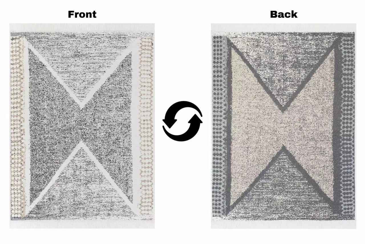 Nowoczesny dywan bawełniany. Obustronny – może być użytkowany z obu stron, co wydłuża jego żywotność. Wykończony dekoracyjnymi frędzlami po krótszych bokach. Miękki, lekki i łatwy w pielęgnacji. Idealny do wnętrz w stylu skandynawskim, boho lub minimalistycznym.