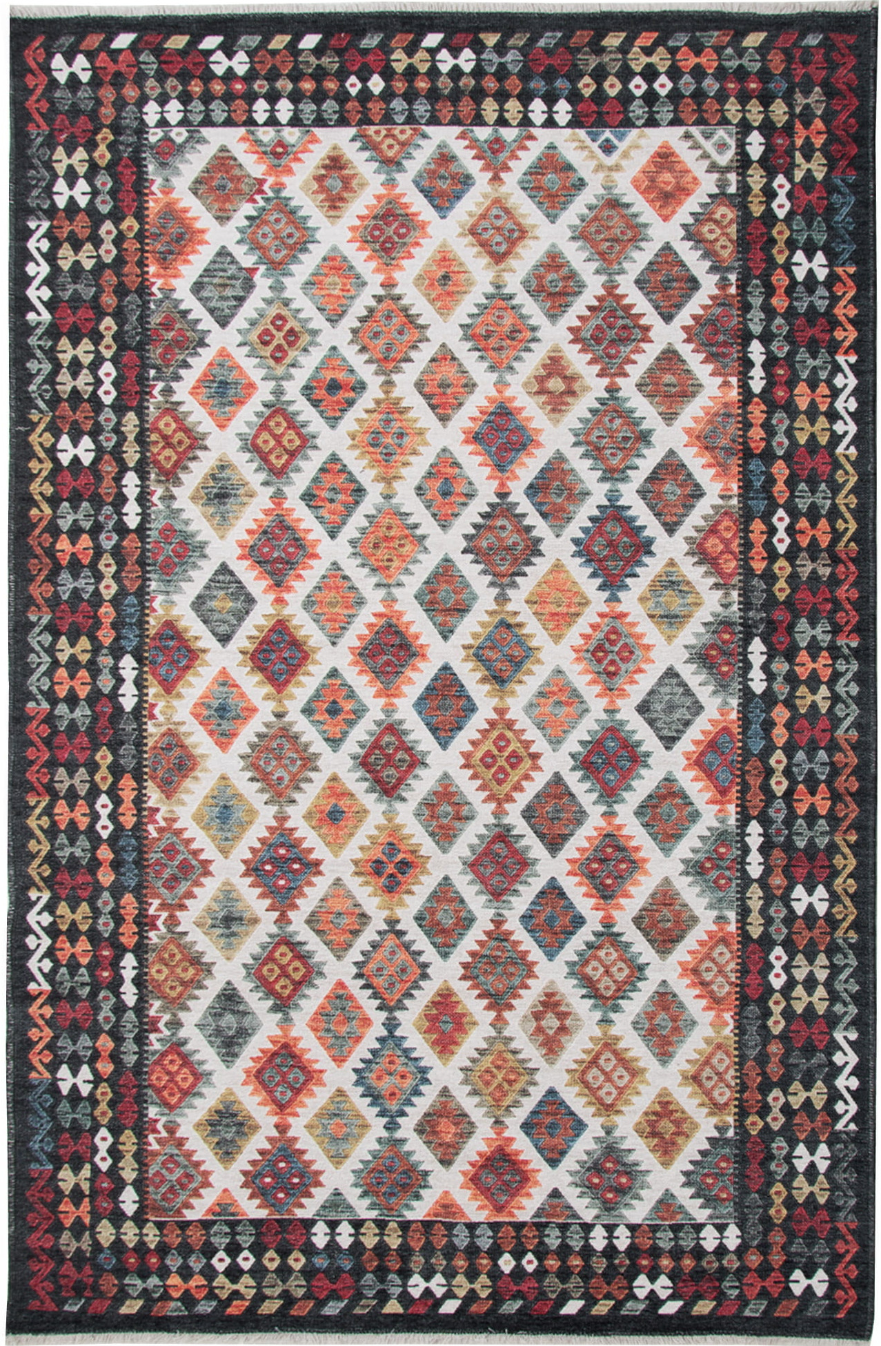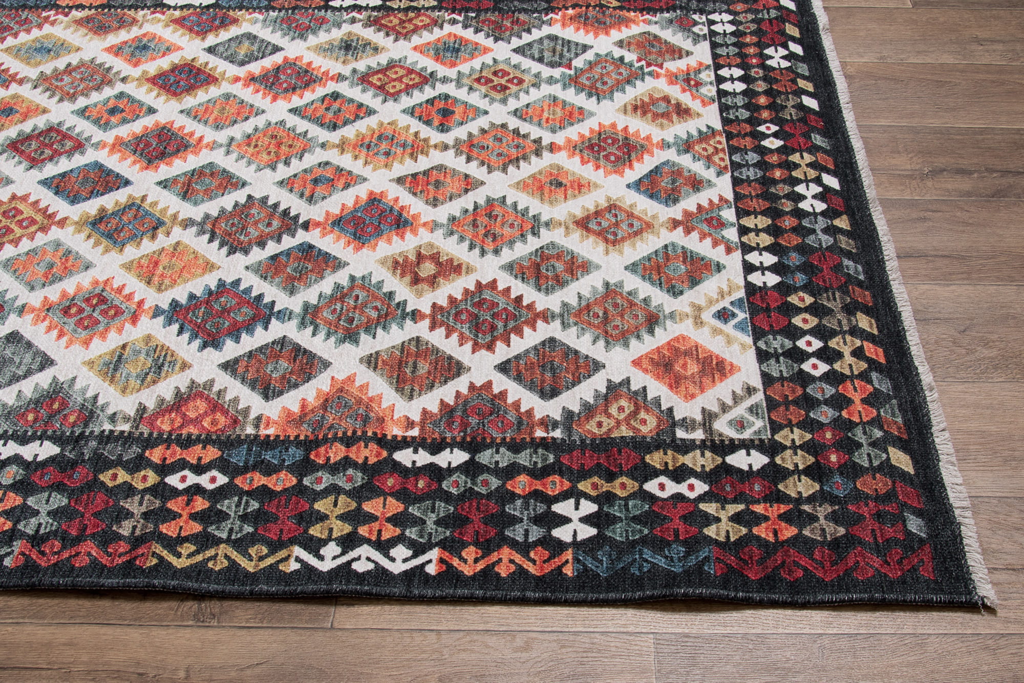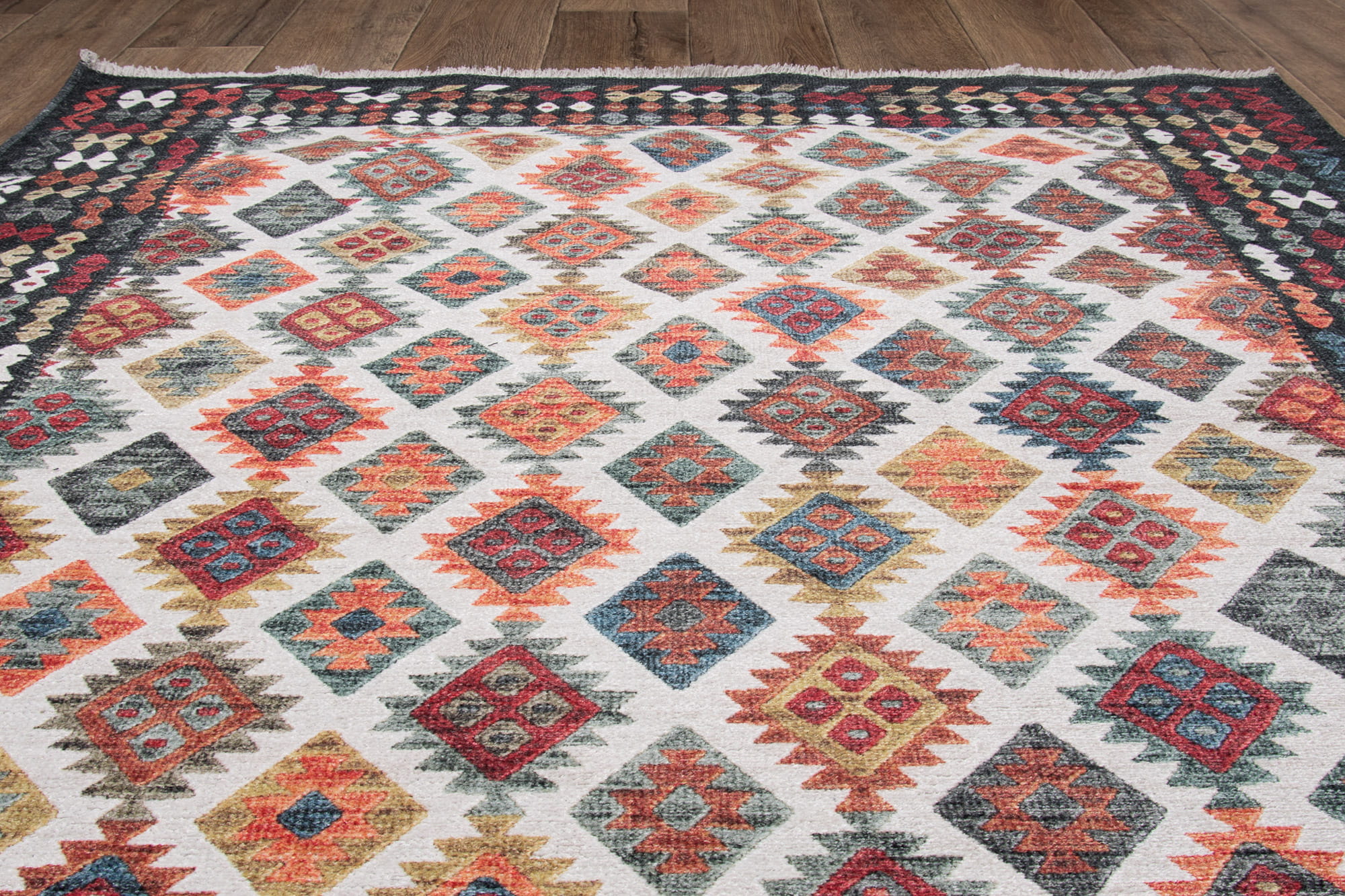 Pescara to tkany maszynowo, bawełniany dywan z dodatkiem poliestru. Łączy w sobie trwałość obu tych włókien. Kolorowy, etniczny wzór jest nadrukowany na krótkowłosym runie. Krótsze brzegi dywanu wykończone są delikatnymi frędzlami.
