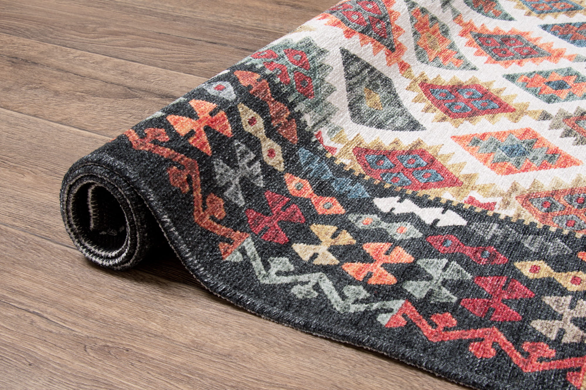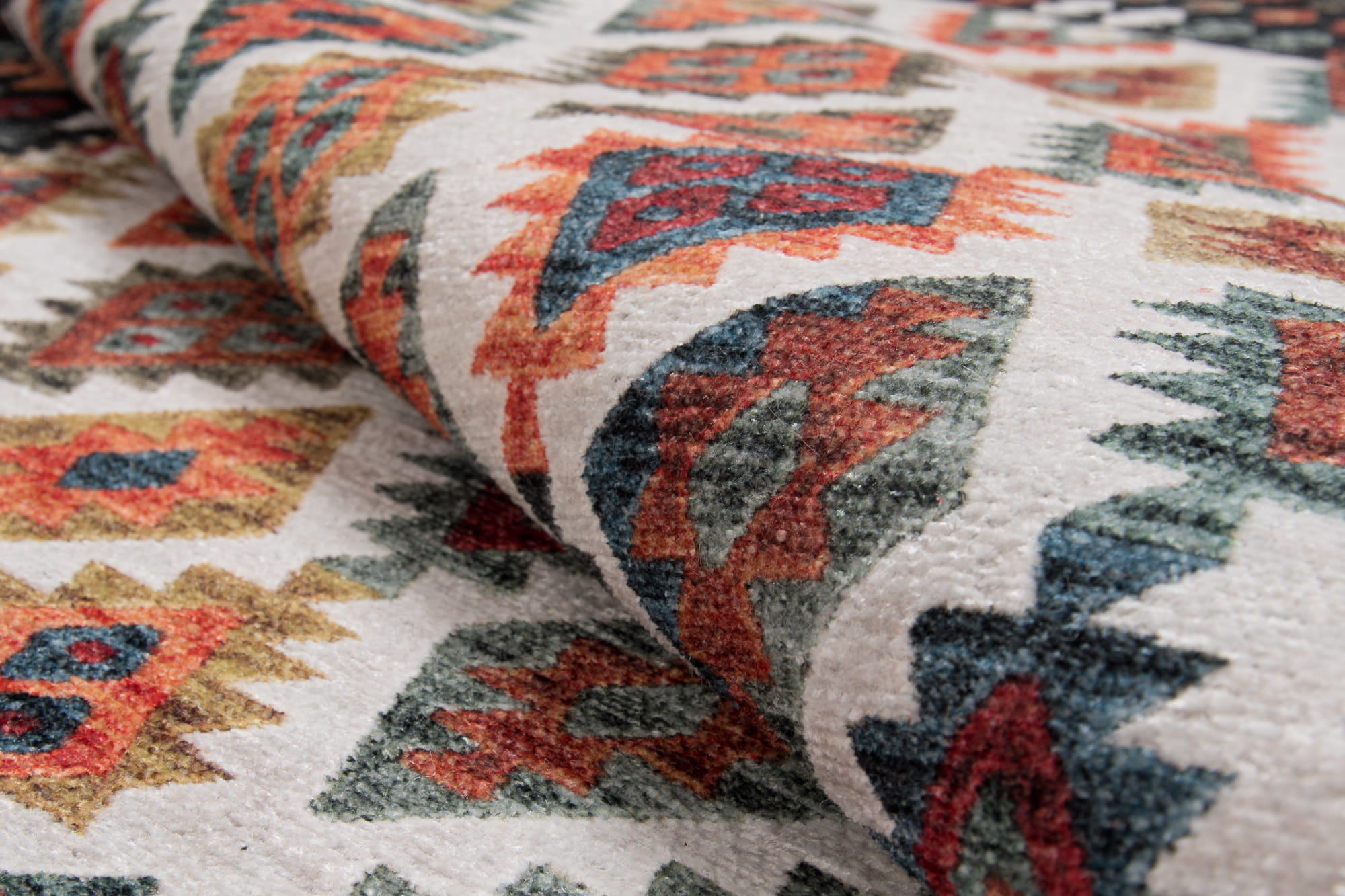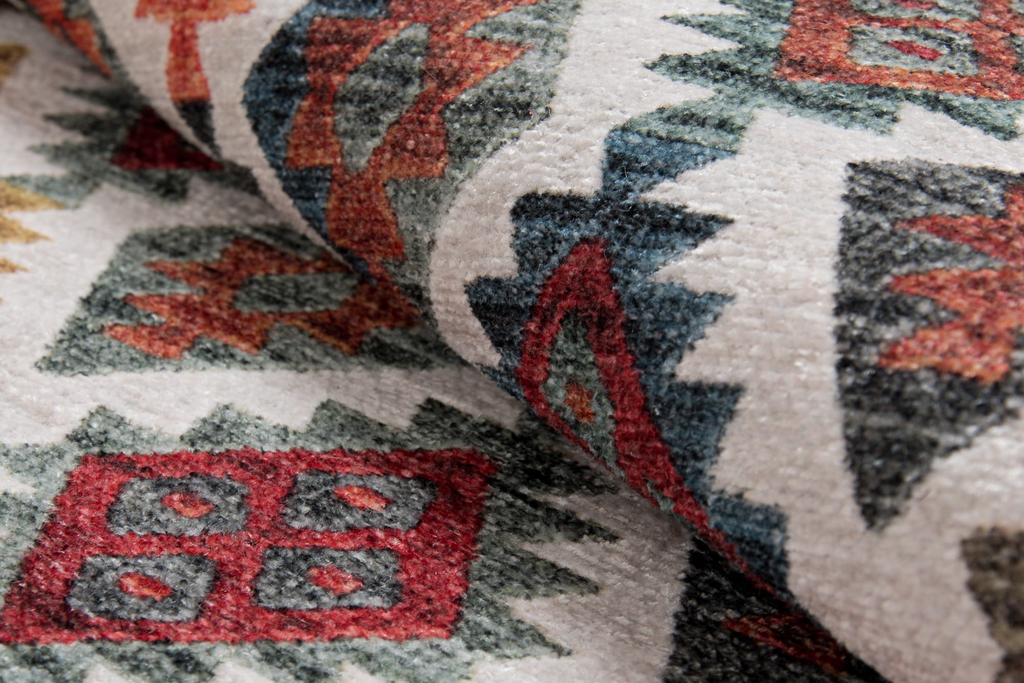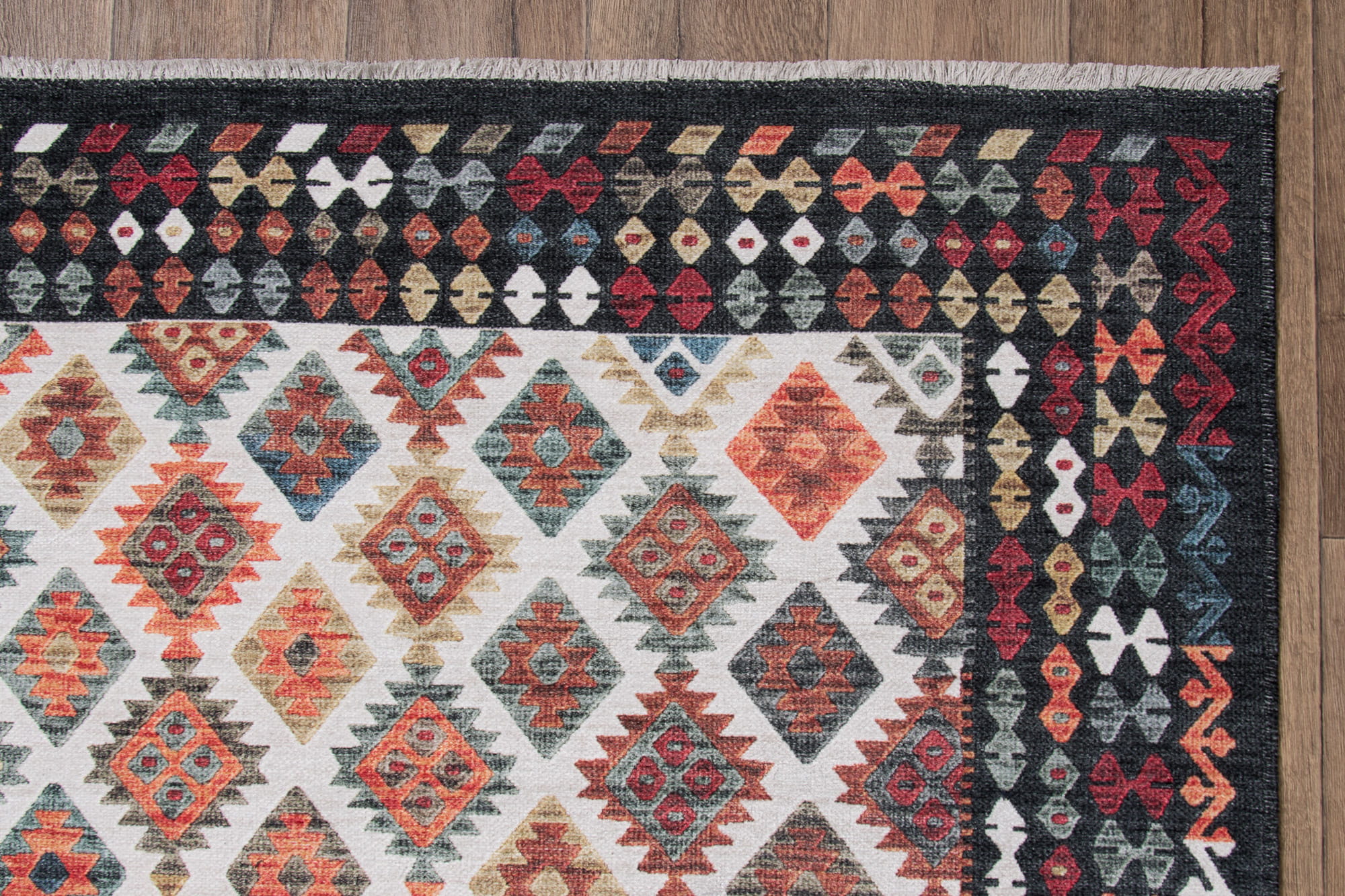 Pescara to tkany maszynowo, bawełniany dywan z dodatkiem poliestru. Łączy w sobie trwałość obu tych włókien. Kolorowy, etniczny wzór jest nadrukowany na krótkowłosym runie. Krótsze brzegi dywanu wykończone są delikatnymi frędzlami.