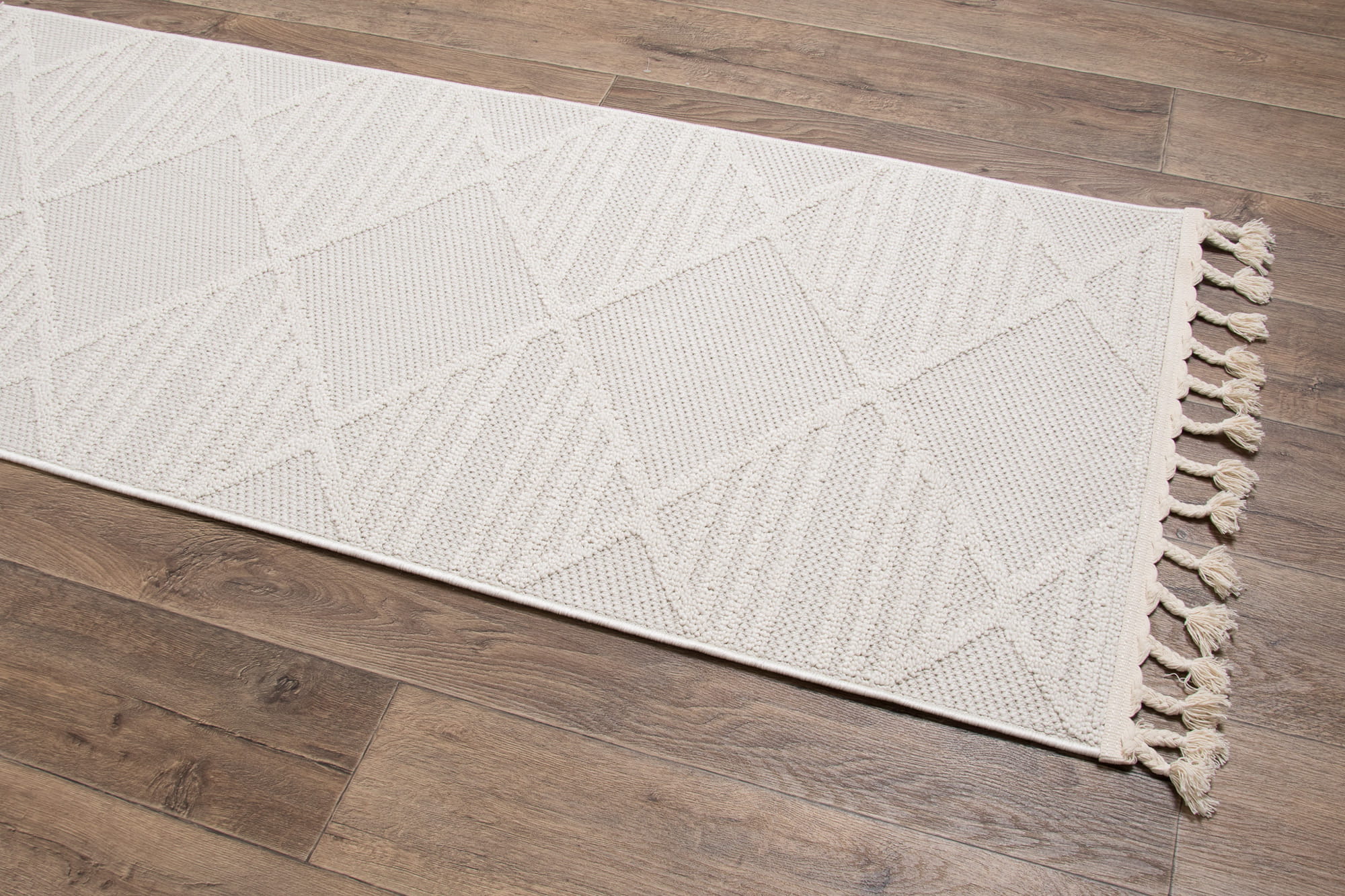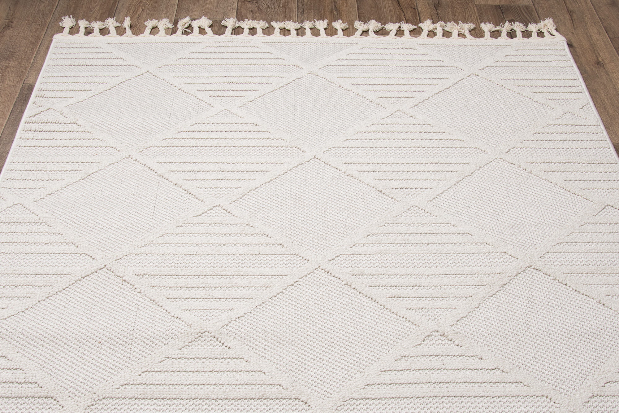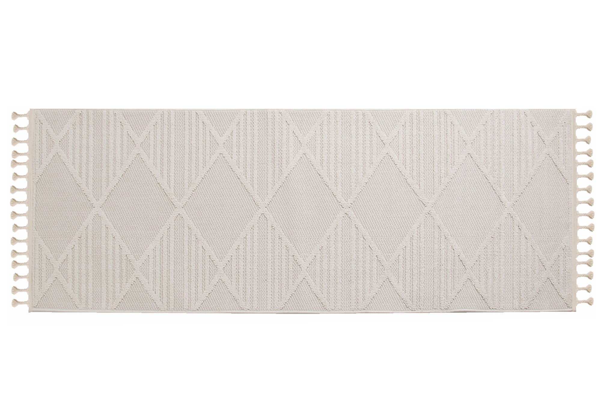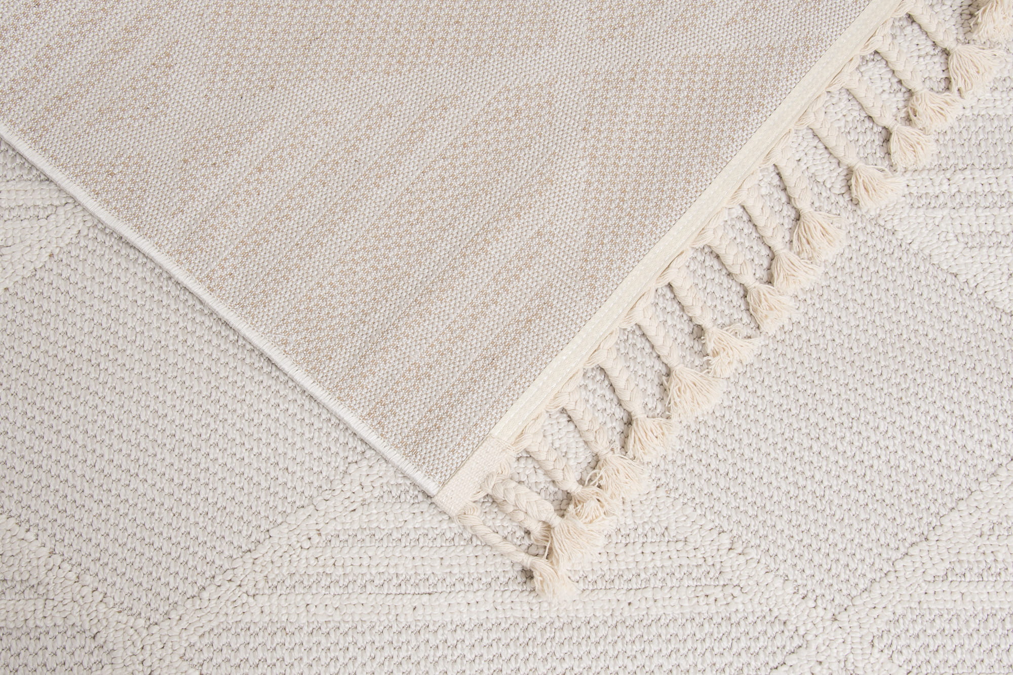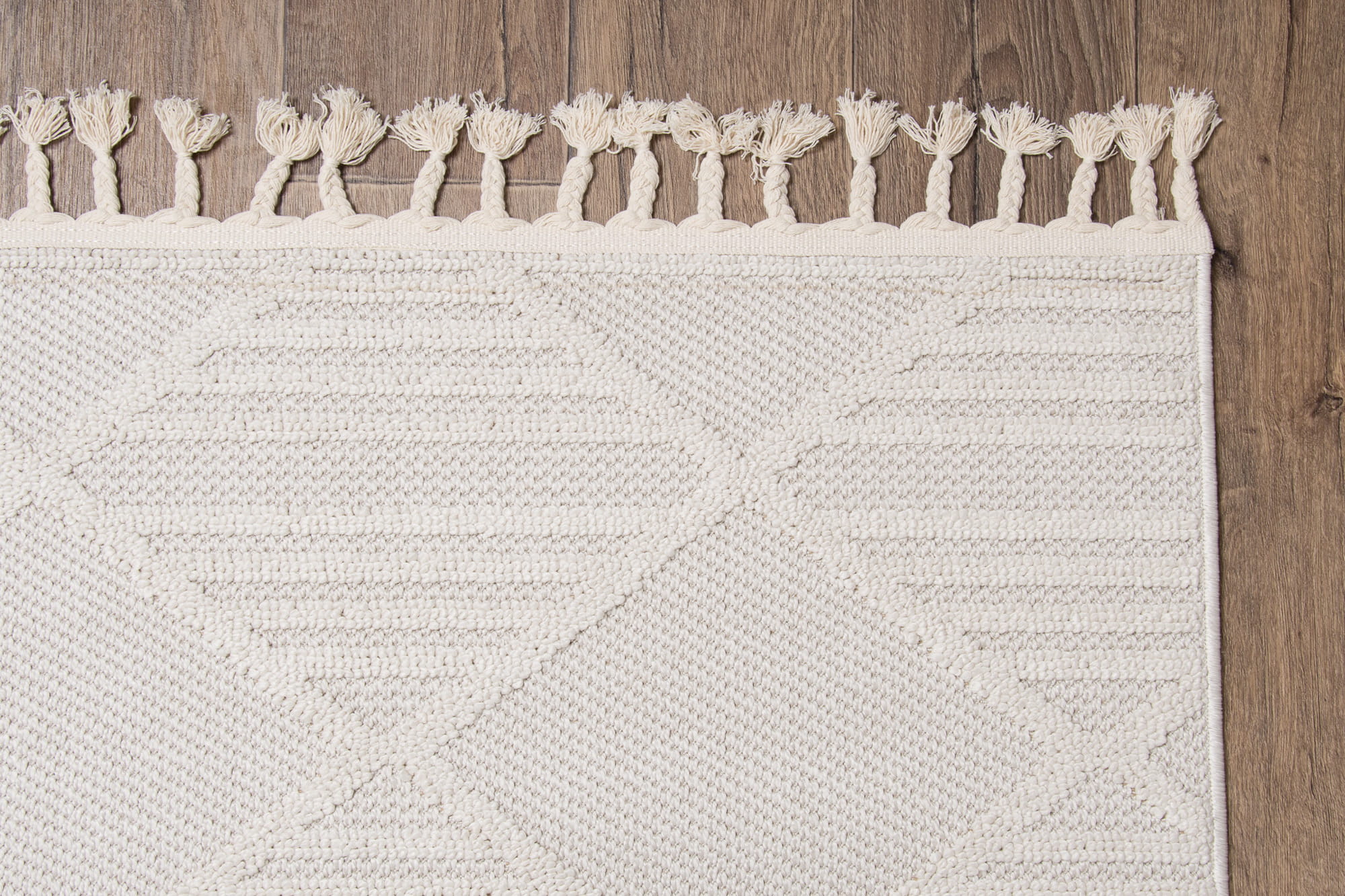 Nowoczesny, kremowy dywan z plecionymi frędzlami, w modnym stylu boho. Dzięki kombinacji włókien pętelkowych i płaskotkanych uzyskano na runie ciekawy, dwupoziomowy, geometryczny wzór 3d. Dywan jest komfortowy i przyjemny w dotyku.