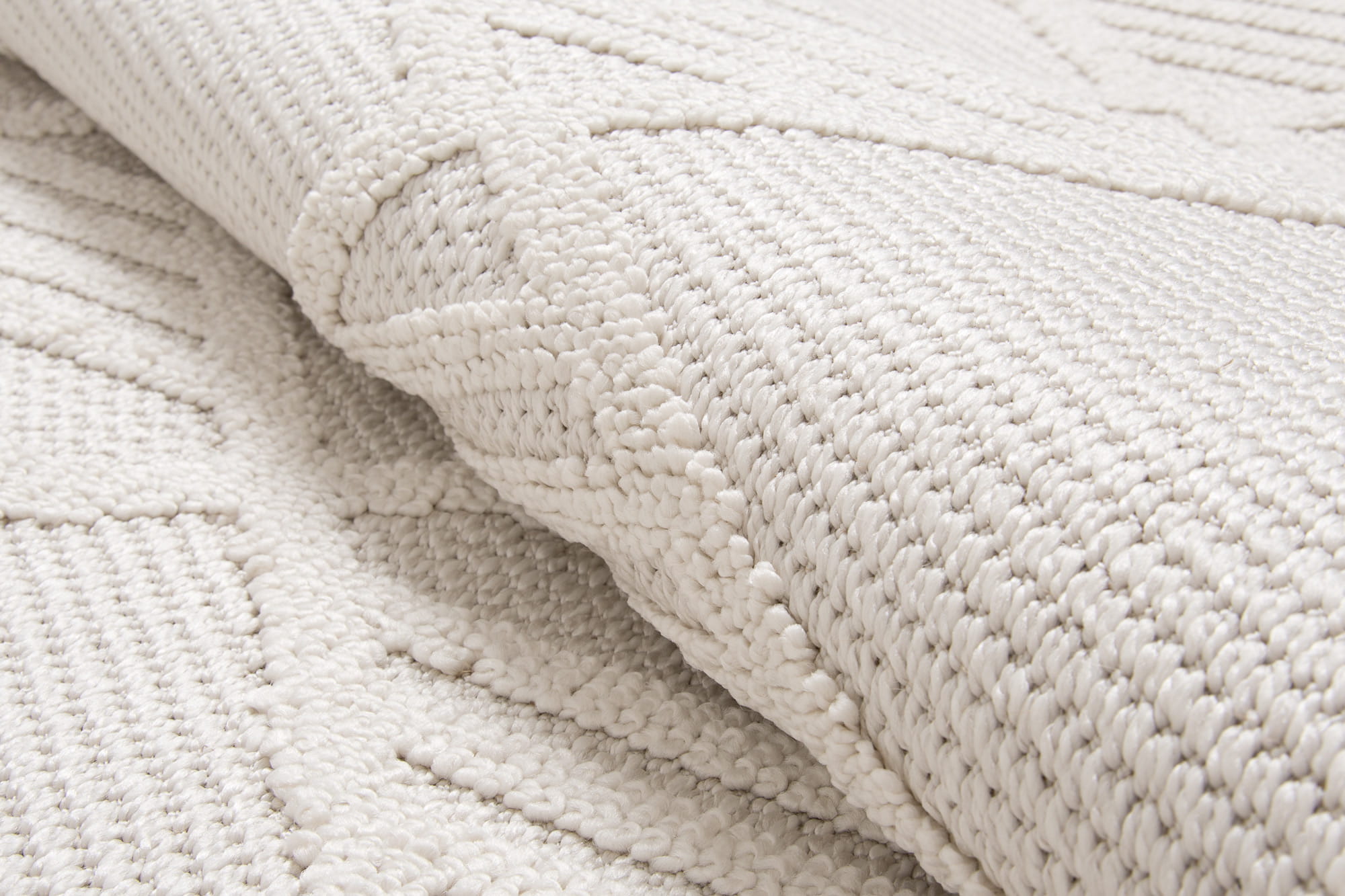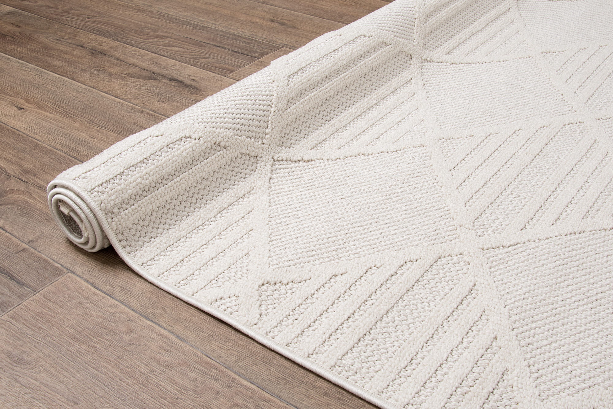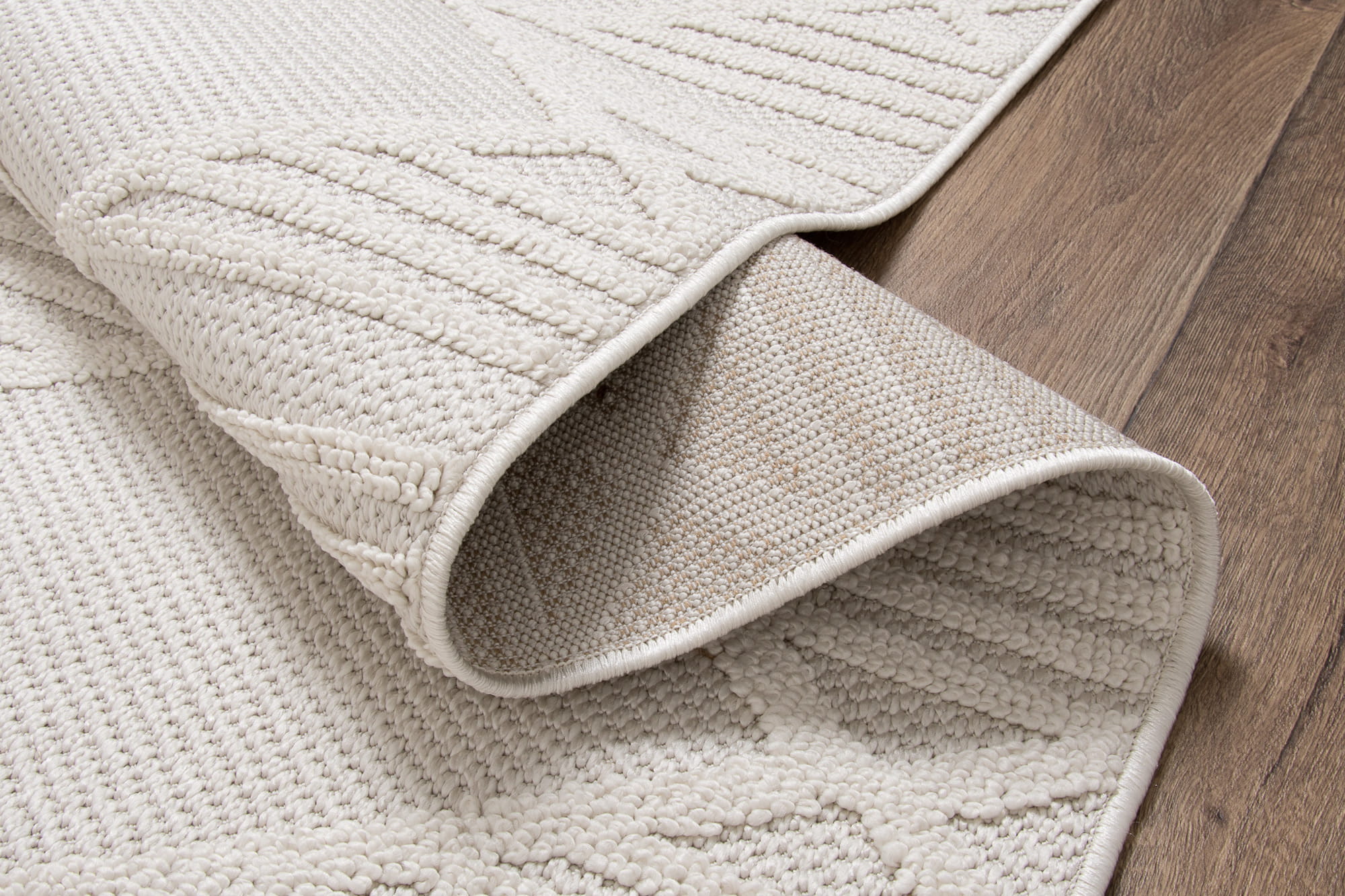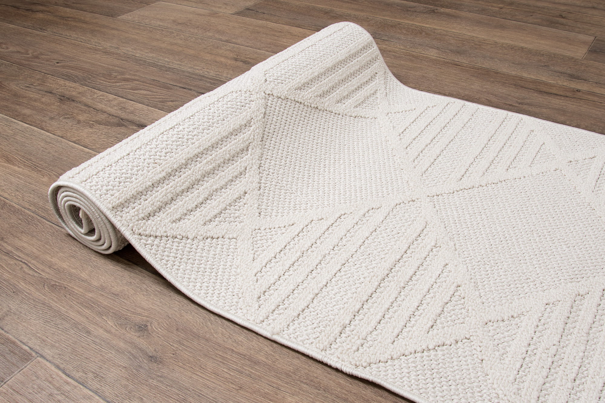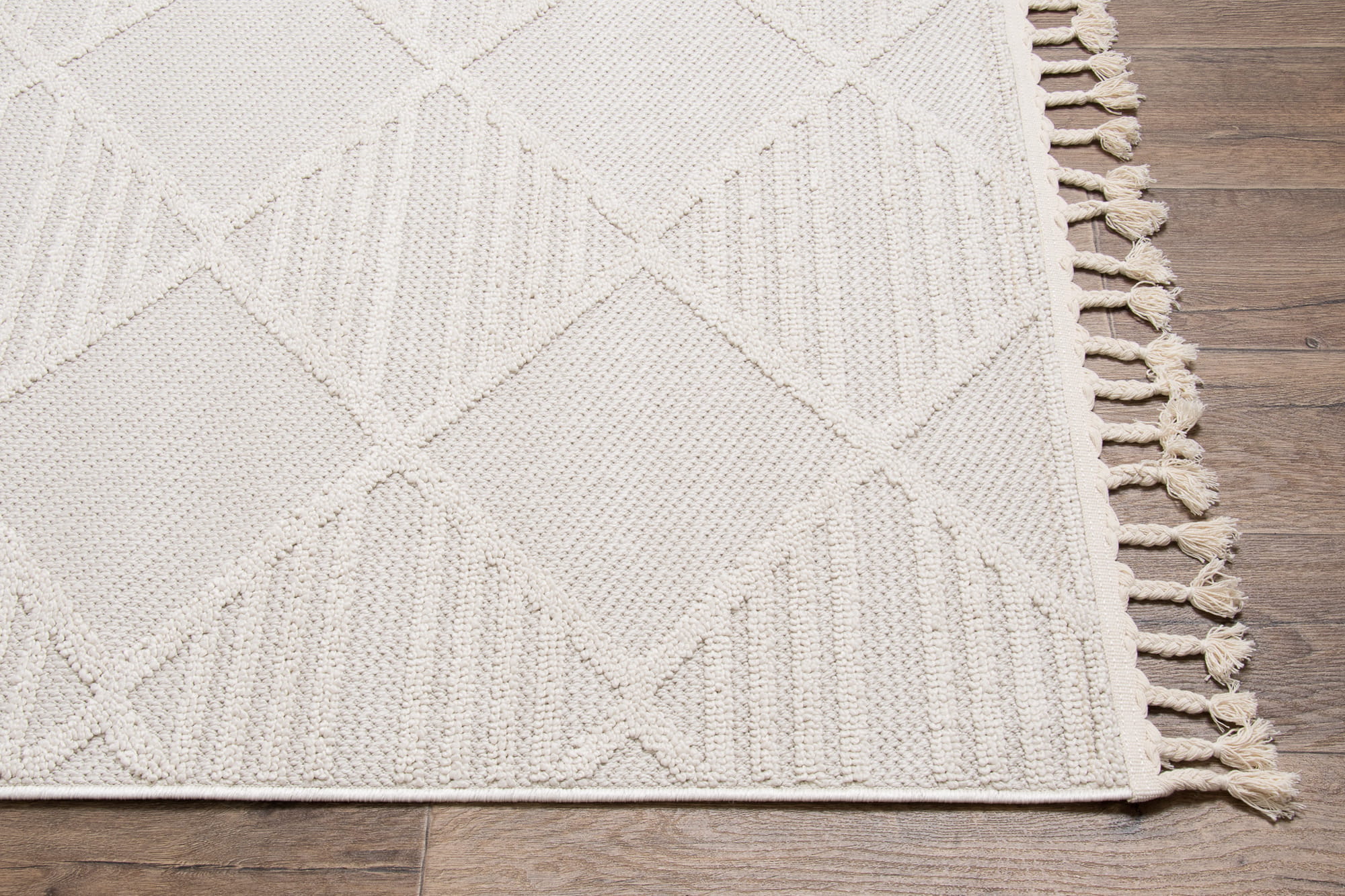 Nowoczesny, kremowy dywan z plecionymi frędzlami, w modnym stylu boho. Dzięki kombinacji włókien pętelkowych i płaskotkanych uzyskano na runie ciekawy, dwupoziomowy, geometryczny wzór 3d. Dywan jest komfortowy i przyjemny w dotyku.