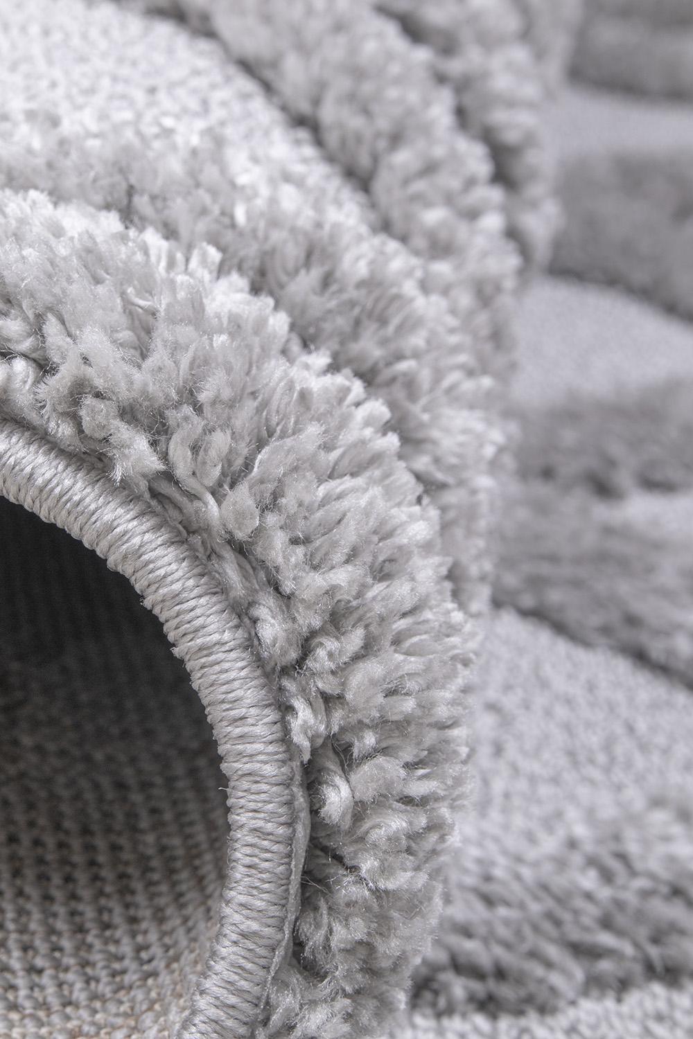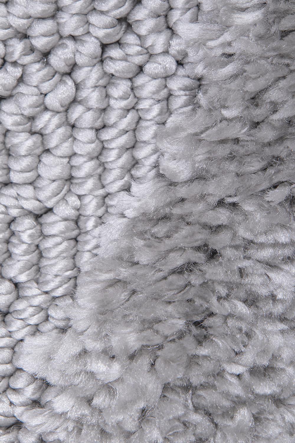 Dywan w szarym kolorze, wykonany z miękkiego poliestru. Wzór geometryczny z kombinacją ciętych i pętelkowych włókien, tworzących na dywanie strukturę 3d. Wykończony frędzlami w stylu boho.