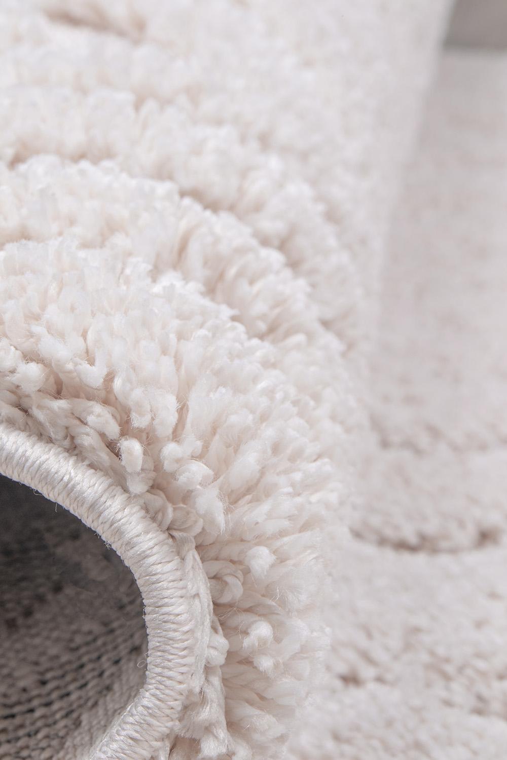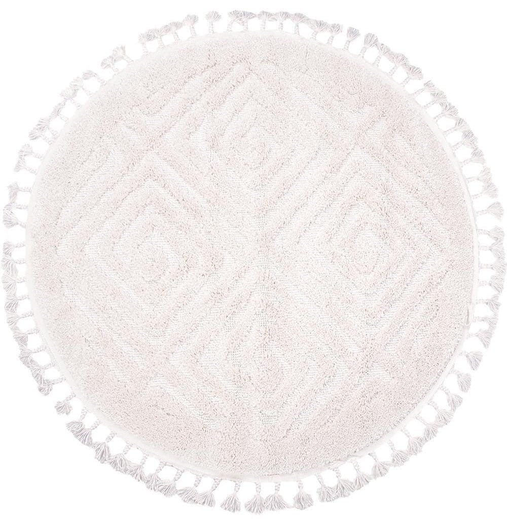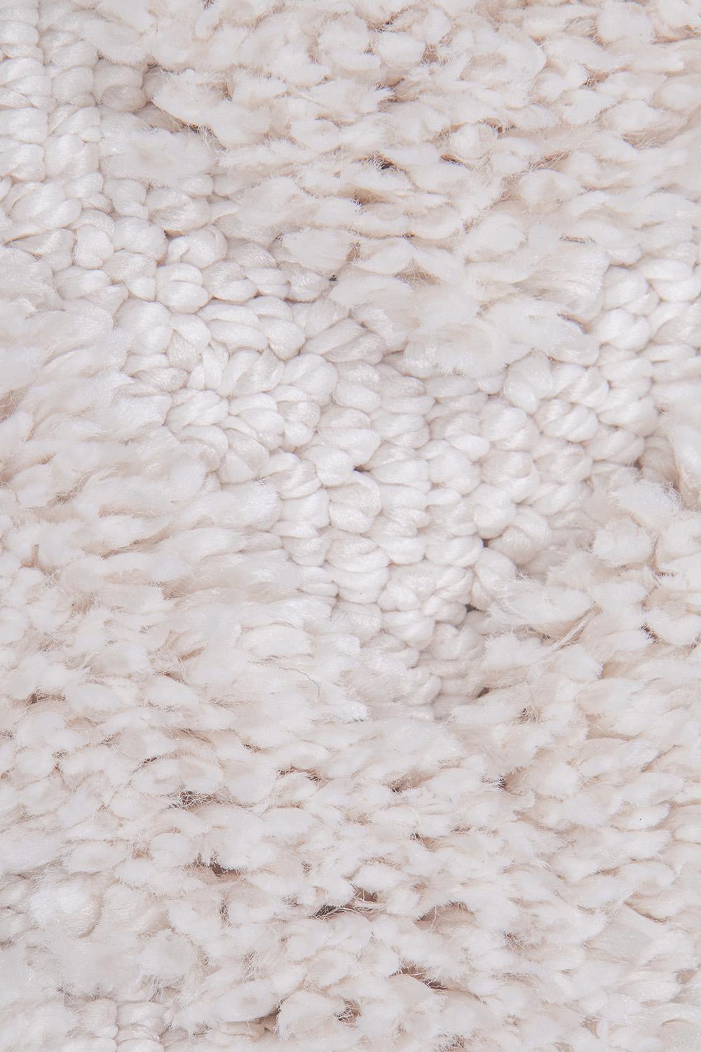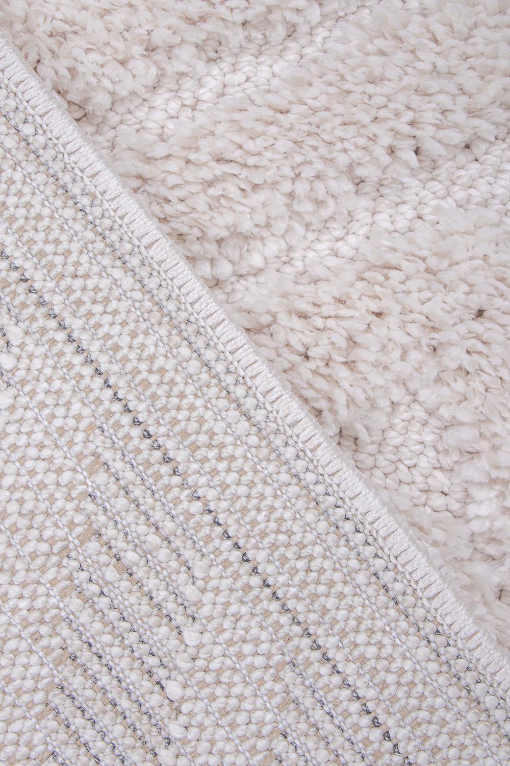 Dywan w kremowym kolorze, wykonany z miękkiego poliestru. Wzór geometryczny z kombinacją ciętych i pętelkowych włókien, tworzących na dywanie strukturę 3d. Wykończony frędzlami w stylu boho.