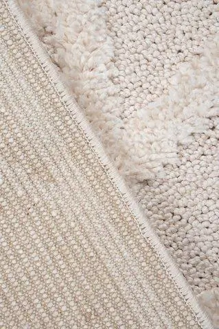 Dywan w kremowym kolorze, wykonany z miękkiego poliestru. Wzór geometryczny z kombinacją ciętych i pętelkowych włókien, tworzących na dywanie strukturę 3d. Frędzle w stylu boho.