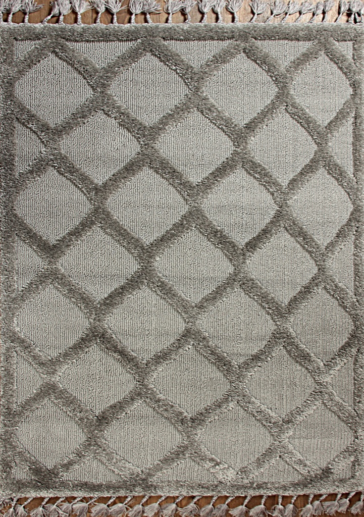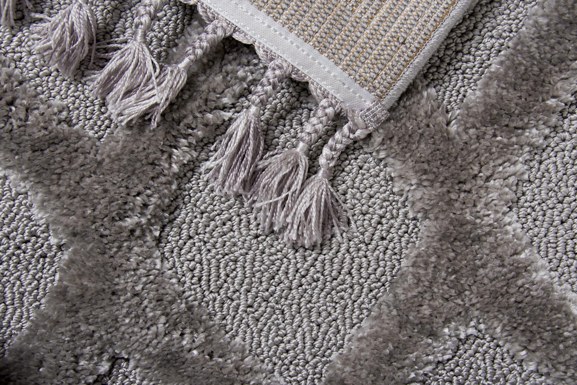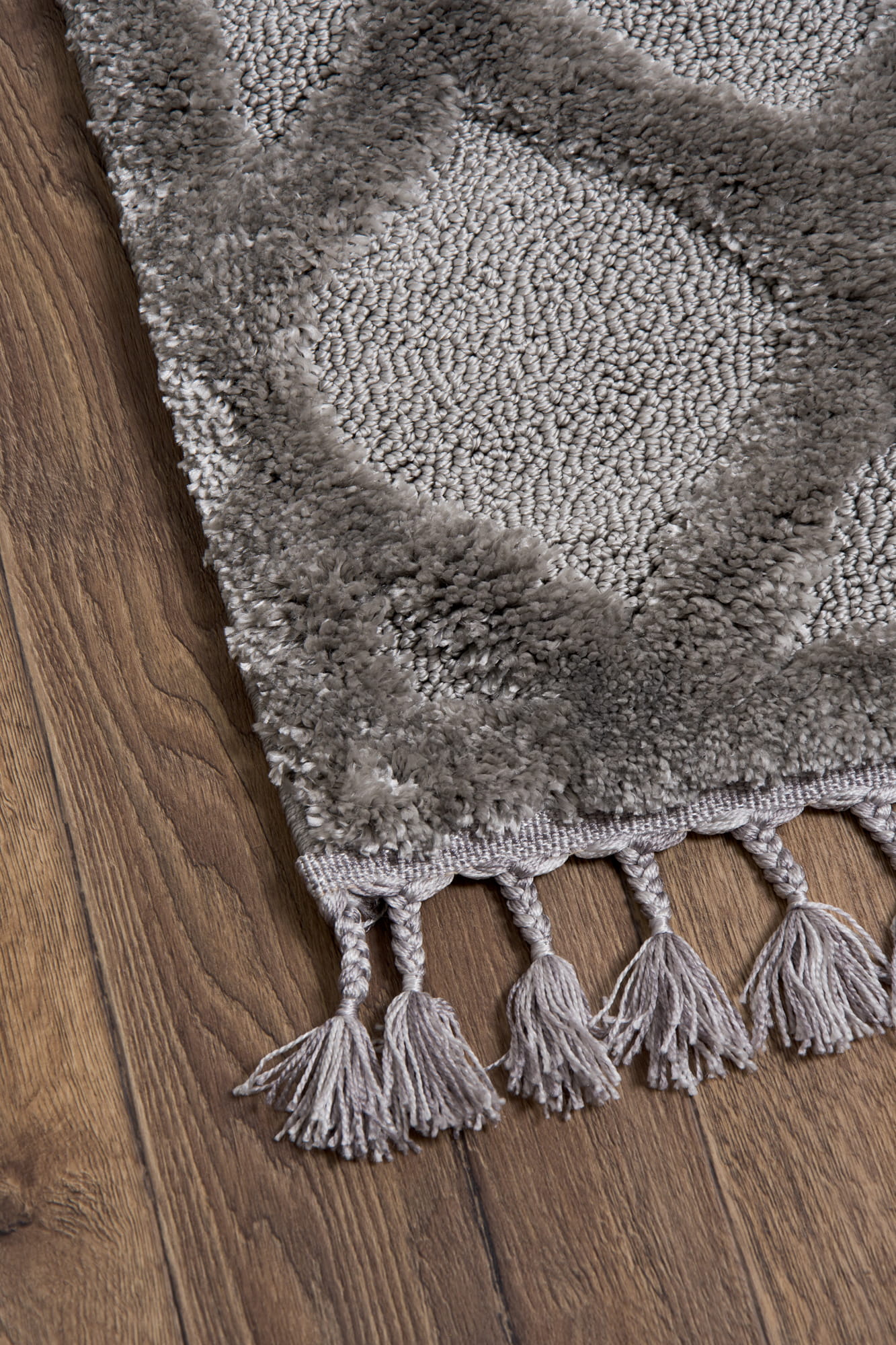 Dywan wykonany z miękkiego poliestru. Wzór geometryczny z kombinacją ciętych i pętelkowych włókien, tworzących na dywanie strukturę 3d. Frędzle w stylu boho.