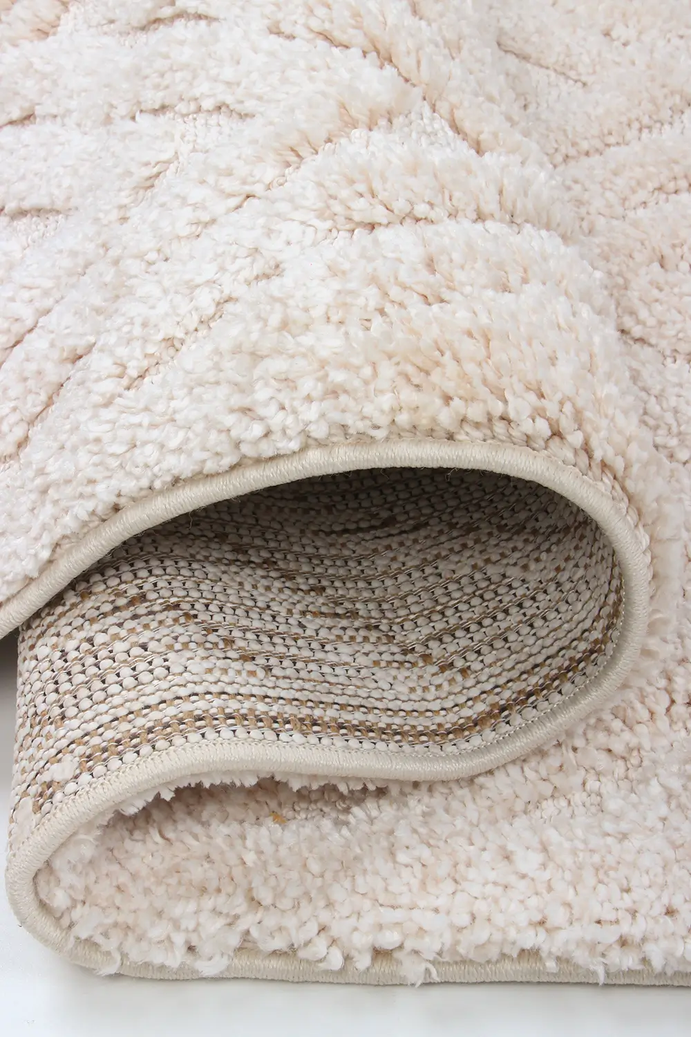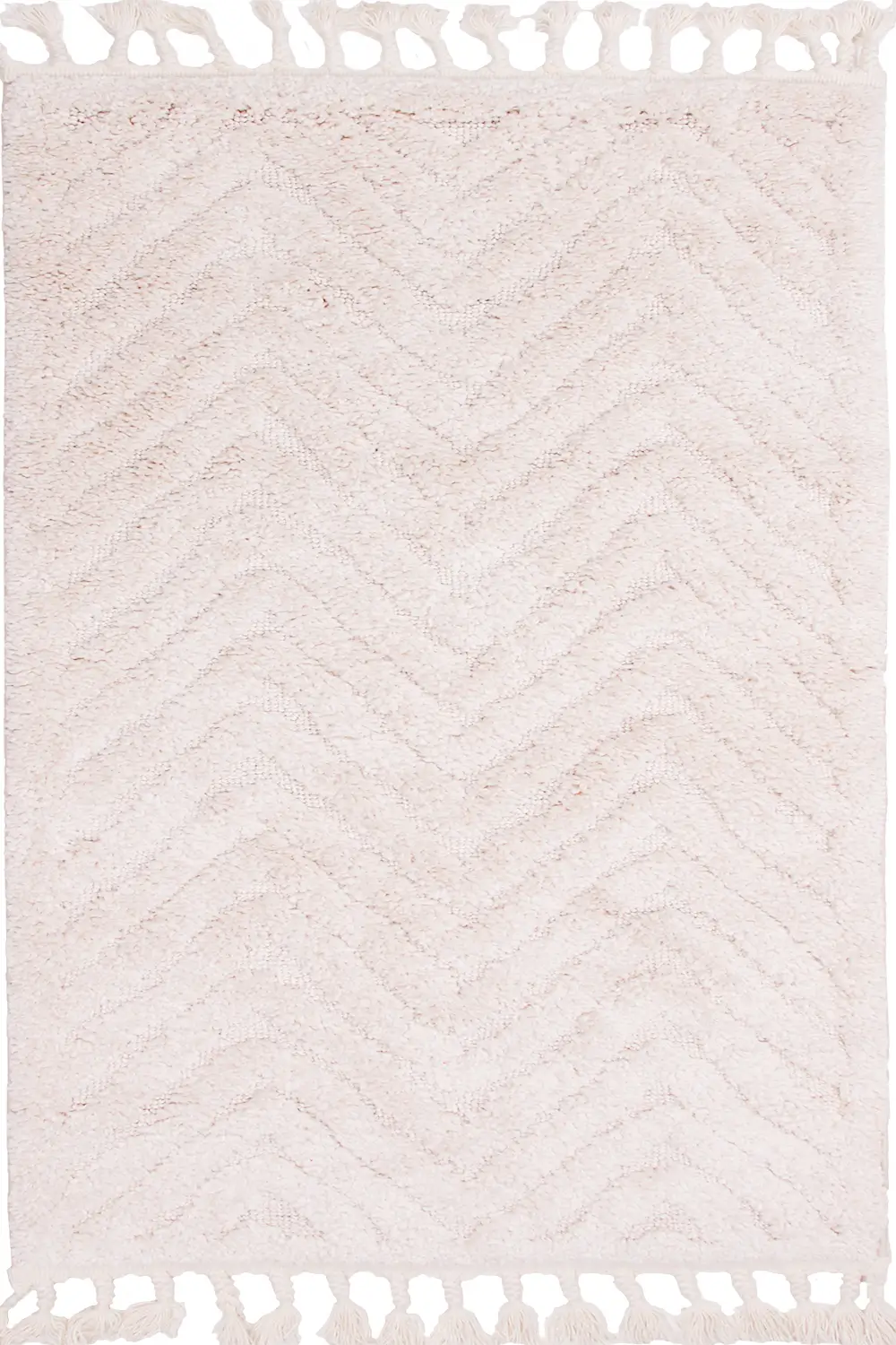 Dywan w kremowym kolorze, wykonany z miękkiego poliestru. Wzór geometryczny z kombinacją ciętych i pętelkowych włókien, tworzących na dywanie strukturę 3d. Frędzle w stylu boho.