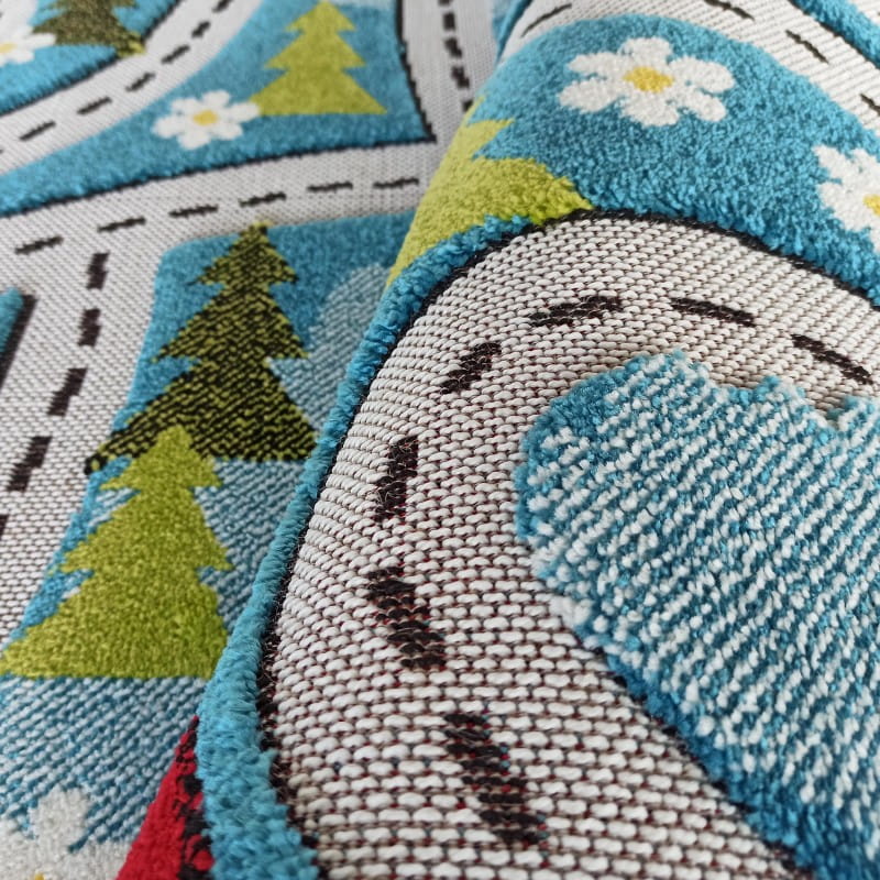 Dywan ten pełni funkcję edukacyjną, a nauka przez zabawę to najprzyjemniejszy sposób do poznawania przez dziecko otaczającego go świata. Dzięki runie o dwóch różnych wysokościach, zapewnimy maluchowi stymulujące doznania sensoryczne podczas zabawy, a motyw uliczek dodatkowo pobudza wyobraźnię dziecka.