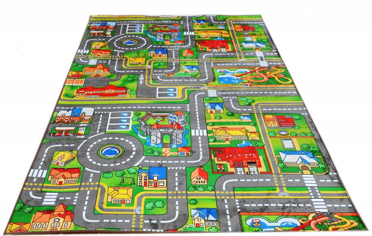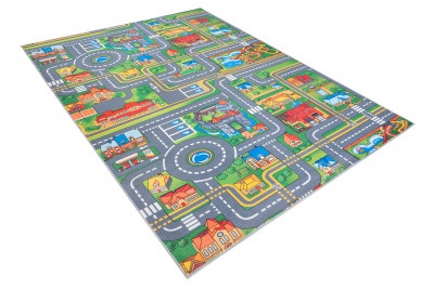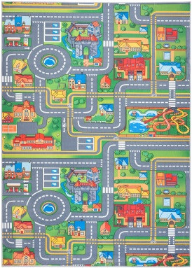 Dywan dziecięcy ze wzorem miasta, pełen dróg, uliczek, budynków zapewnia kreatywną zabawę i naukę. Wykonany z trwałego, miękkiego materiału, jest bezpieczny i idealny do rozwijania wyobraźni oraz umiejętności motorycznych.
