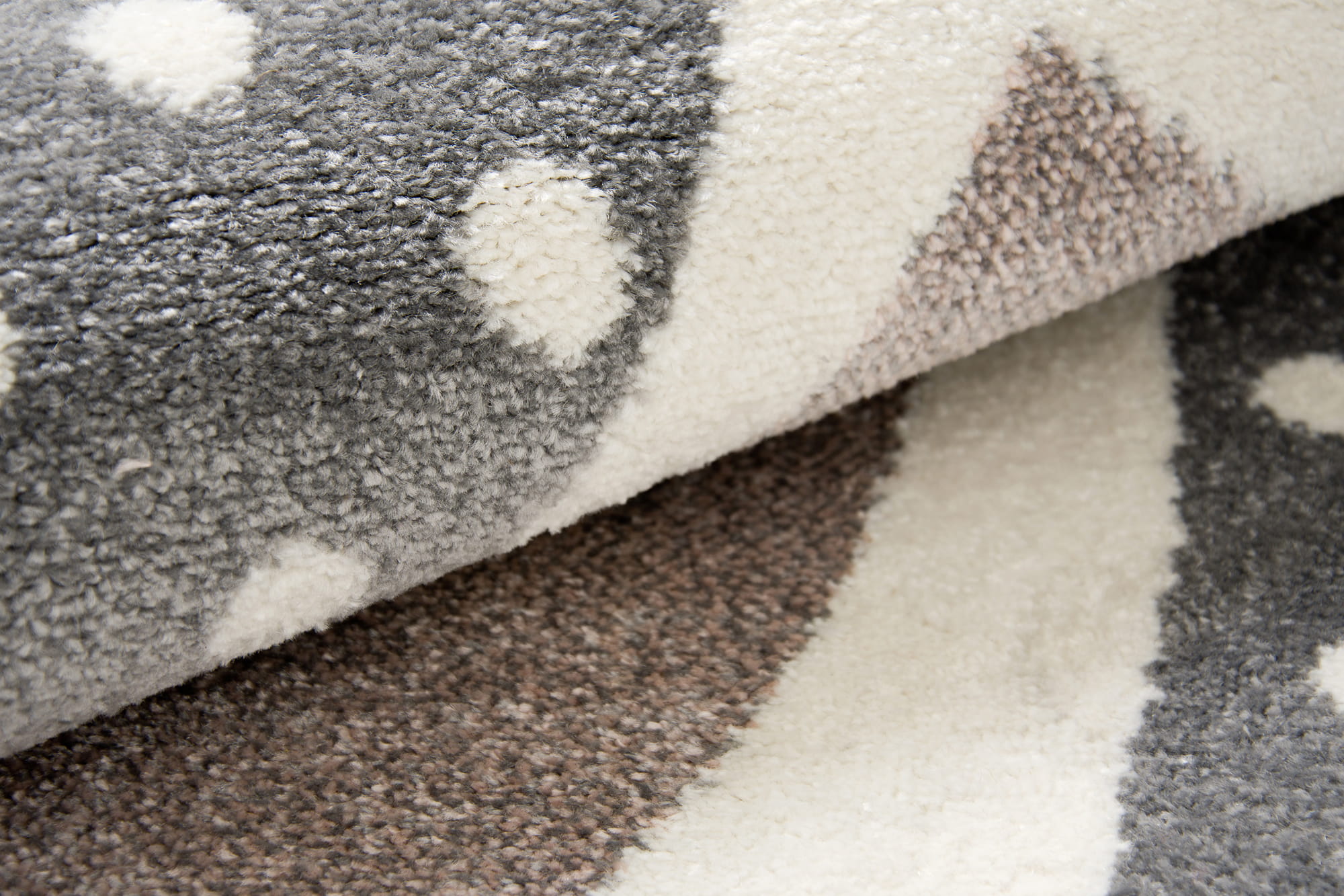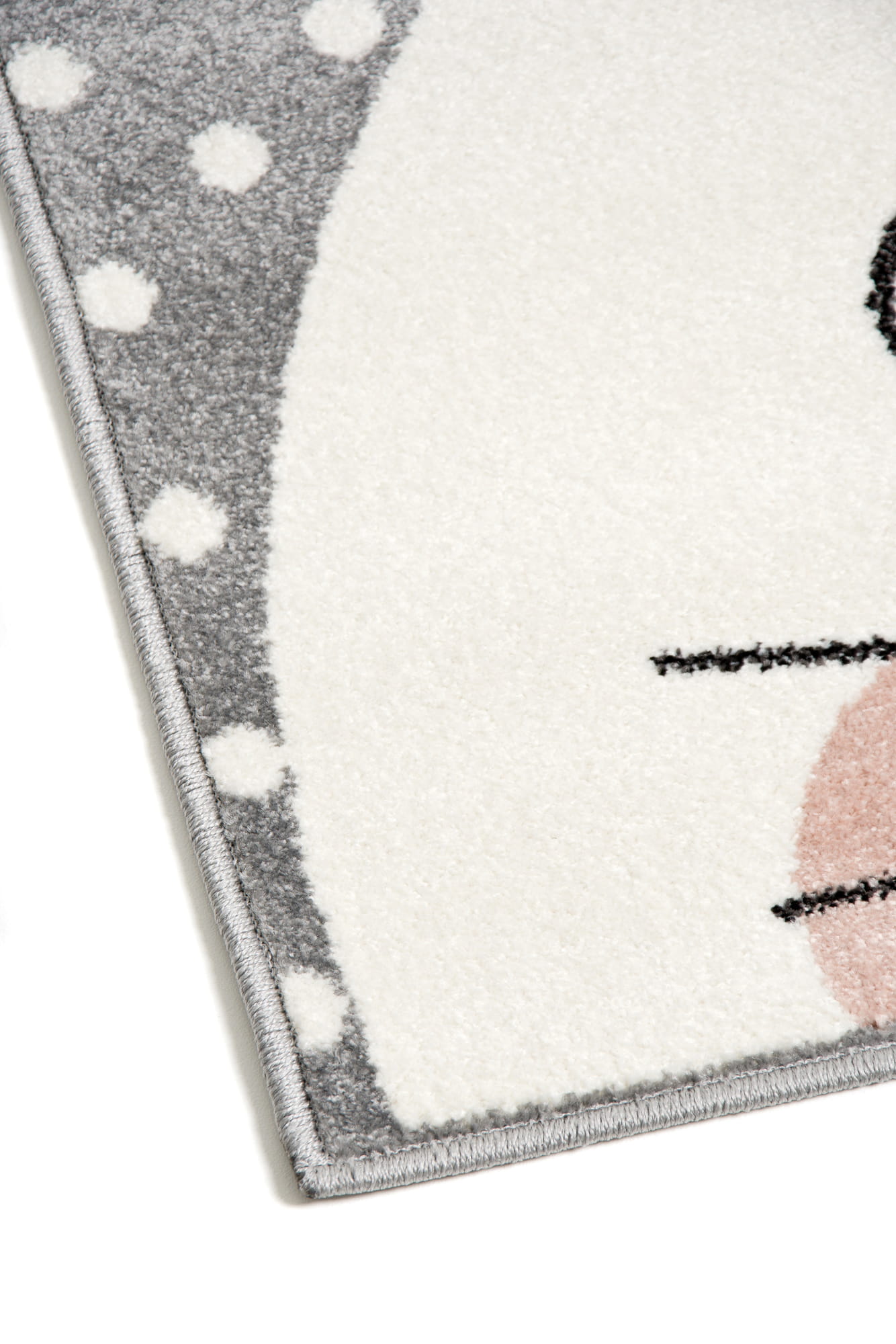 Dywan dziecięcy z motywem ciekawskiego królika na szarym tle ozdobionym białymi kropkami. Posiada sprężyste, miękkie w dotyku runo, które zapewnia komfort podczas zabawy. Charakteryzuje się trwałymi kolorami oraz wysoką odpornością na ścieranie, co czyni go idealnym dodatkiem do pokoju najmłodszych.