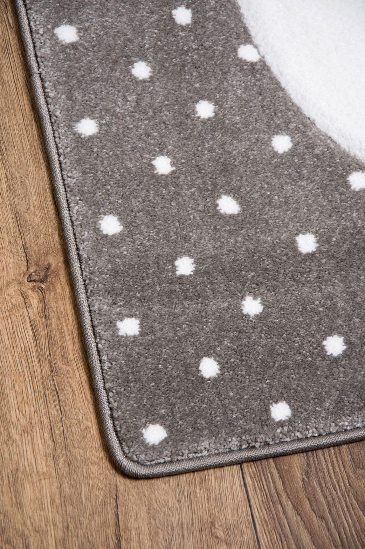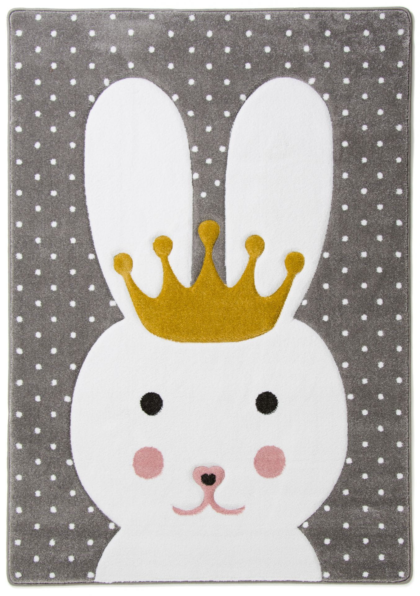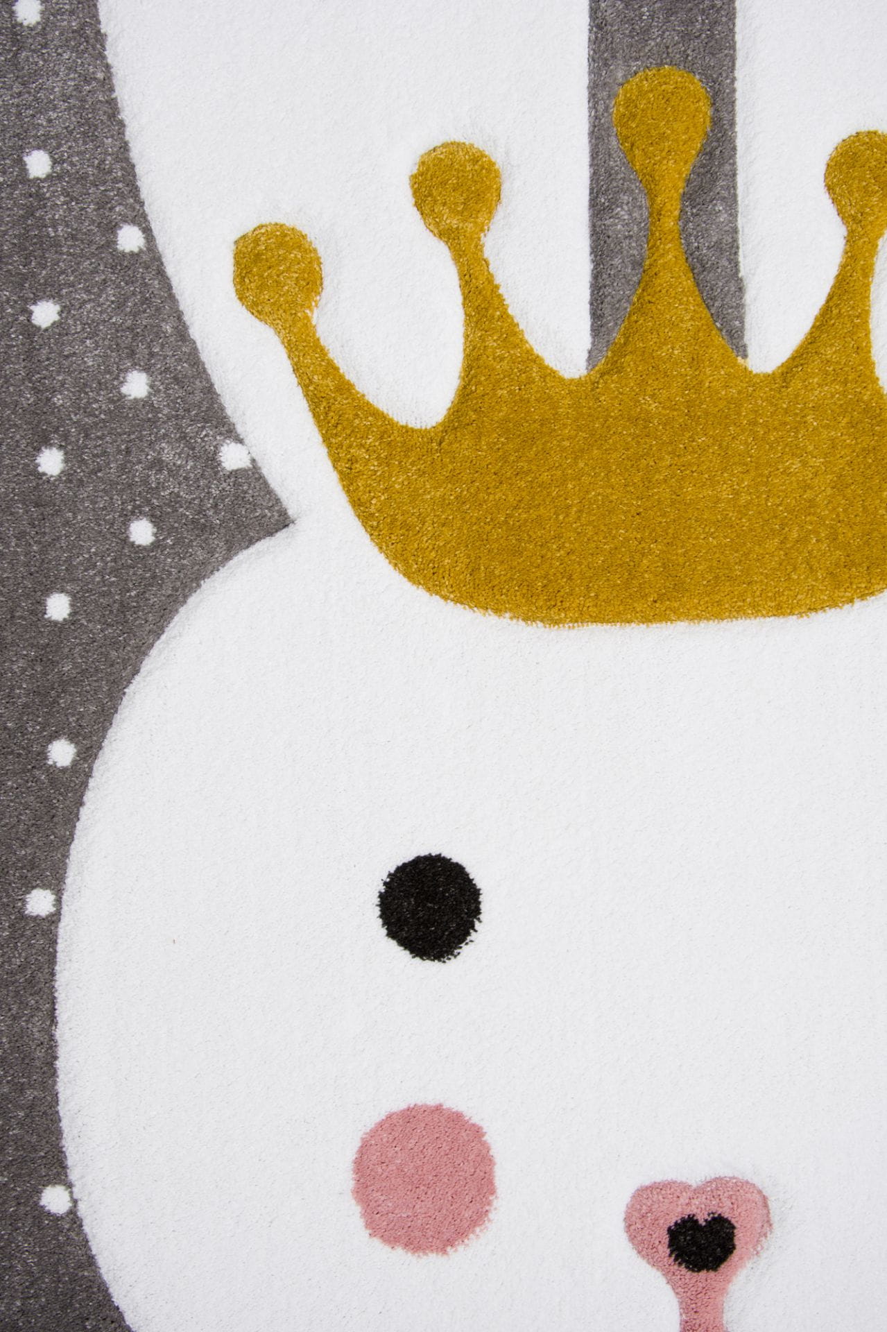 Ten dywan posiada prześliczny motyw białego króliczka z koroną na szarym tle w białe kropeczki. Trójwymiarowy wzór osiągnięty przez wycinany relief sprawią, że te dywaniki będą przyjemną i wdzięczną dekoracją dziecięcego pokoju.